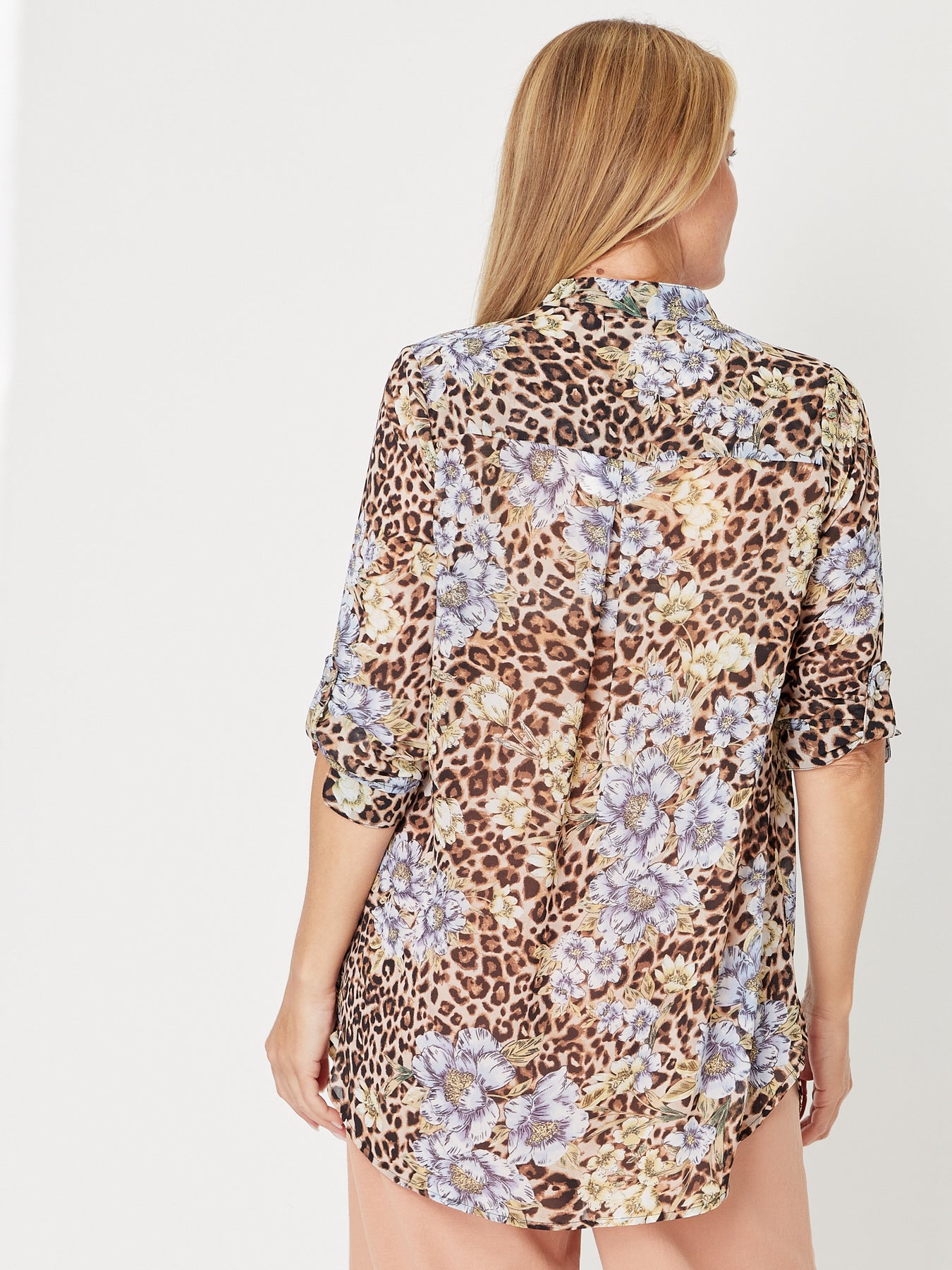 Say hello to your new favorite shirt! This chiffon animal print number brings just the right amount of fun to your closet. The classic collar keeps things sophisticated while the roll-up sleeves let you show off your playful side—cuff them up whenever the mood strikes. That curved hemline? It's designed to flatter and move with you, whether you're dressing it up or keeping it casual. Lightweight and breezy, this chiffon beauty is ready for whatever adventure comes your way. Mix, match, and make it your own—this shirt is game for anything.