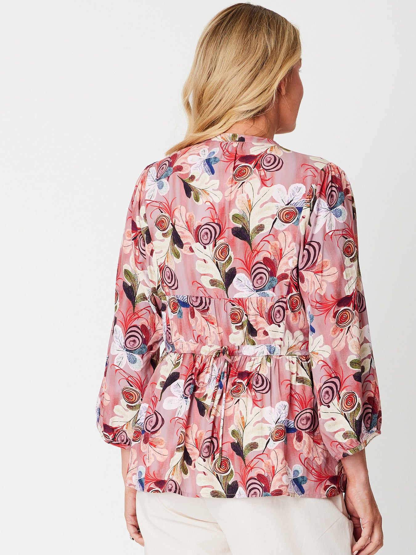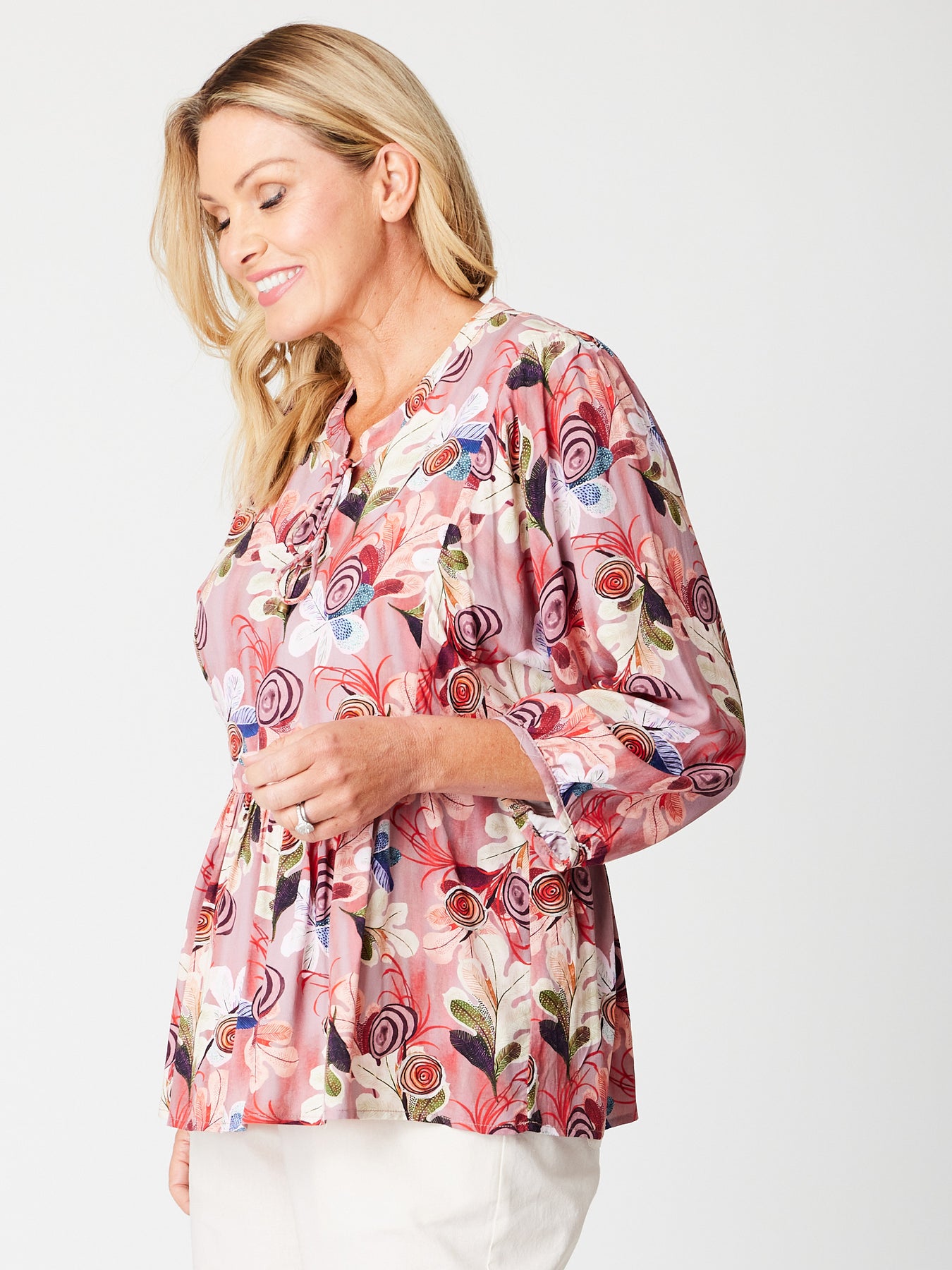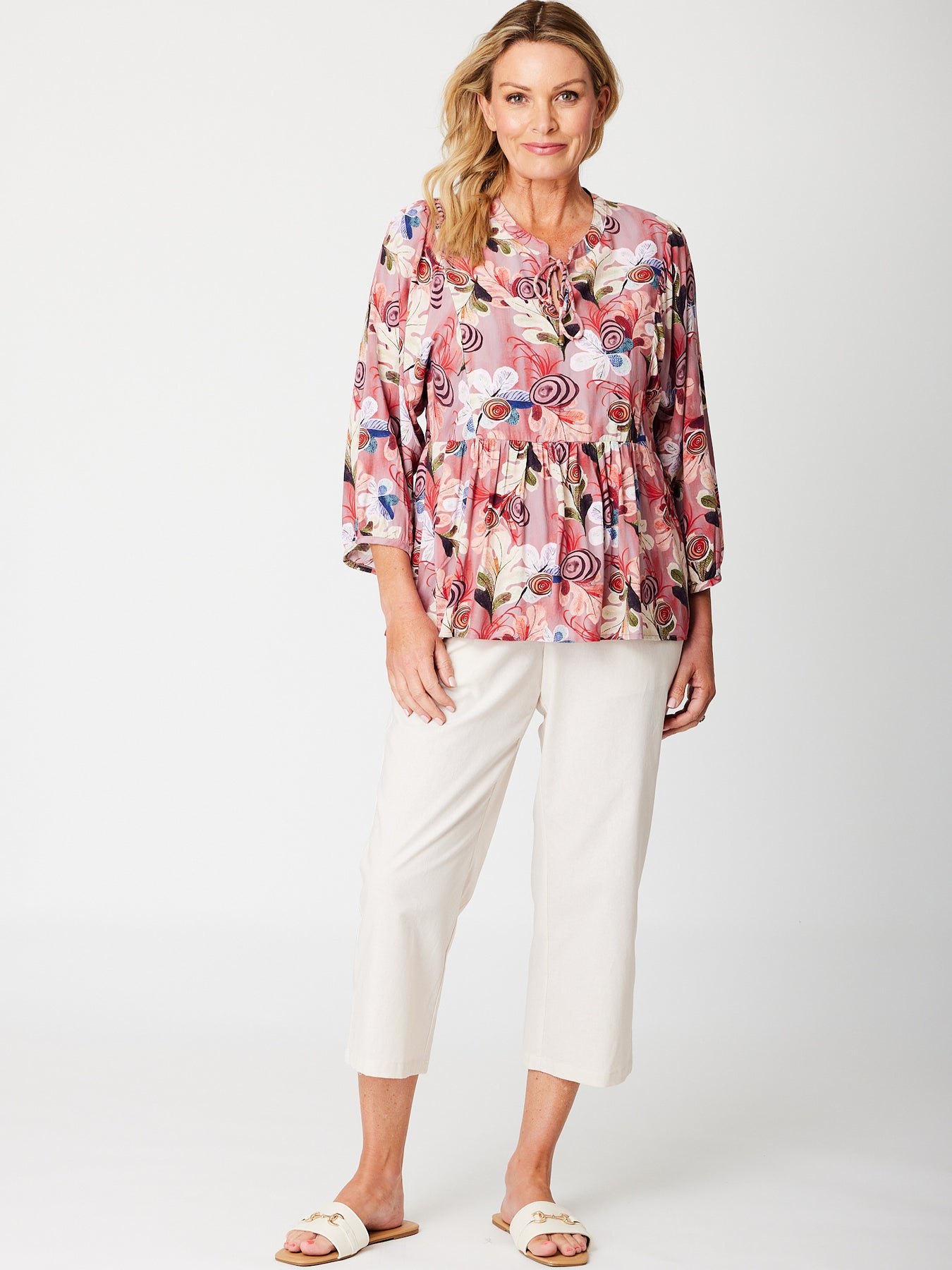 Discover effortless elegance with this stunning rayon top, featuring a flattering baby doll silhouette that skims beautifully over your frame. The soft, relaxed balloon sleeves add a touch of romantic charm, while the charming V-neckline with tie detail creates an instantly polished look. Crafted from lovely cool rayon, this piece is perfect for warm weather styling—dress it up for brunch or down for casual weekend wear. The Bombay Beauty print adds character and visual interest, making it a versatile wardrobe essential that transitions seamlessly from day to night.