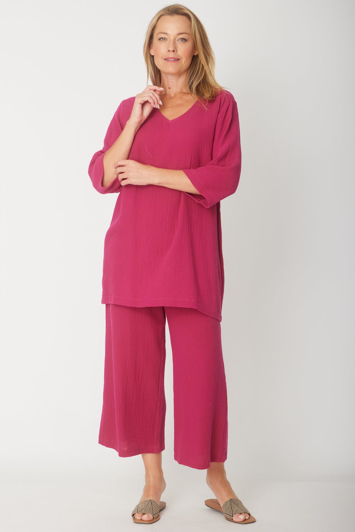 Experience ultimate comfort and effortless style with our Bonded Muslin/Cheesecloth Pant. These 3/4 length, wide-leg pants feature a pull-on design with an elasticated waist that fits true to your size, ensuring a perfect silhouette. Crafted from breathable bonded cotton, they keep you cool and comfortable all day long. Ideal for casual wear or relaxed outings, these pants combine softness and style for a must-have addition to your wardrobe. Check our size guide to find your perfect fit by waist measurement. Team with the Tarin top or other bonded cotton styles on our site.