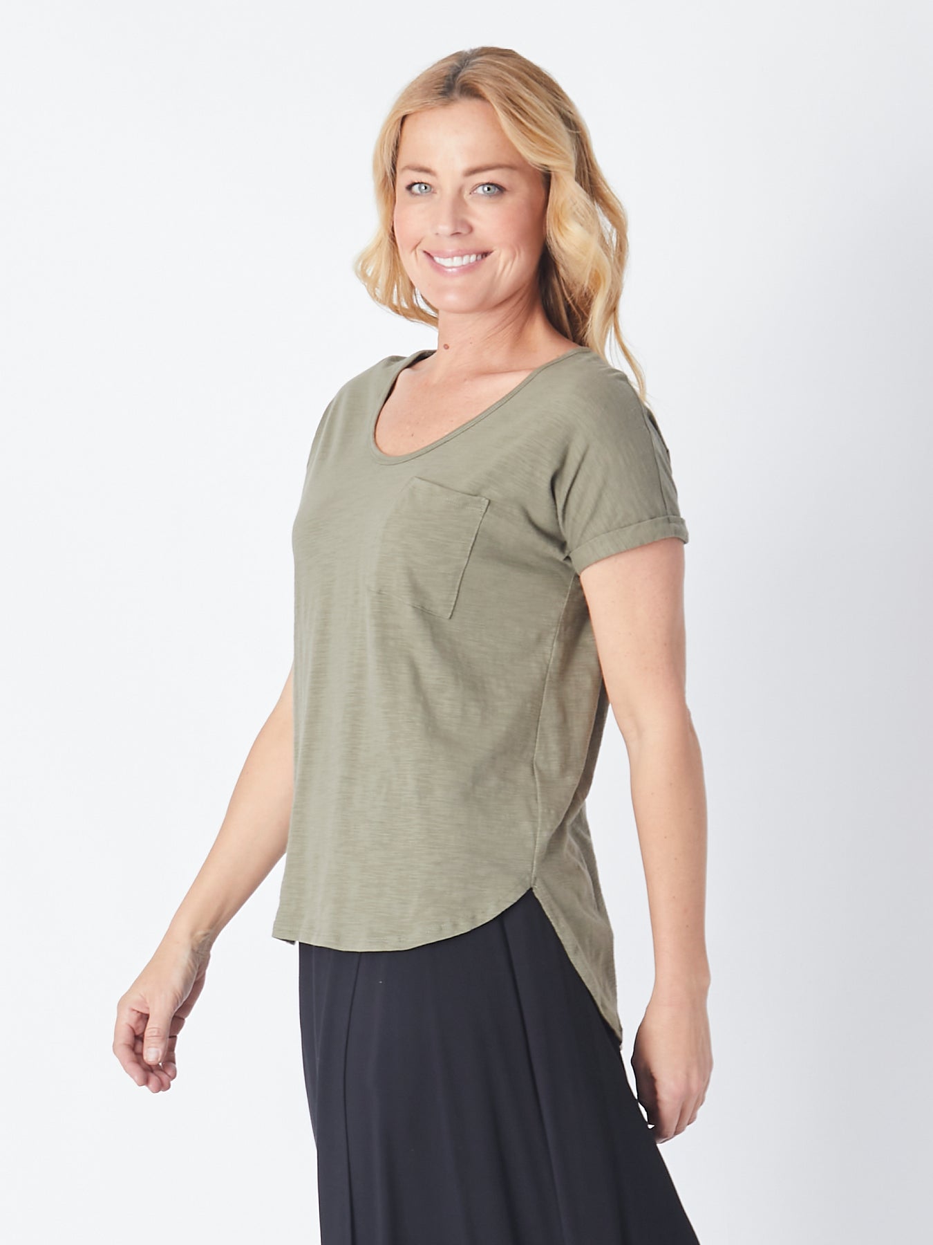 Add the most timeless touch to any look with this forever effortless Cotton Blend Pocket Tee. Featured in a relaxed fit with pocket detailing at the front and a rounded bottom, high-low hem for added shape.