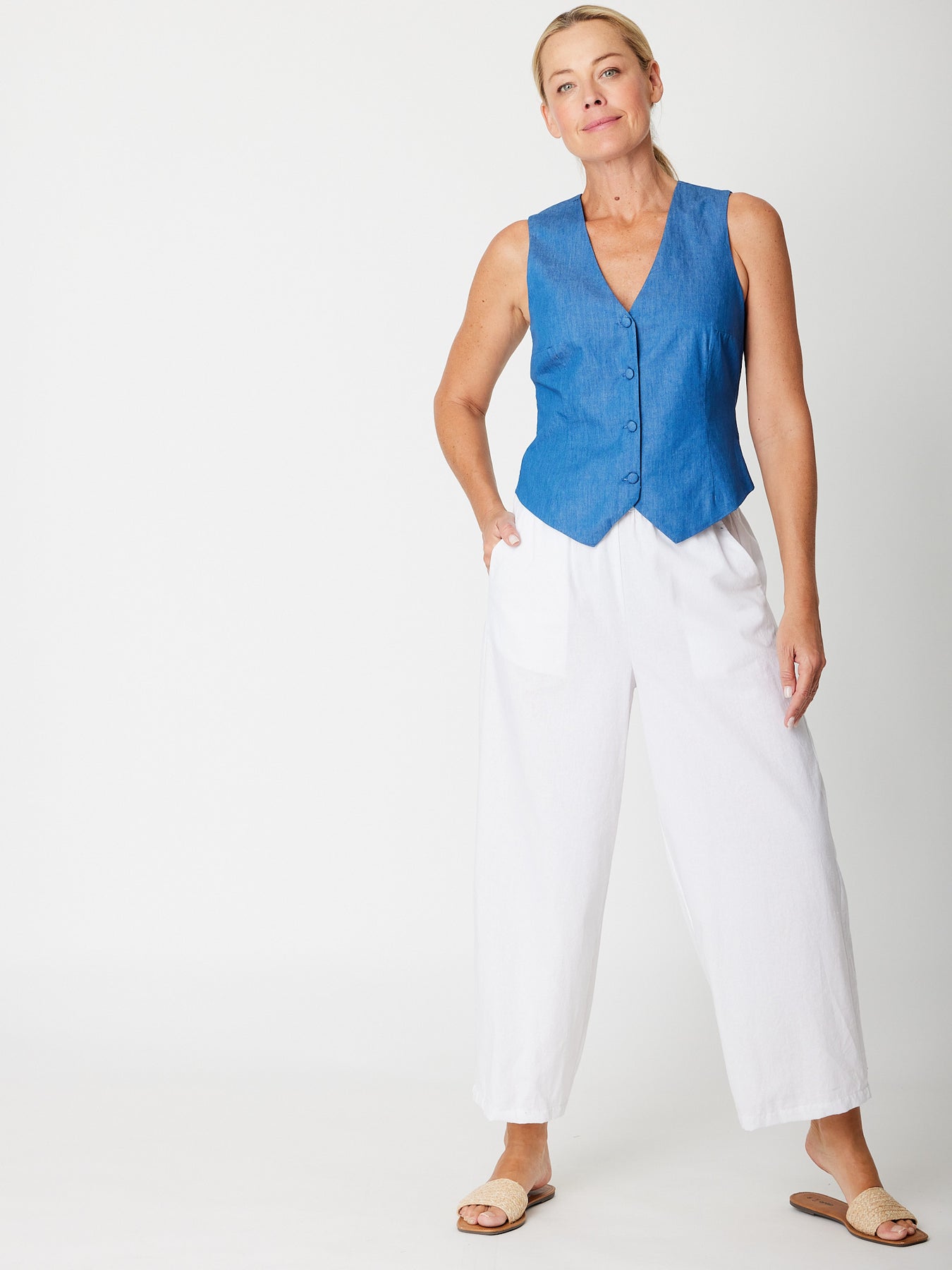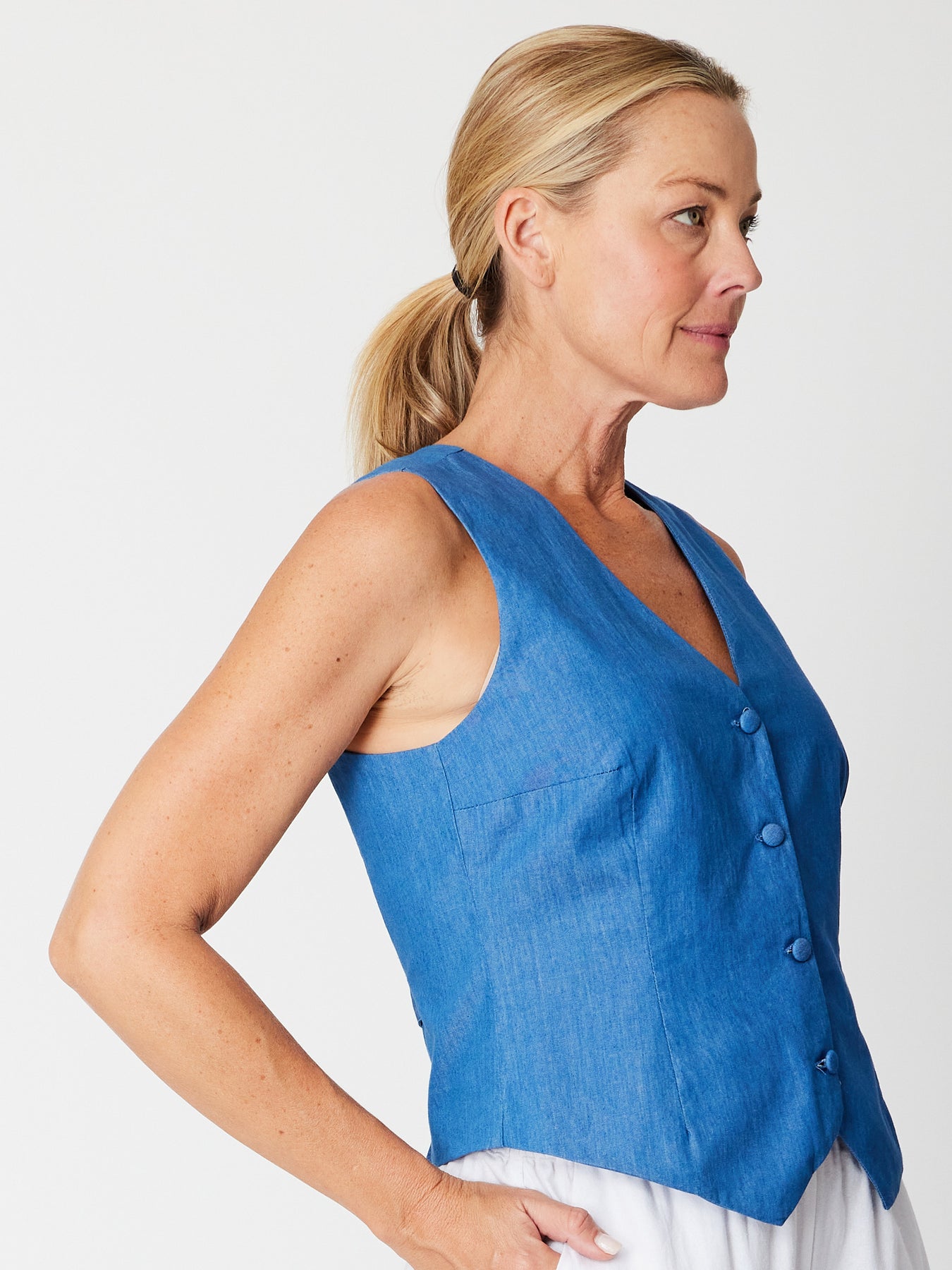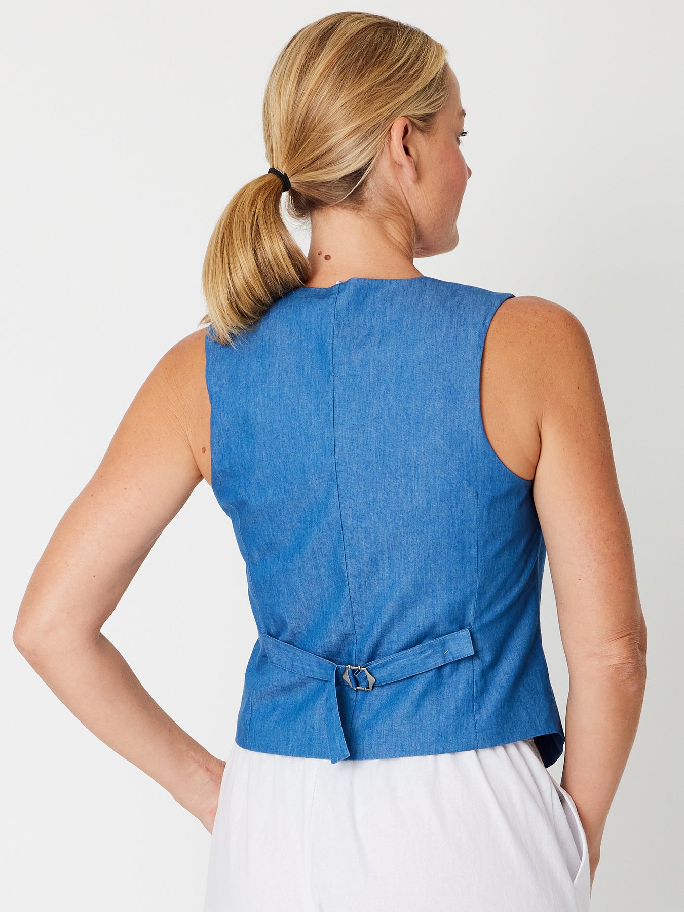 This stylish denim vest features a sleek sleeveless design and button closures covered with matching fabric for a polished look. The unique tie-back detail adds a flattering shape and customizable fit, making it a versatile layering piece perfect for elevating any casual outfit.