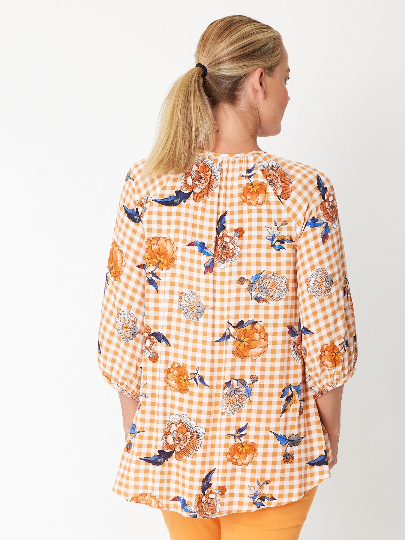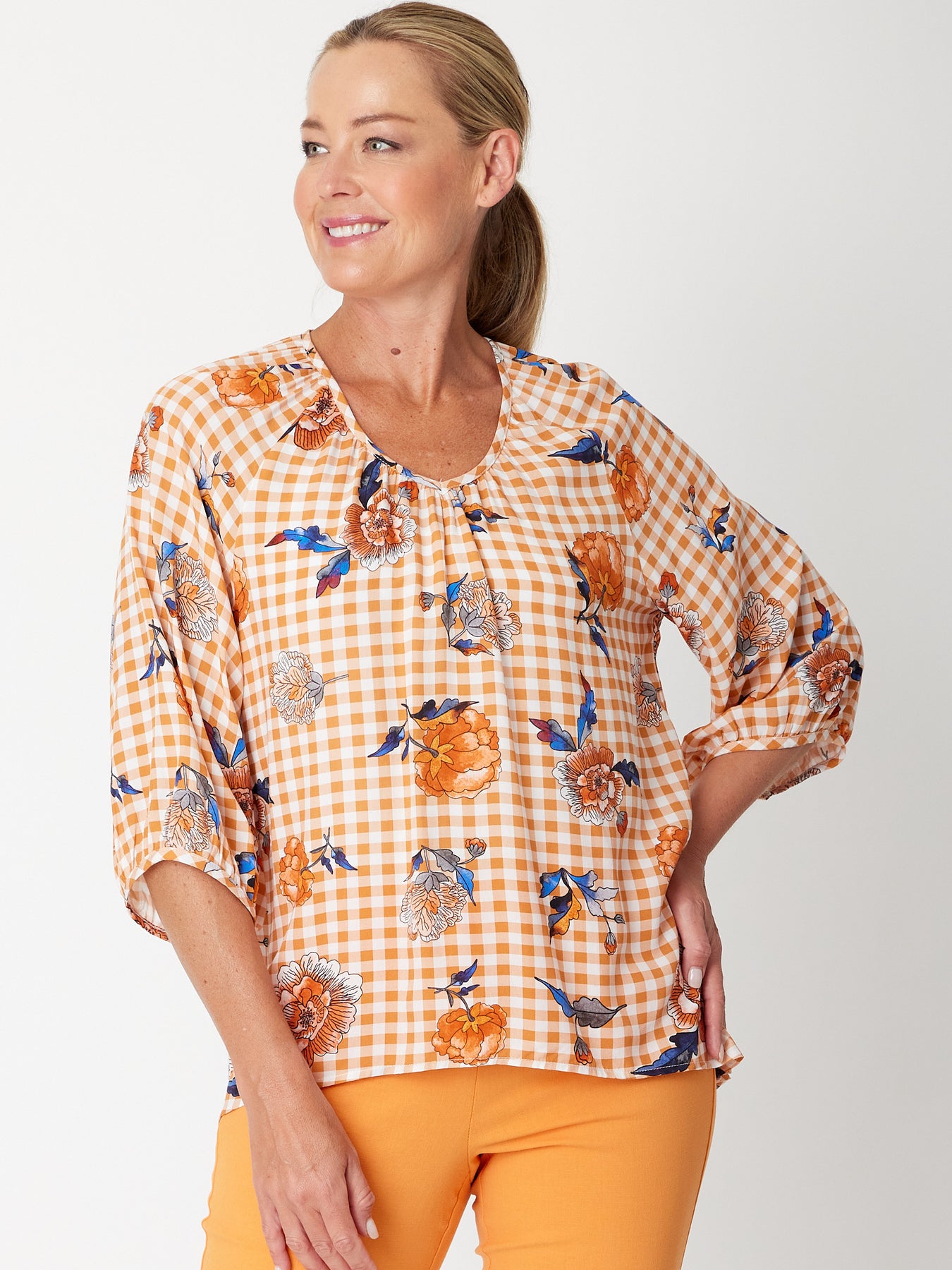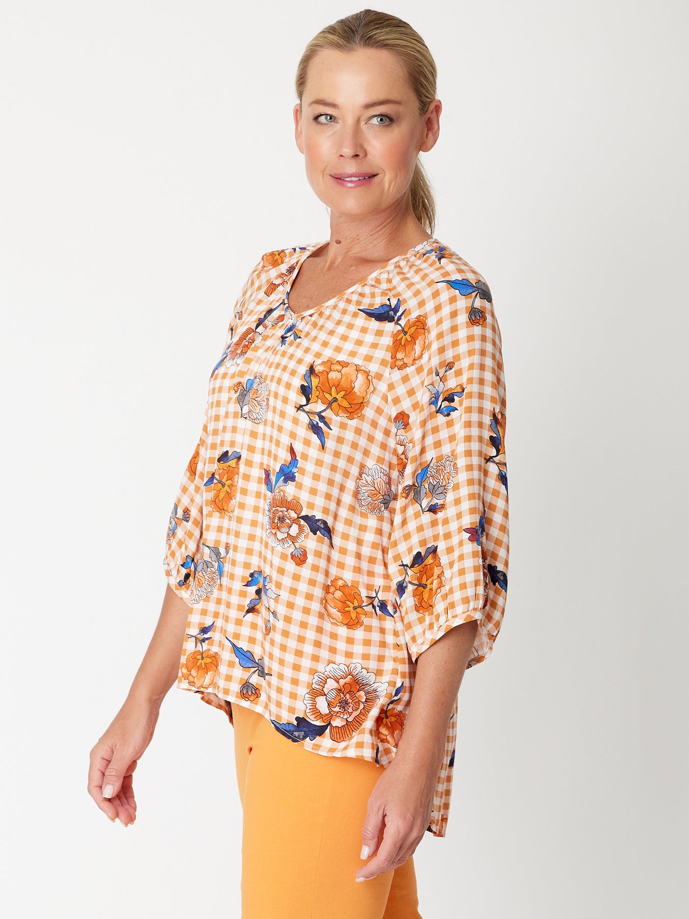 This Gemma Hi-Low Hem Top features a stylish gingham check pattern combined with 3/4 balloon sleeves and a flattering V-neck for effortless elegance. The delicate floral print adds a charming touch, making it perfect for both casual and polished looks. Pair it with our JLP24152 pants to complete a chic, coordinated outfit that stands out with subtle sophistication.