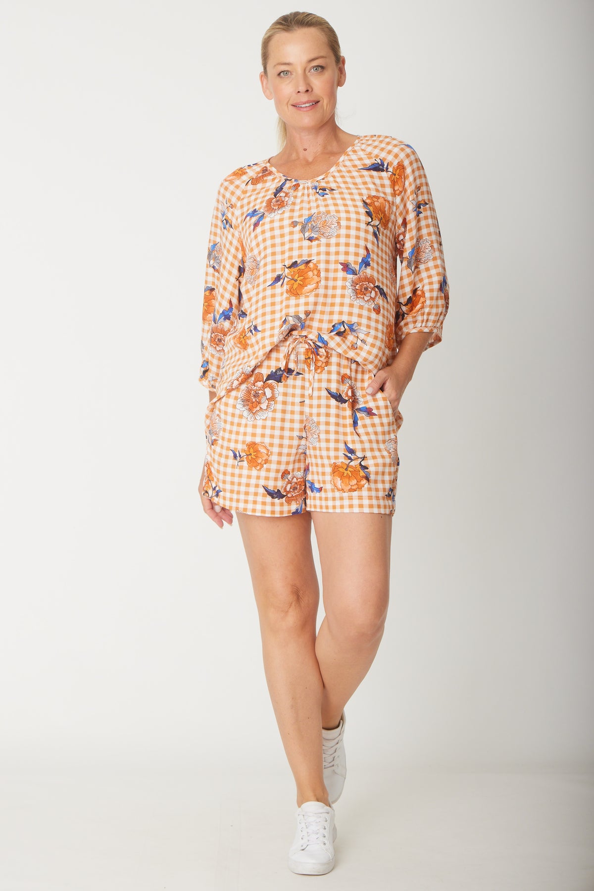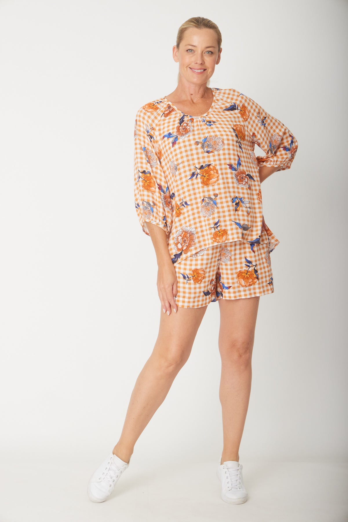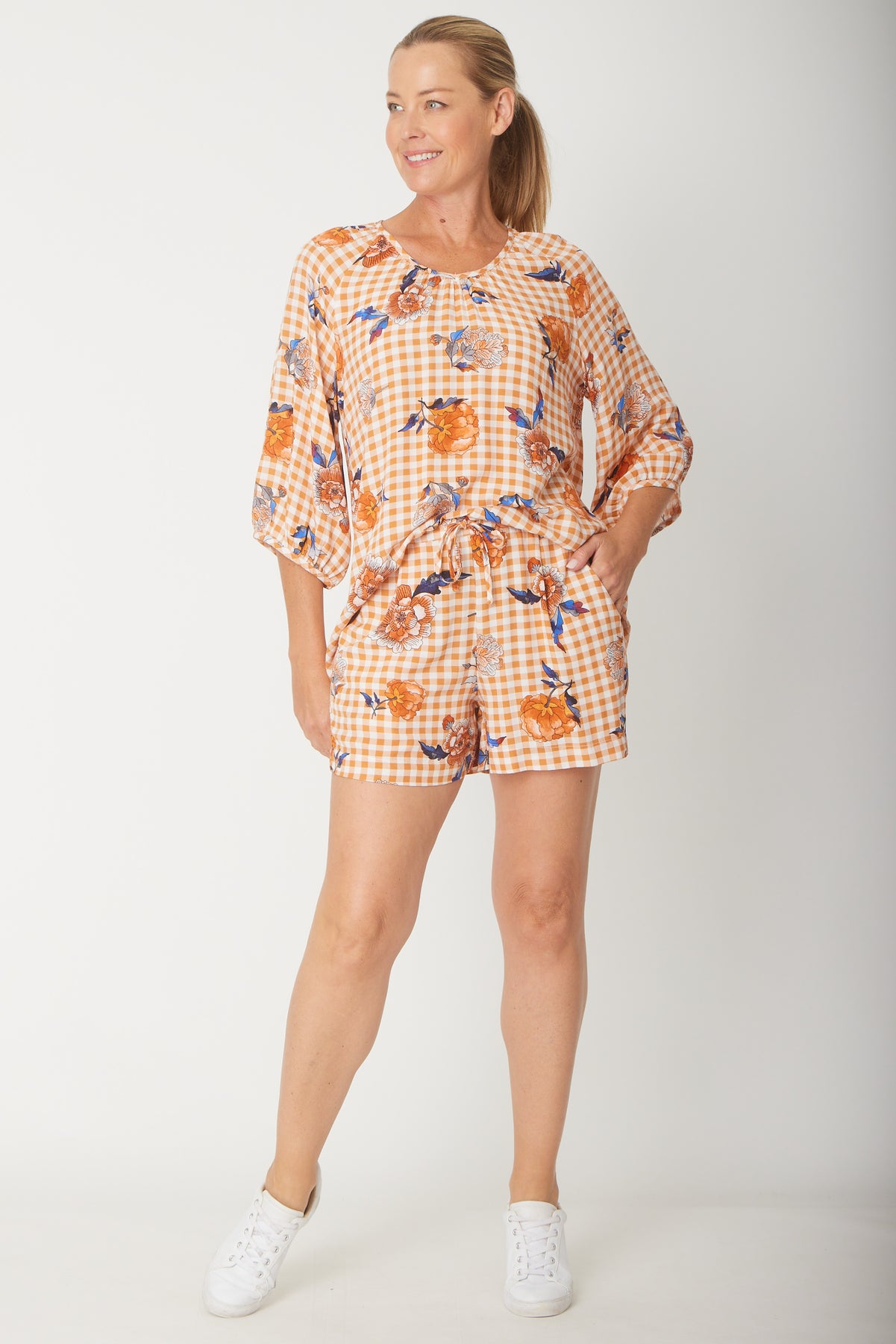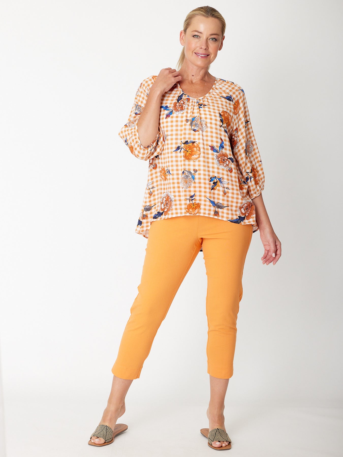 This Gemma Hi-Low Hem Top features a stylish gingham check pattern combined with 3/4 balloon sleeves and a flattering V-neck for effortless elegance. The delicate floral print adds a charming touch, making it perfect for both casual and polished looks. Pair it with our JLP24152 pants to complete a chic, coordinated outfit that stands out with subtle sophistication.