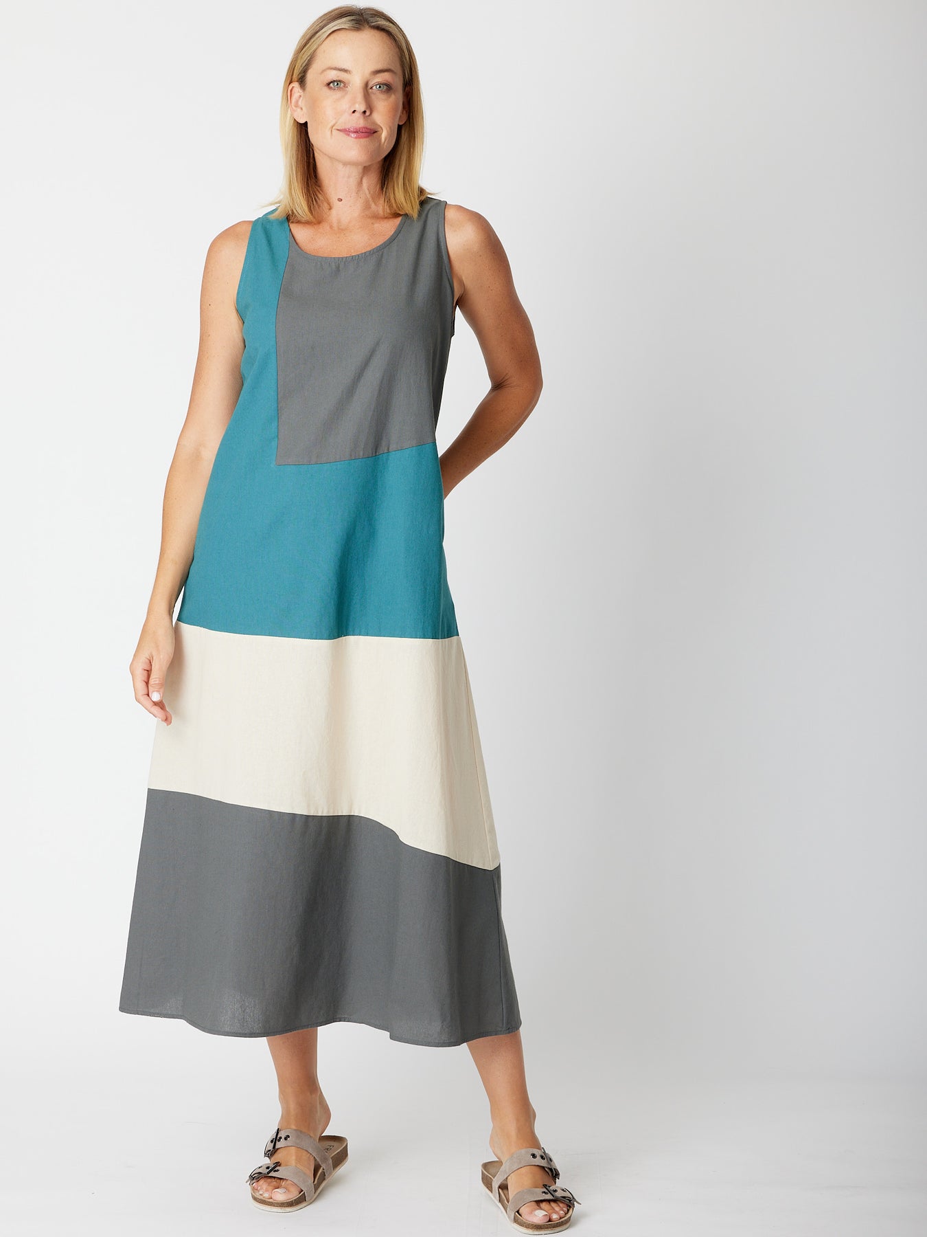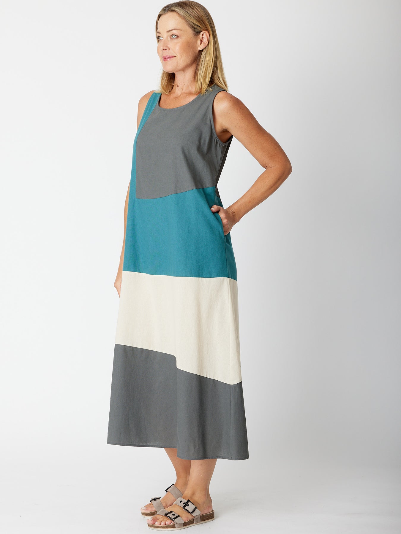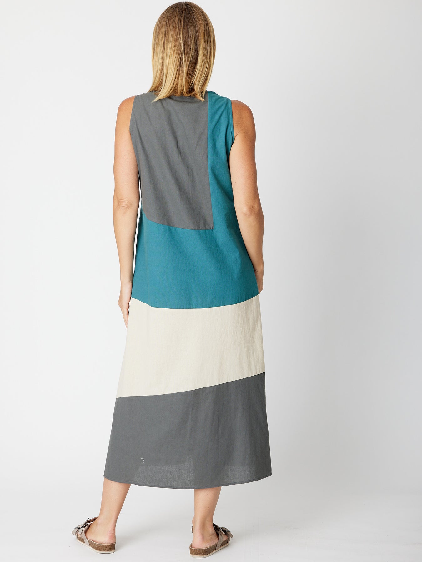 The Ho Chi Min 90 Degrees Dress is the perfect addition to your summer wardrobe. Made of cotton, this sleeveless maxi dress is designed to be bra friendly and has a convenient pocket. With its spliced colours, it's both stylish and practical. Stay cool and confident without worrying about it being see-through , no slip is required. non stretch