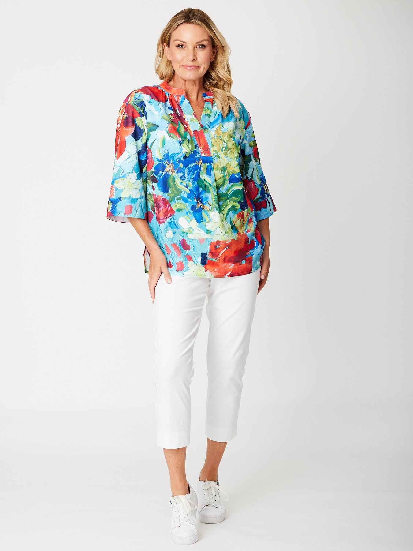 Elevate your wardrobe with this eye-catching kimono sleeve top featuring a stunning watercolour print in vibrant multi-tones. The relaxed nehru neckline and convenient half-opening create an effortlessly chic silhouette, while the generous three-quarter length sleeves add movement and style. Perfect for layering or wearing solo, this fun, longer-cut top transitions seamlessly from casual days to weekend adventures. A versatile piece that brings artistic flair to any outfit.