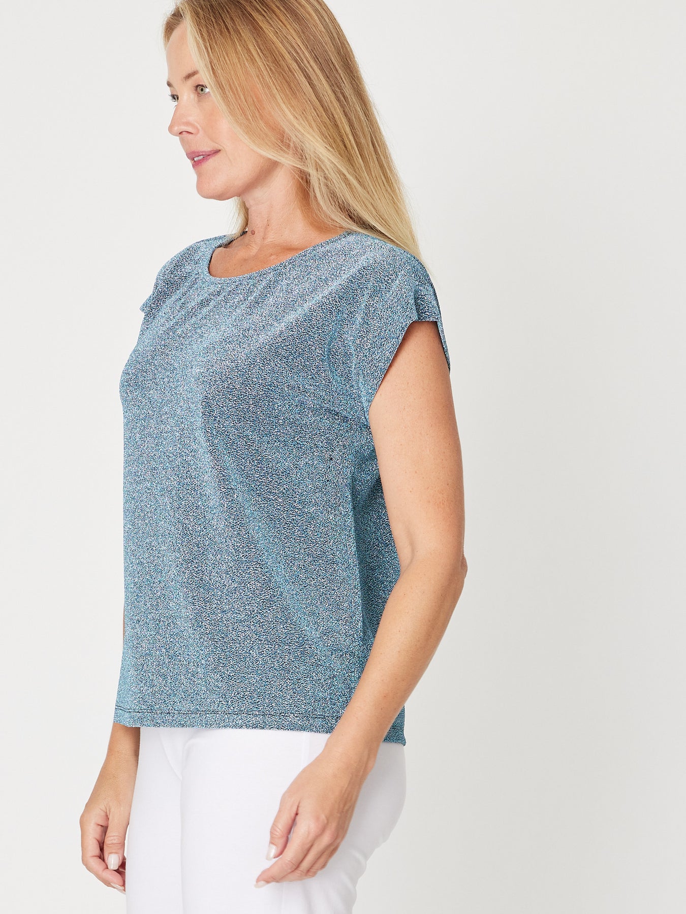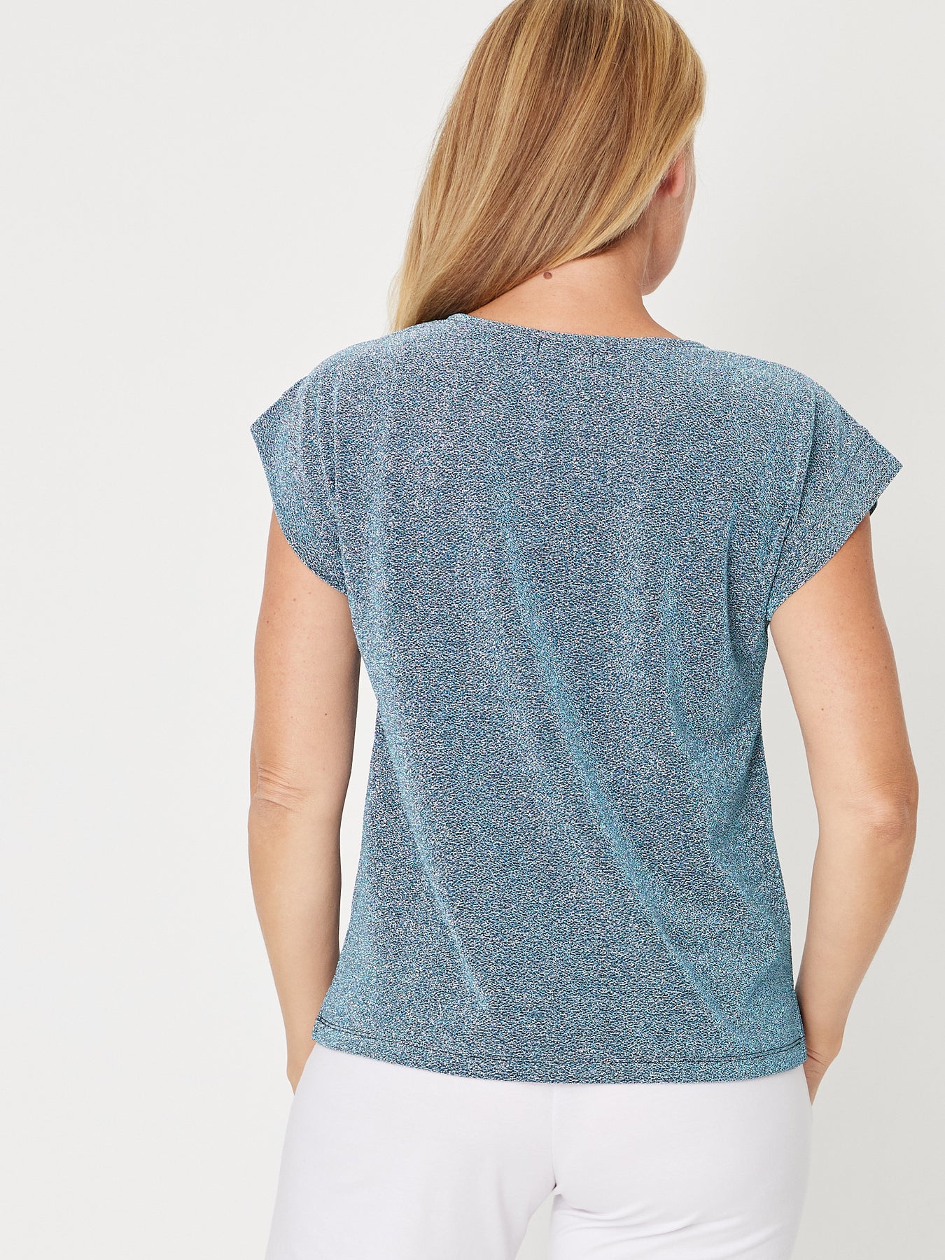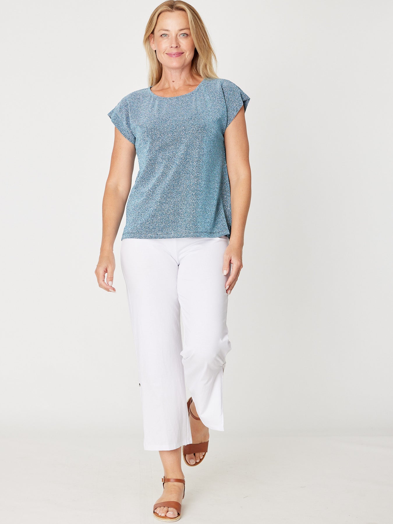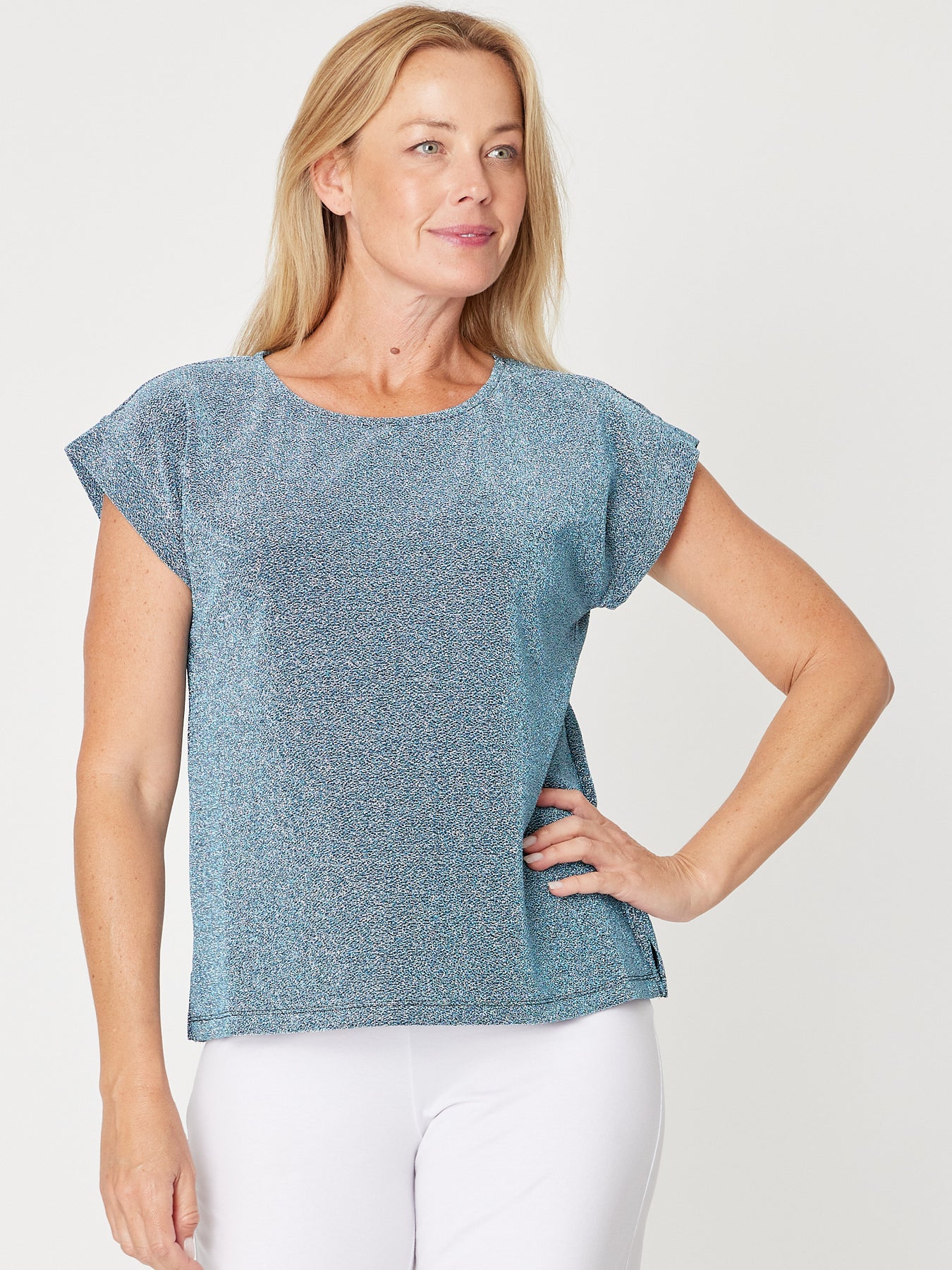 This silver Lurex Lux Tarin Top features a comfortable stretch fabric and stylish cap sleeves, making it an essential addition to your wardrobe. Its gentle machine washable material ensures easy care, while the sleek round neck offers timeless appeal. Pair it effortlessly with the matching pant skirt and jacket for a coordinated ensemble, or throw it on with your favourite jeans or wardrobe staples for a chic, on-trend look.
