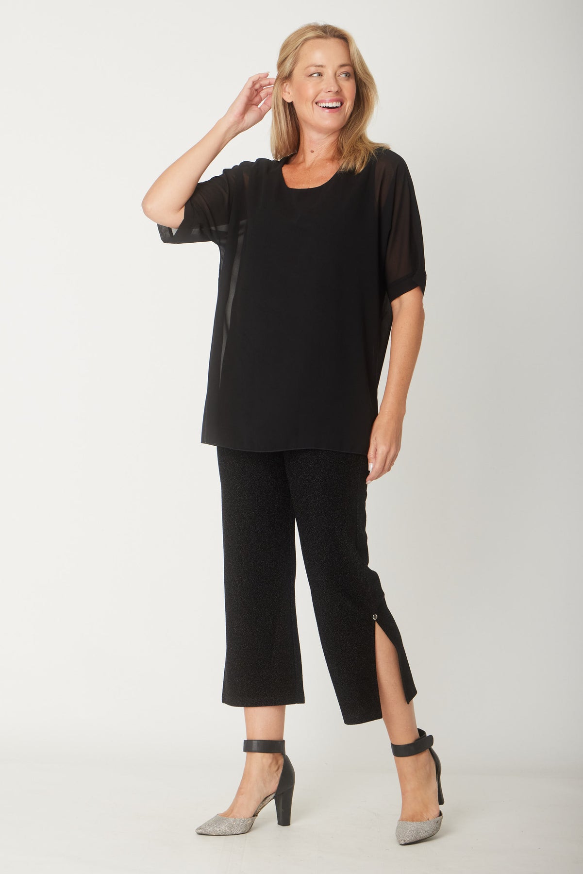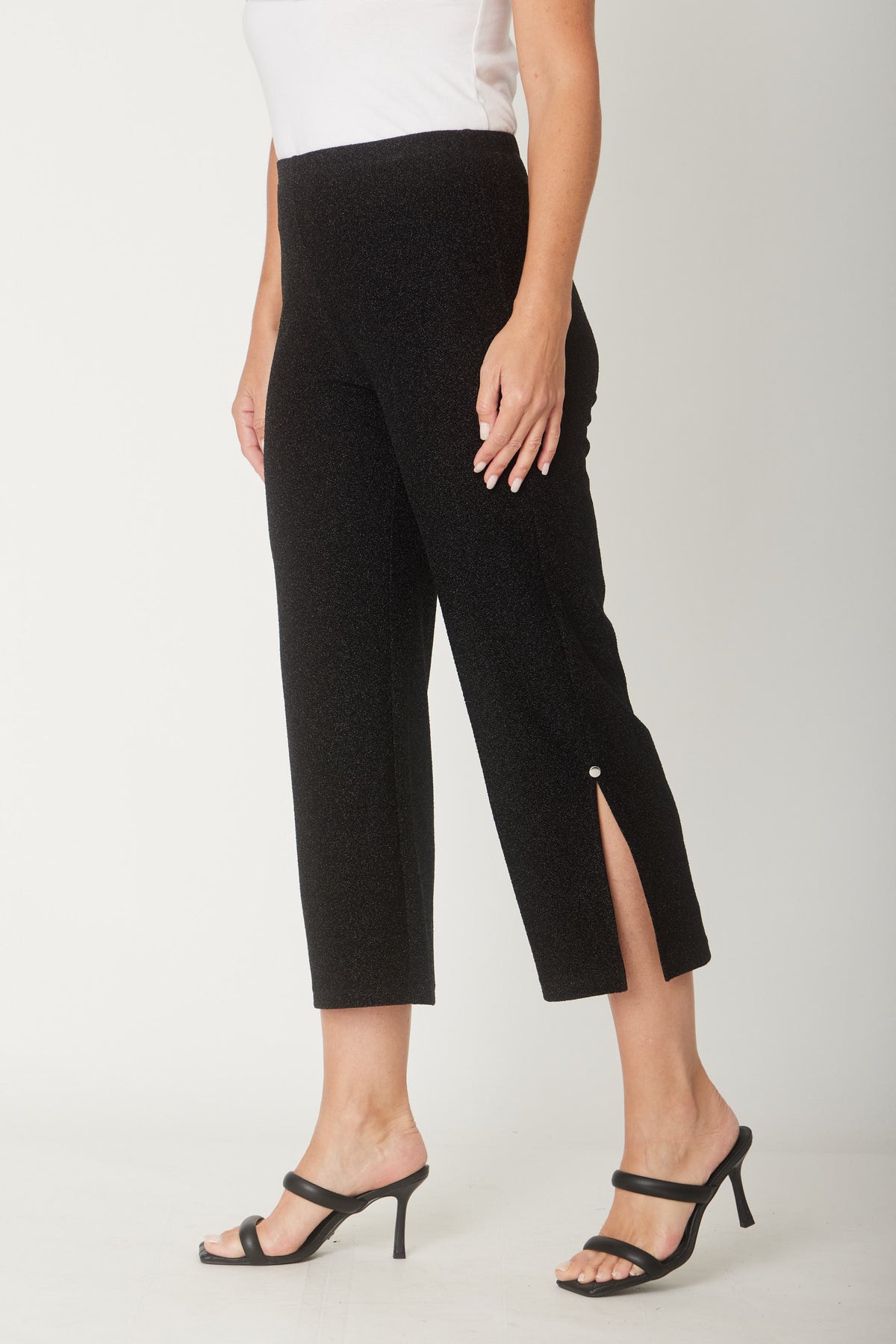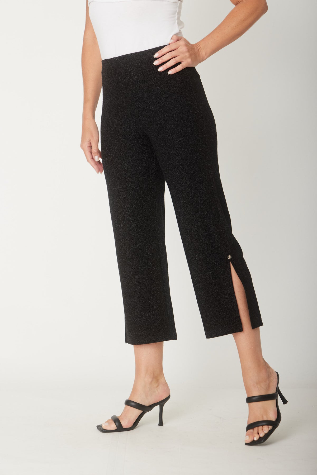 These Lurex Petties Pants offer a 7/8 length with a comfortable elastic waist, combining stretch fabric and subtle shimmer for effortless style. Perfect for dressing up or down, they create a chic look for any occasion. Pair them with the matching lurex Tarin top or jacket to complete a standout ensemble that radiates confidence and glamour.