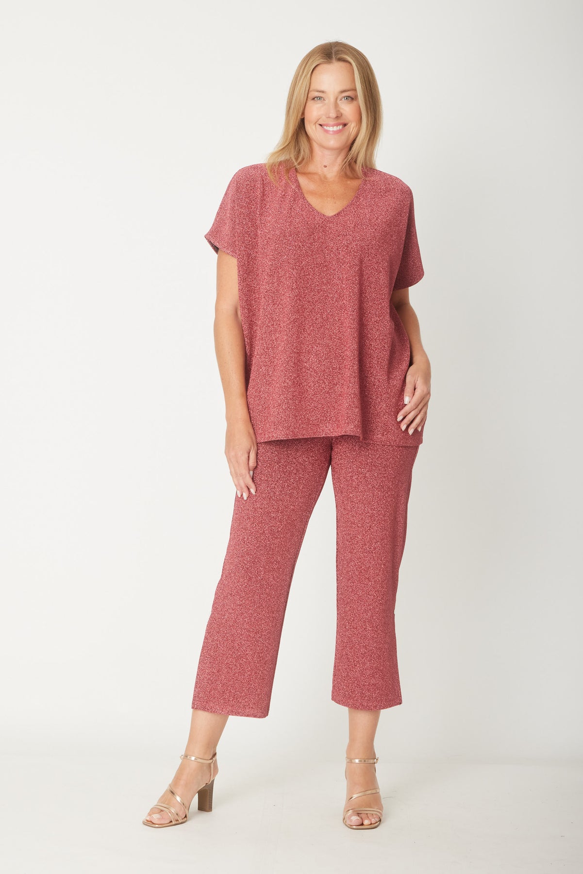 These Lurex Petties Pants offer a 7/8 length with a comfortable elastic waist, combining stretch fabric and subtle shimmer for effortless style. Perfect for dressing up or down, they create a chic look for any occasion. Pair them with the matching lurex Tarin top or jacket to complete a standout ensemble that radiates confidence and glamour.