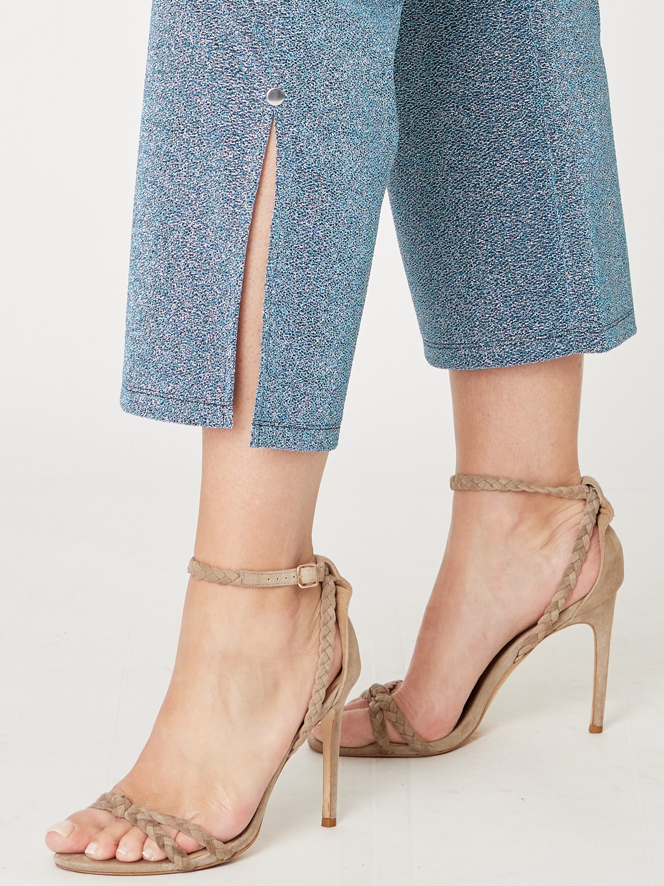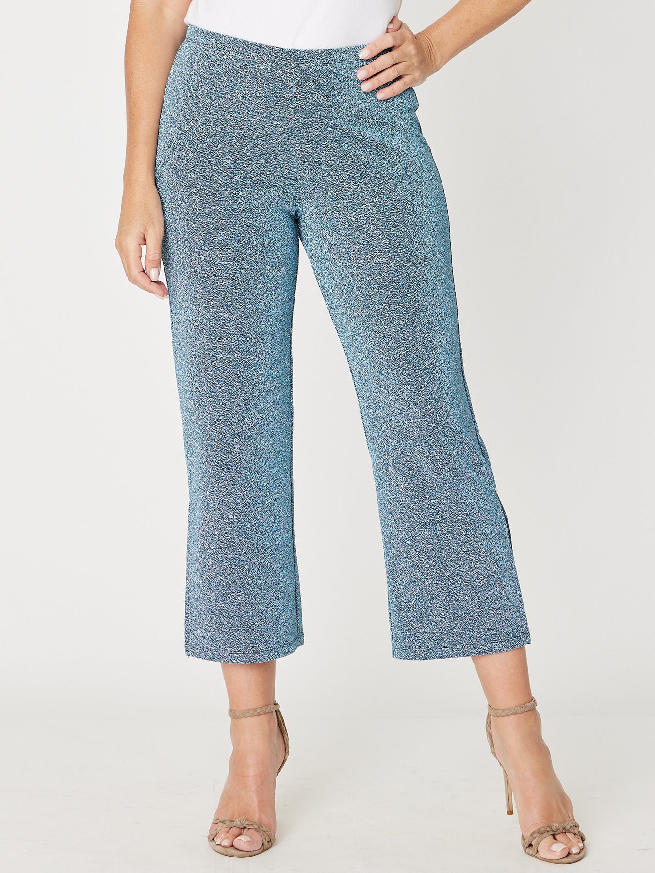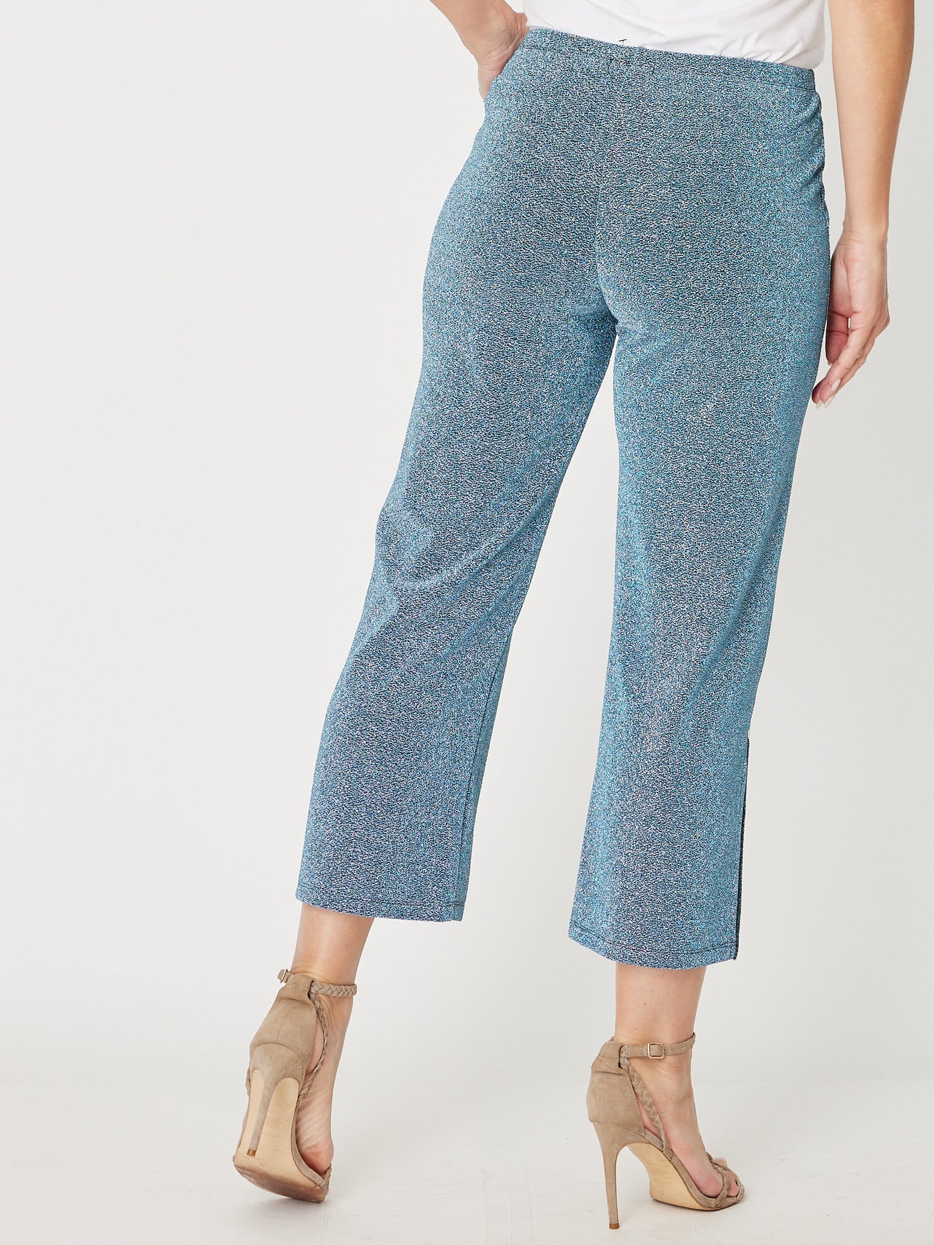 These Lurex Petties Pants offer a 7/8 length with a comfortable elastic waist, combining stretch fabric and subtle shimmer for effortless style. Perfect for dressing up or down, they create a chic look for any occasion. Pair them with the matching lurex Tarin top or jacket to complete a standout ensemble that radiates confidence and glamour.
