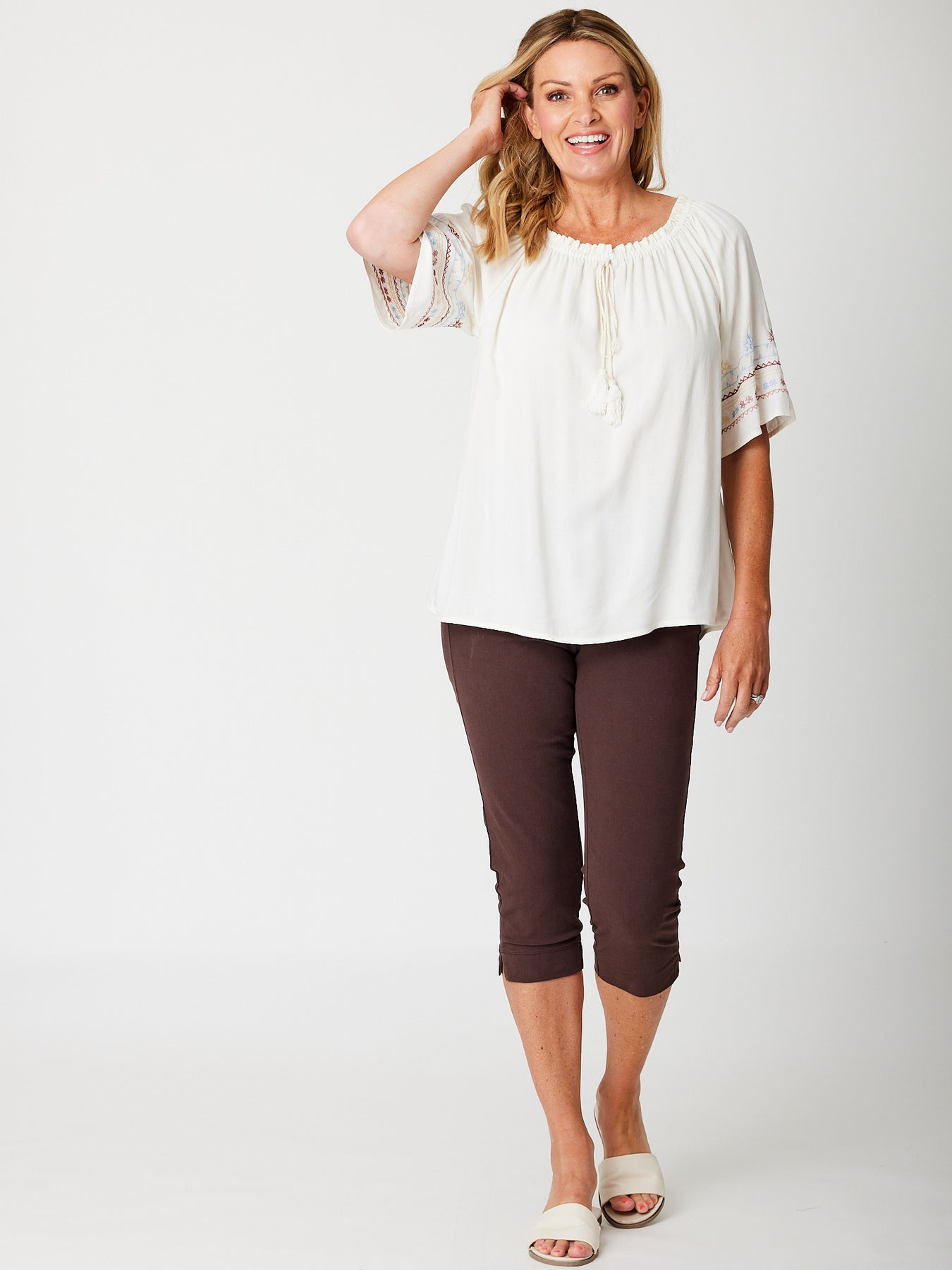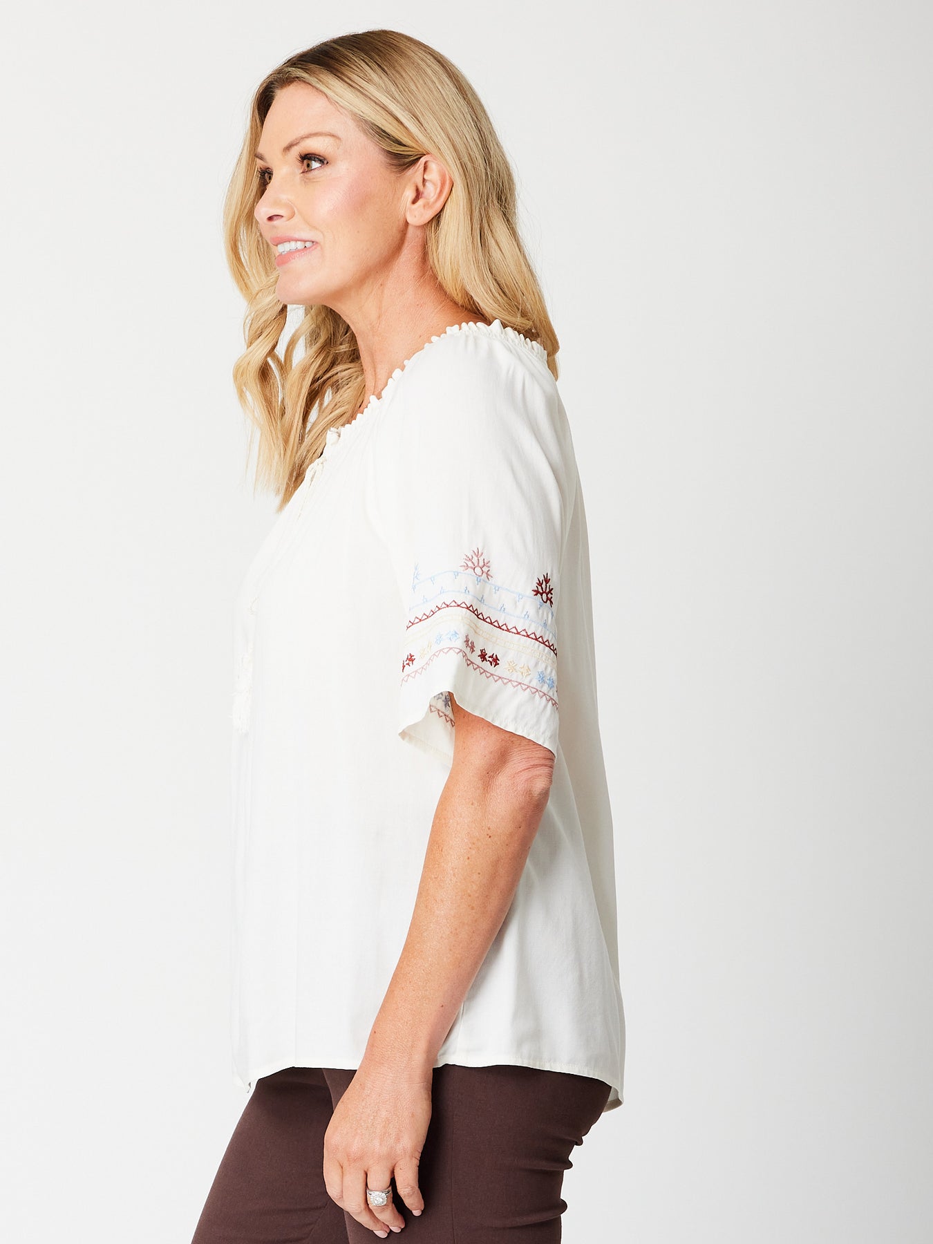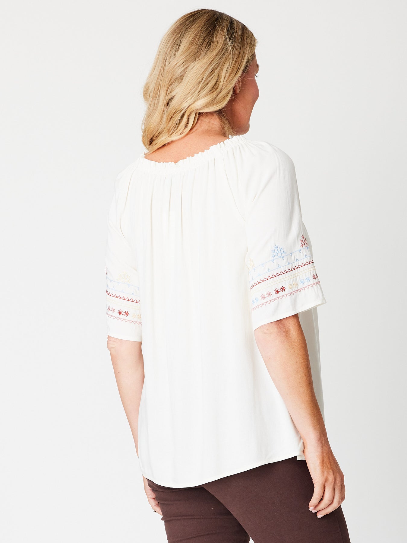 Elevate your wardrobe with this charming top featuring a classic round neckline finished with elastic trim and adjustable ties for a customized fit. The three-quarter sleeves showcase exquisite embroidery detailing along the edges, adding an elegant touch that transitions seamlessly from casual outings to special occasions. The thoughtful design combines comfort with style, making this piece a versatile essential that works beautifully with your existing collection. Perfect for those who appreciate quality craftsmanship and timeless appeal.