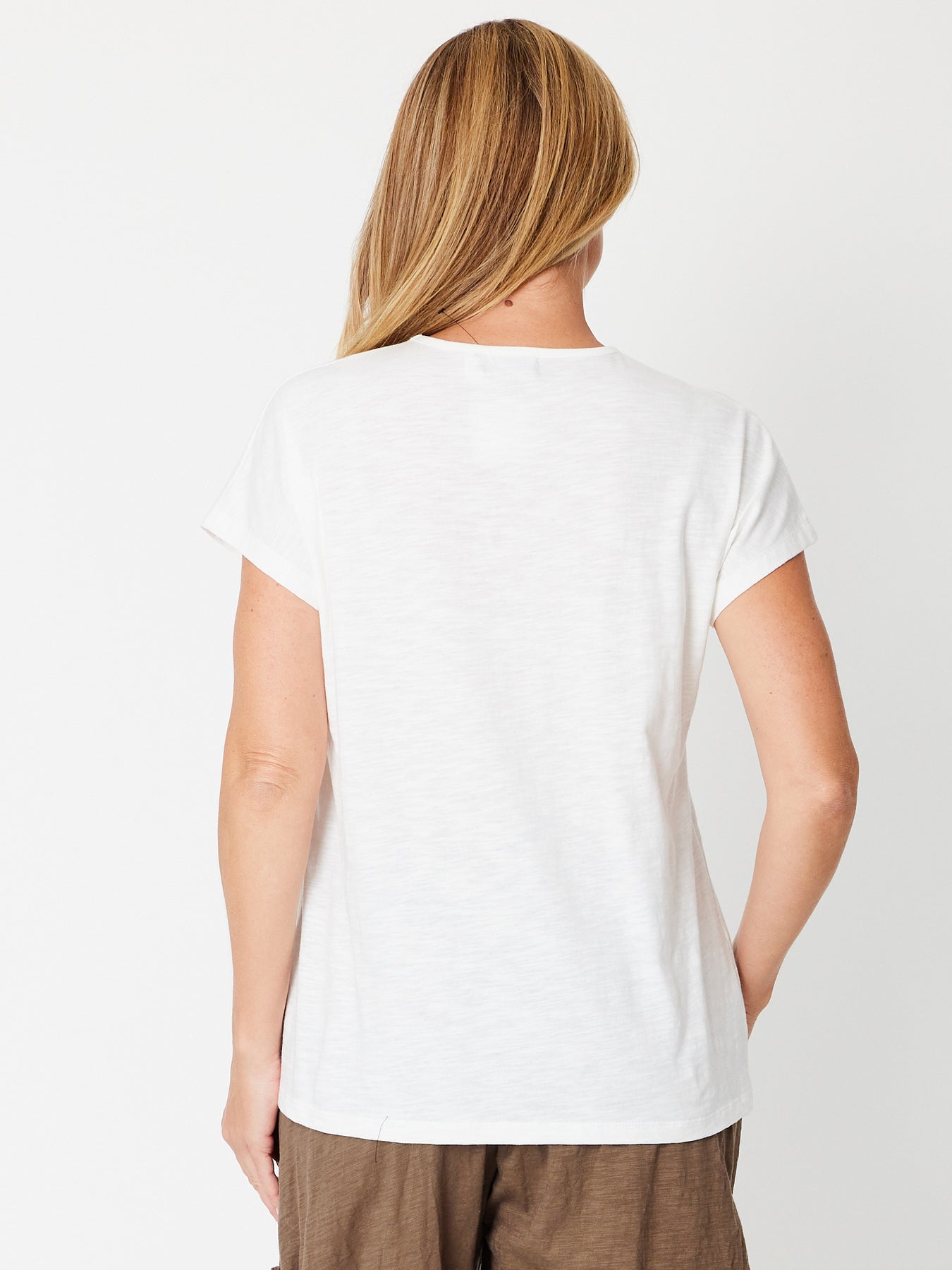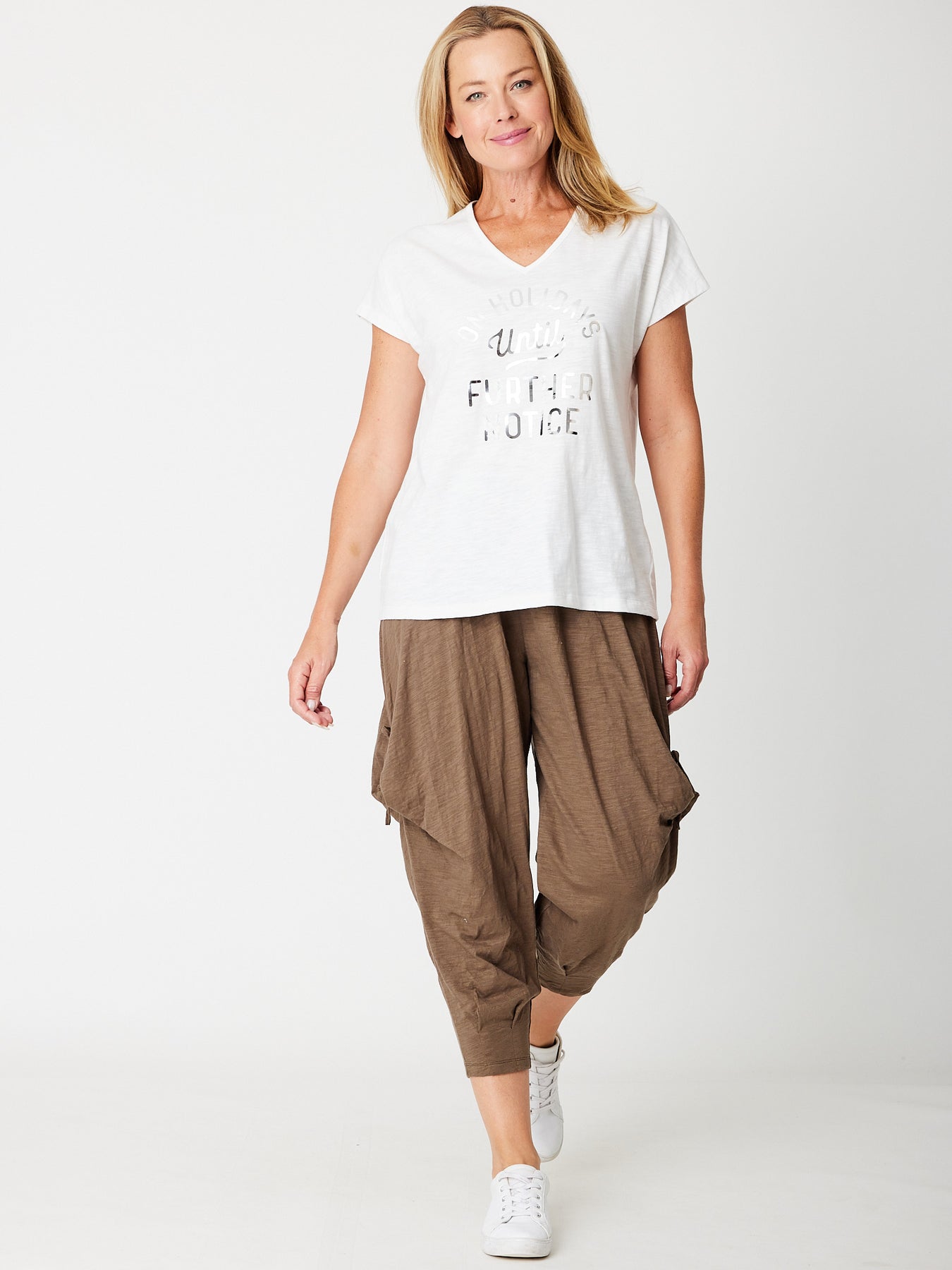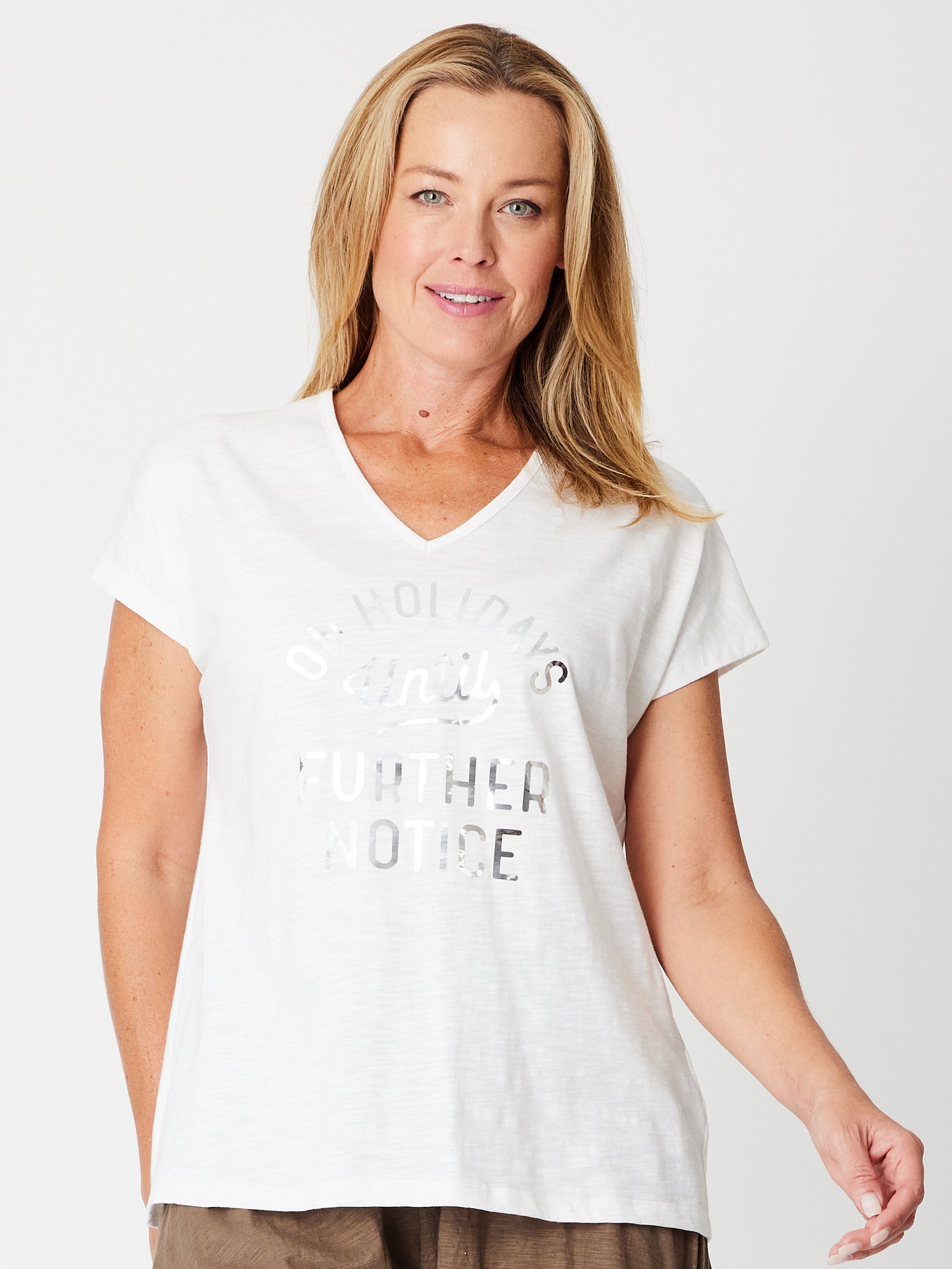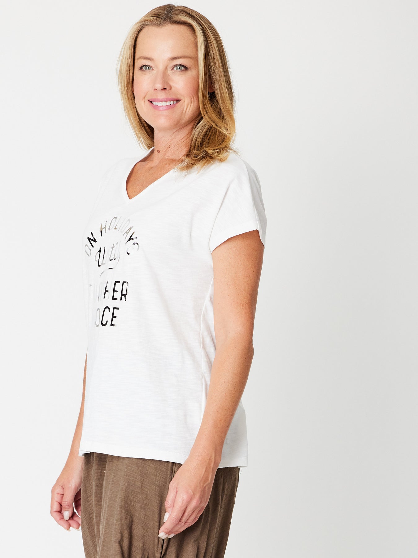 Escape the everyday in our On Holidays Tee, crafted from soft slub cotton jersey that feels as relaxed as your vacation mindset. The classic vee neckline flatters while short sleeves keep you cool and comfortable. A playful foil print declaring "on holidays" adds personality to your casual wardrobe—perfect for those who live for getaway season. Versatile enough for lounging or layering, this tee brings effortless style to your collection.