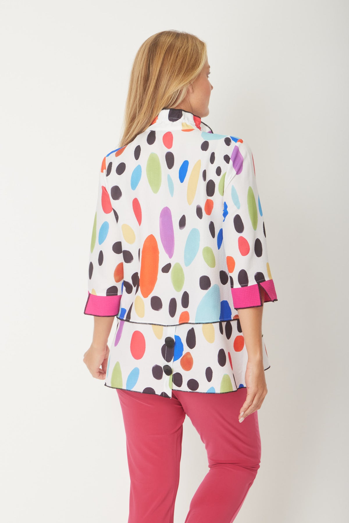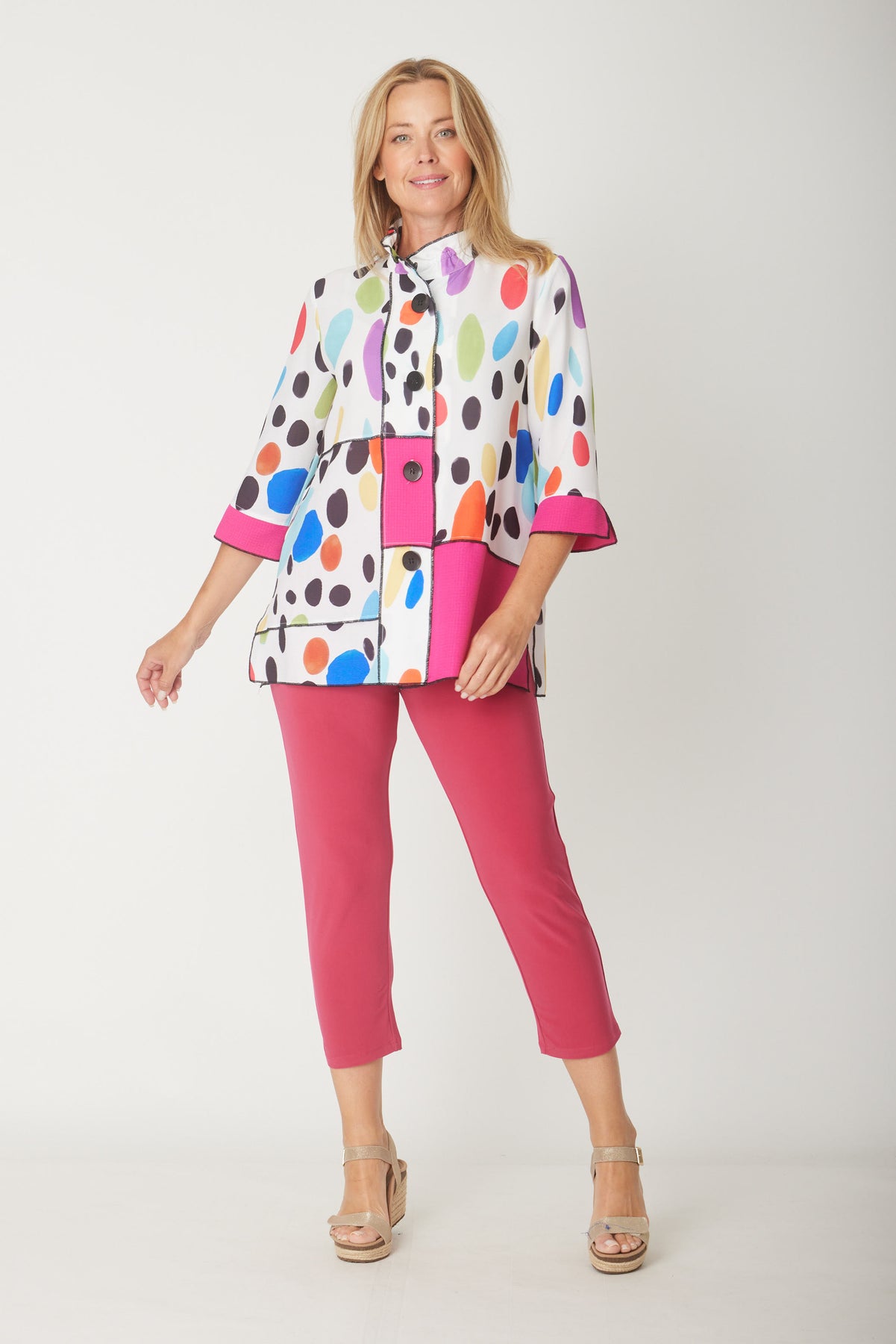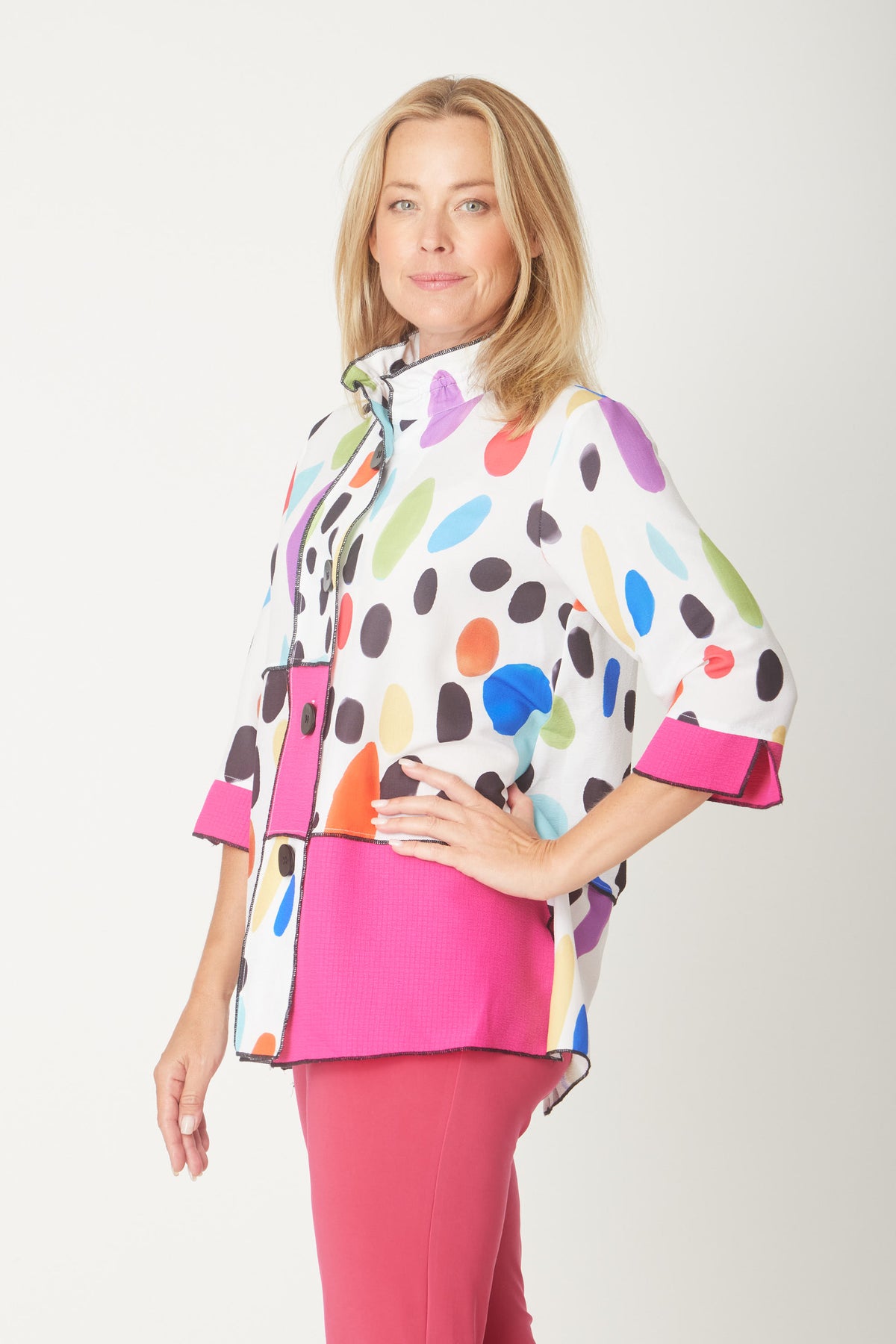 Elevate your wardrobe with this striking overlocked HOT PINK shirt that seamlessly blends bold block patterns with eye-catching prints. The button-through design offers effortless styling versatility, while the distinctive 3/4 flutted sleeves add a contemporary flair that sets this piece apart. Perfect for making a confident statement, whether you're dressing up for work or creating a standout casual look. The quality overlocked finish ensures durability and a polished appearance that lasts.