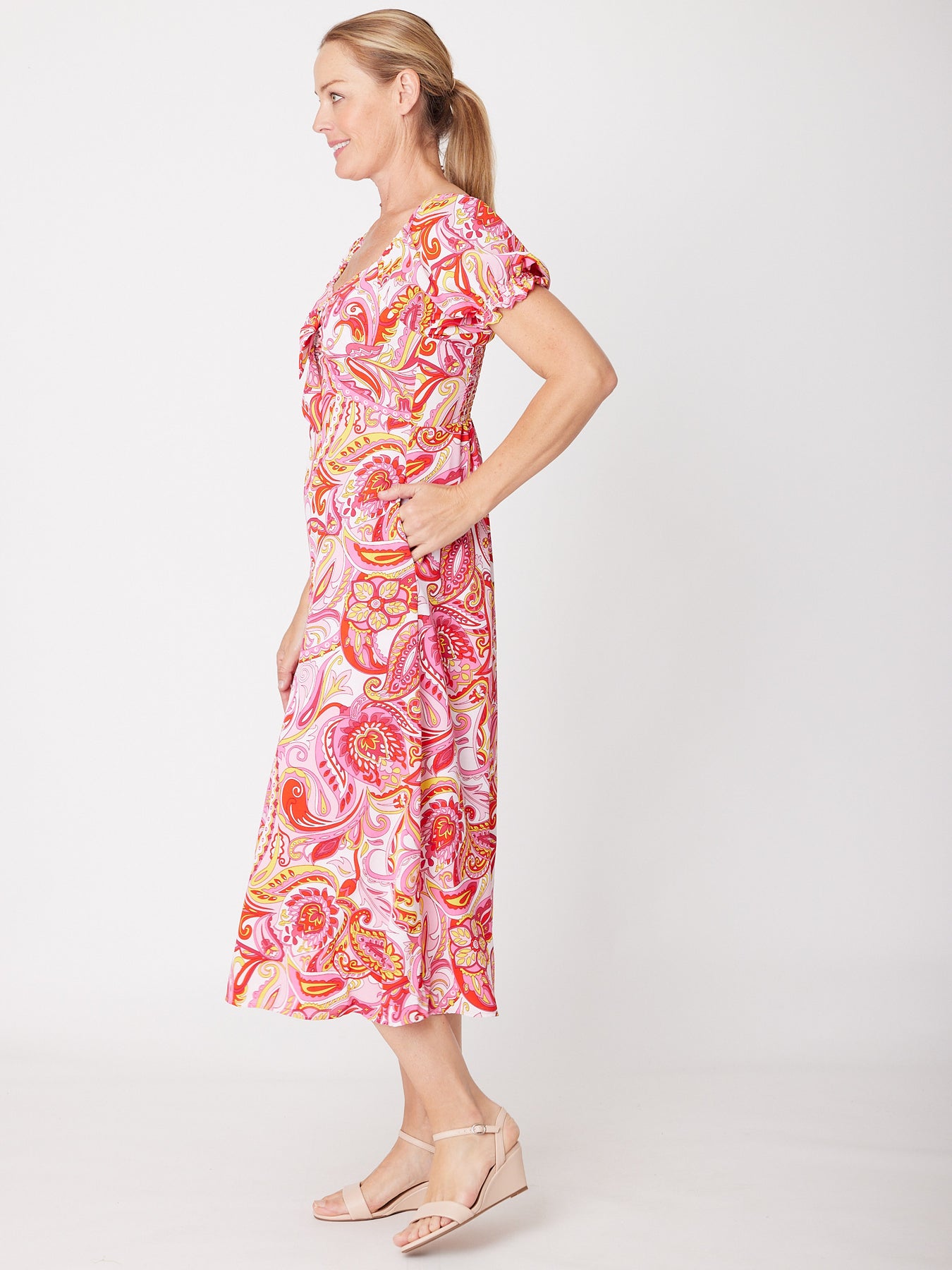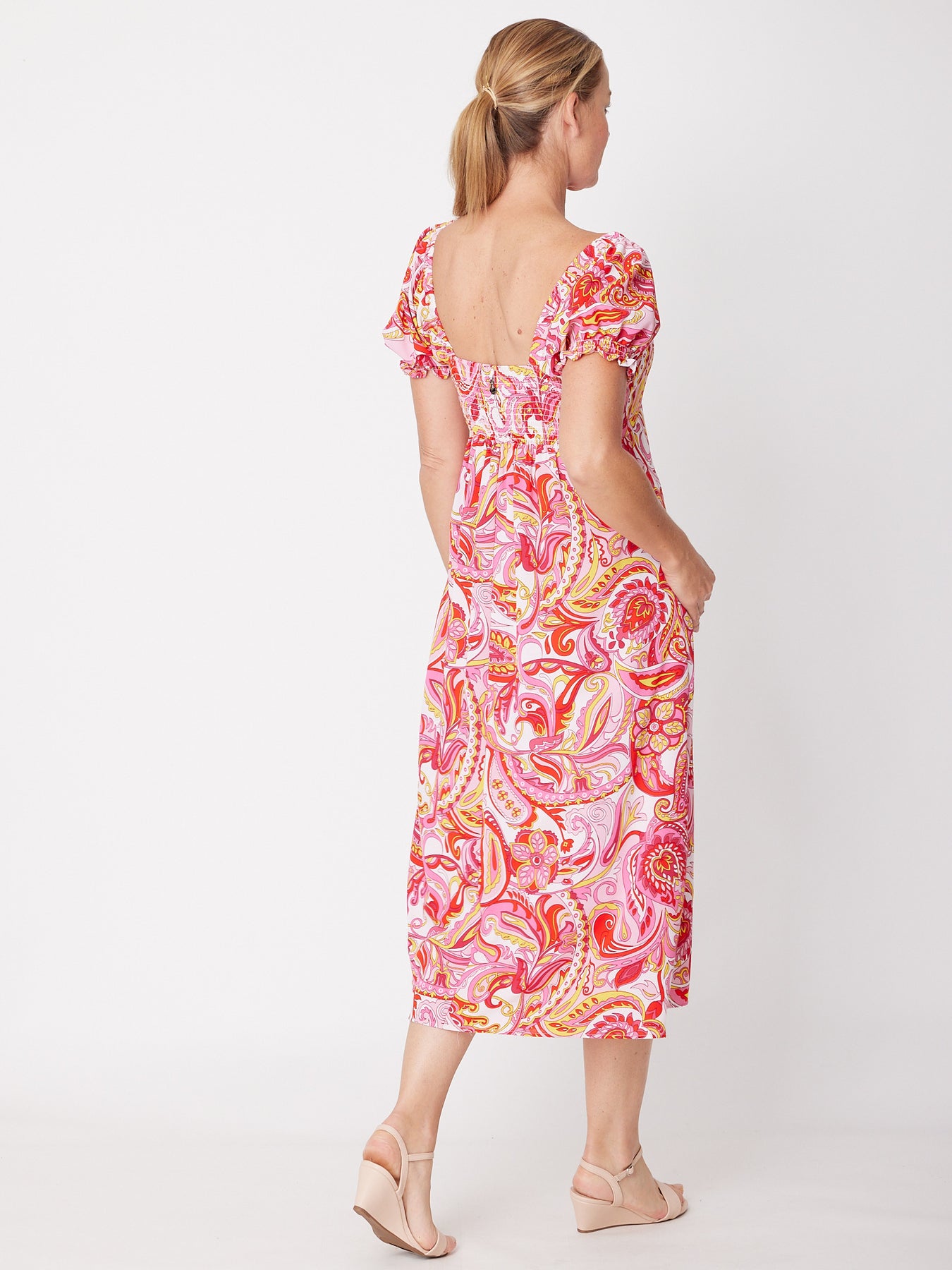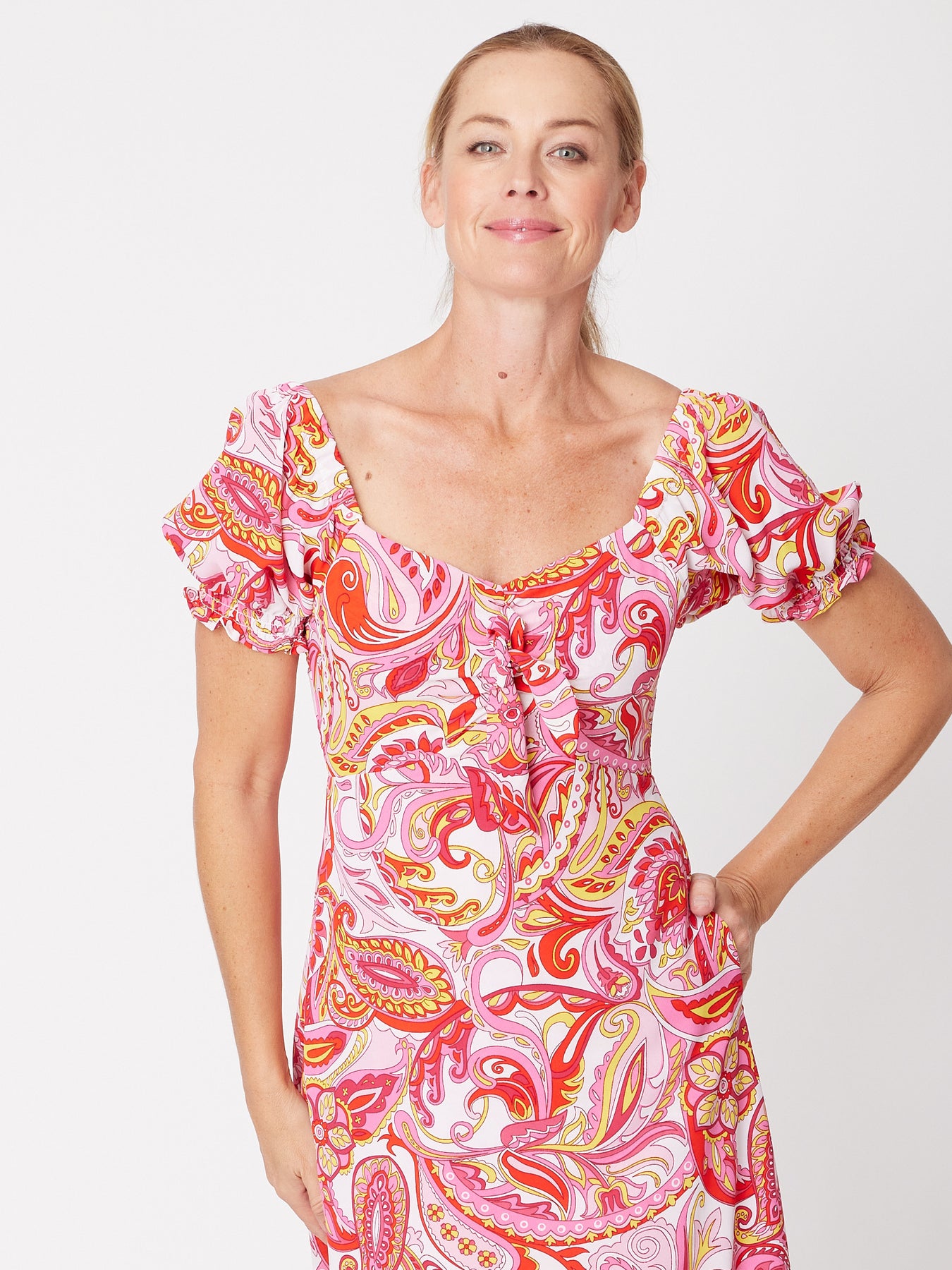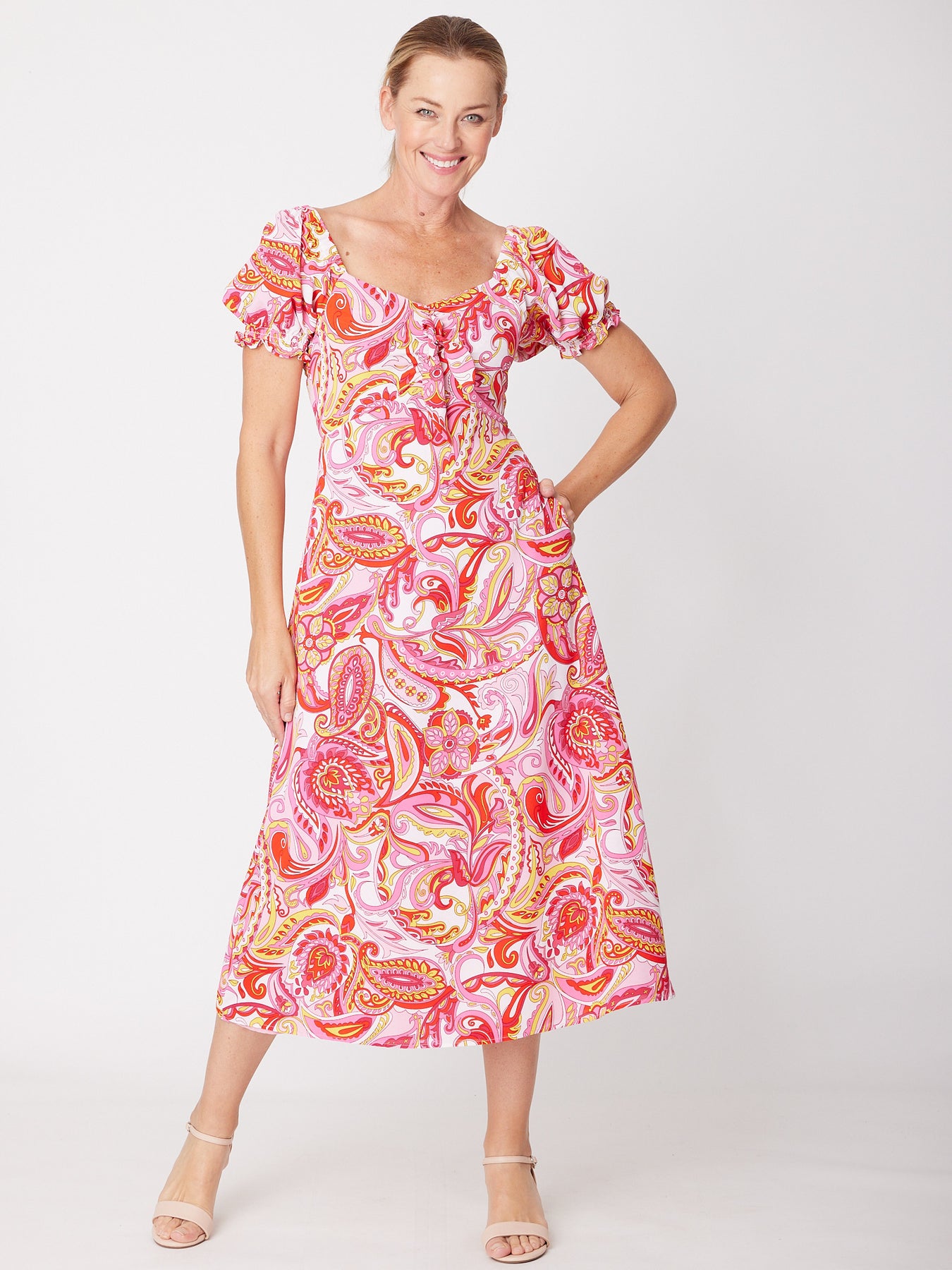 This charming puff sleeve dress features elasticated cuffs for a comfortable fit and a flattering sassy neckline with a faux tie detail. The vibrant hot pink paisley print adds a bold, playful touch, making it perfect for standing out on any occasion. Lightweight and stylish, it effortlessly combines comfort with eye-catching flair.