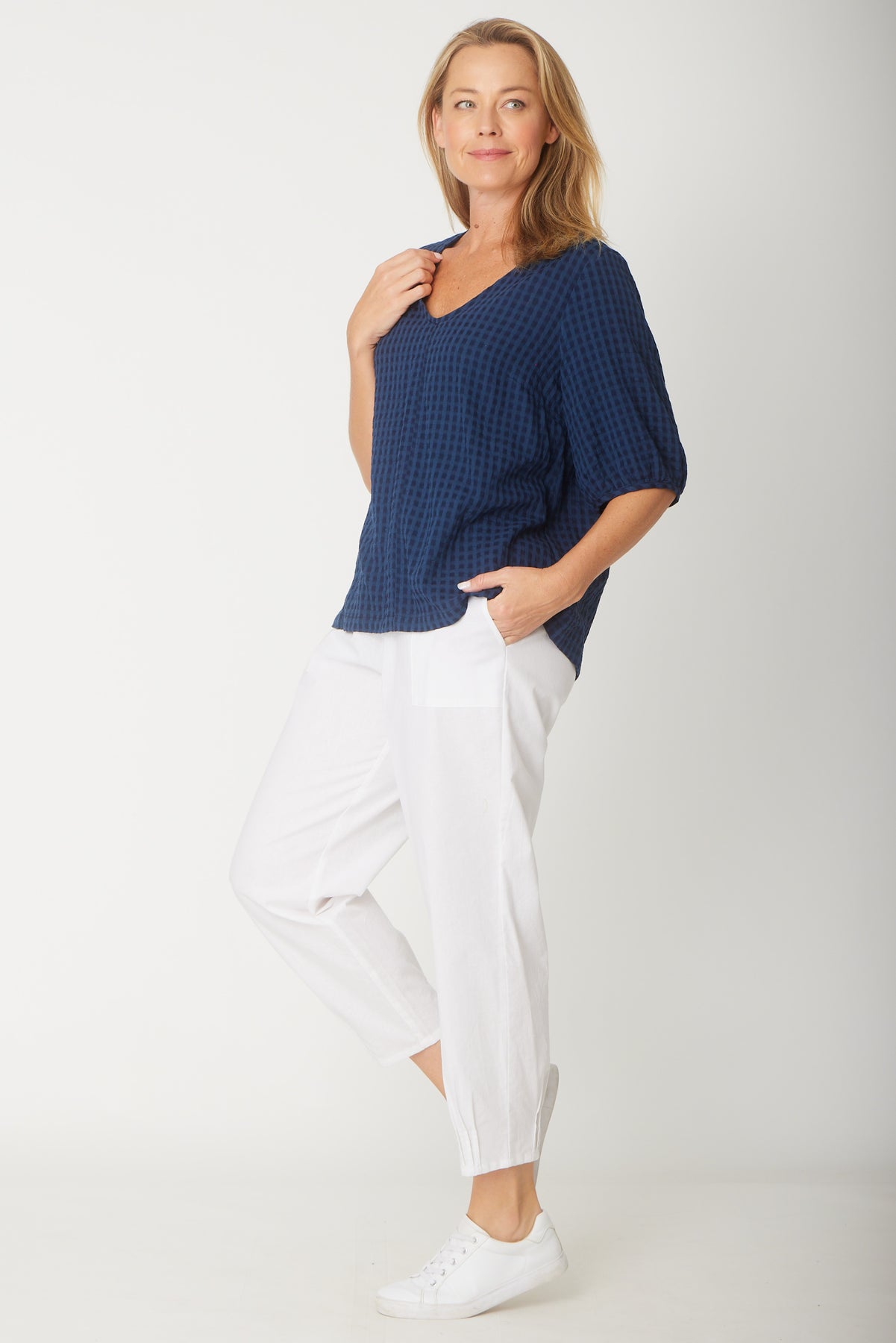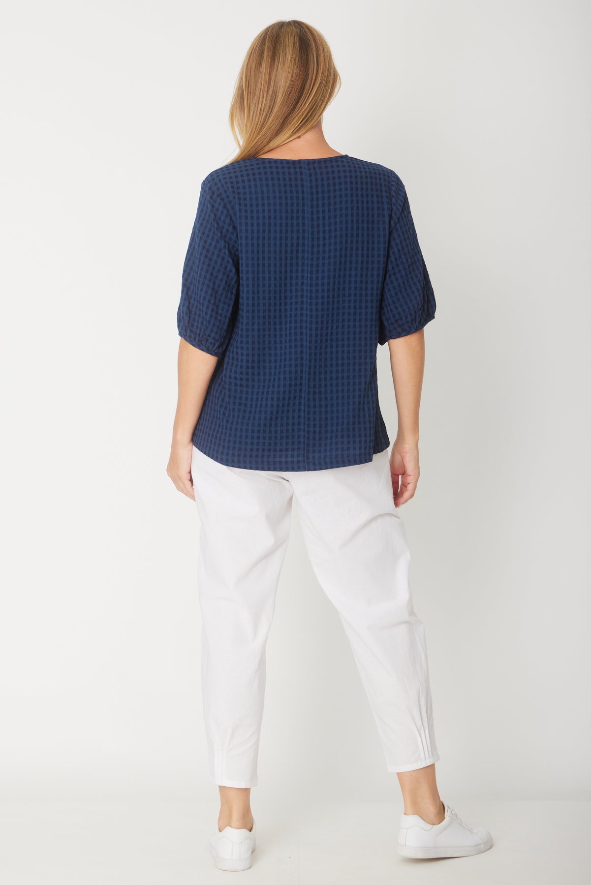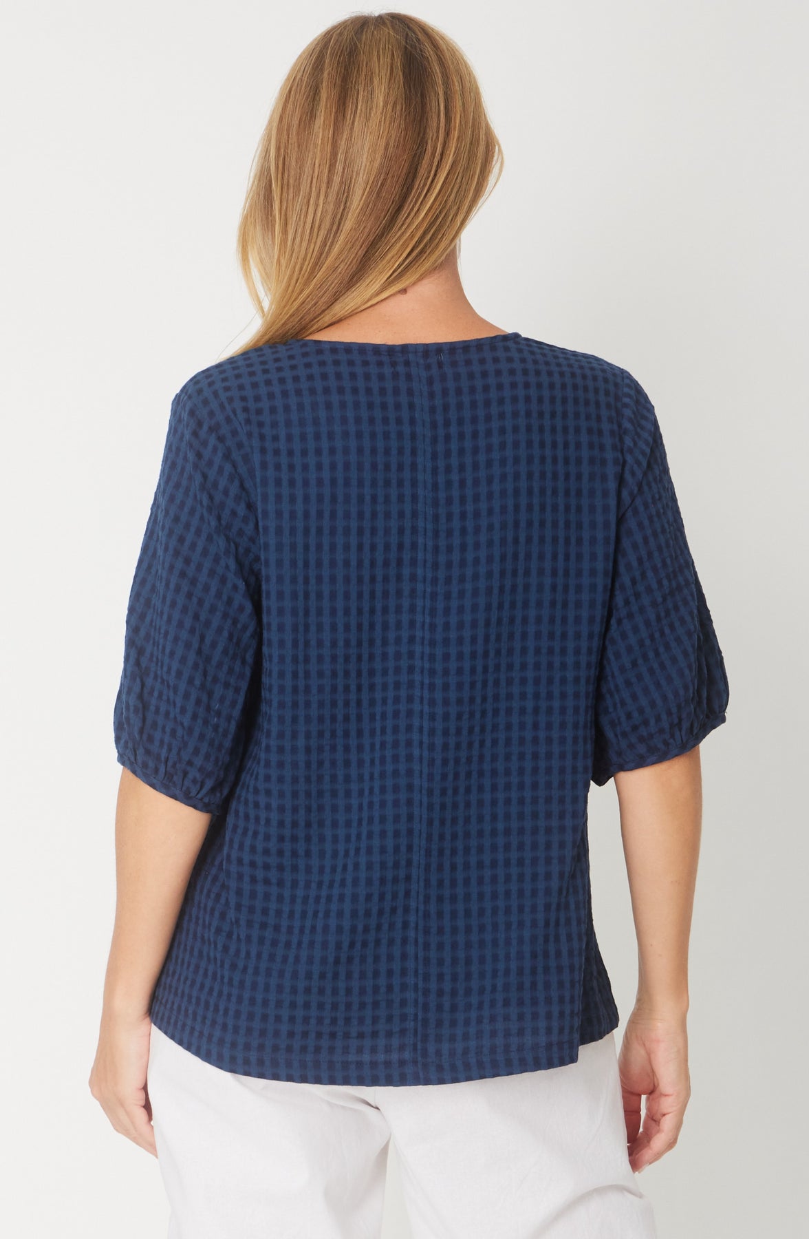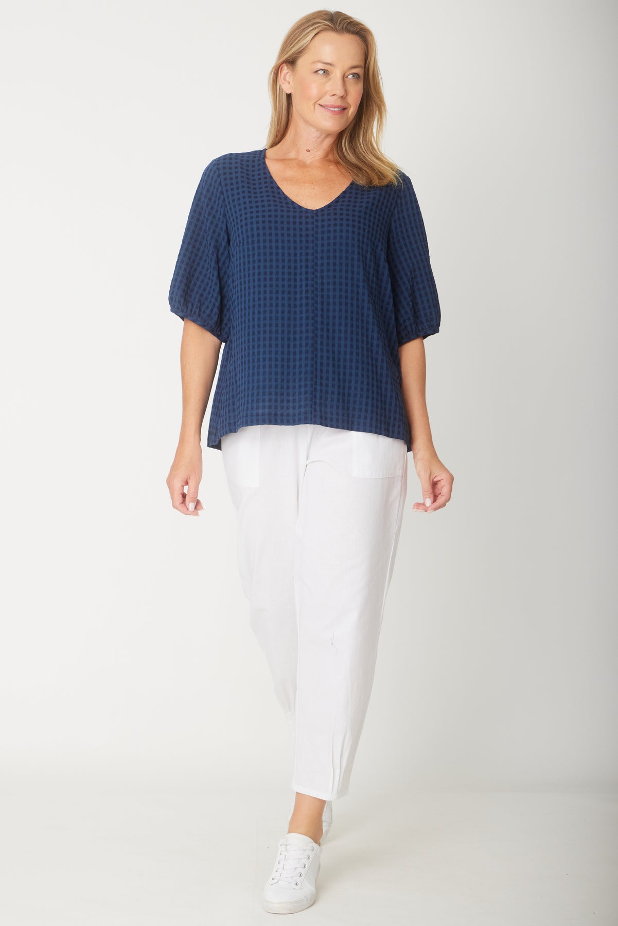 Discover effortless elegance with the Victoria Textured Top. Crafted from a luxuriously soft tonal check fabric, this piece features a flattering vee neckline and relaxed balloon sleeves that move with you. The three-quarter length sleeves strike the perfect balance between coverage and style, while the textured weave adds subtle visual interest. Soft, comfortable, and versatile—this top transitions seamlessly from casual days to dressed-up occasions.