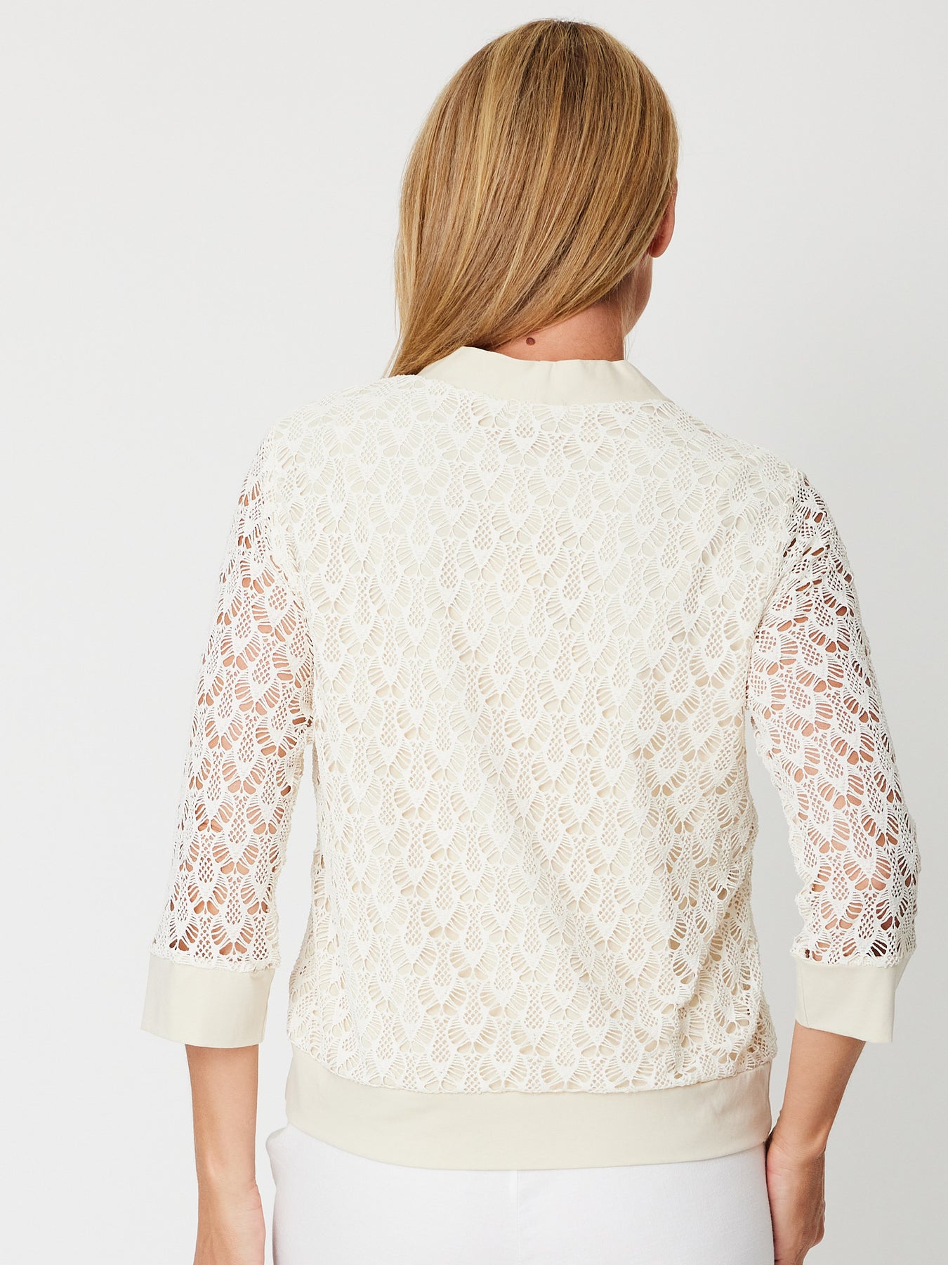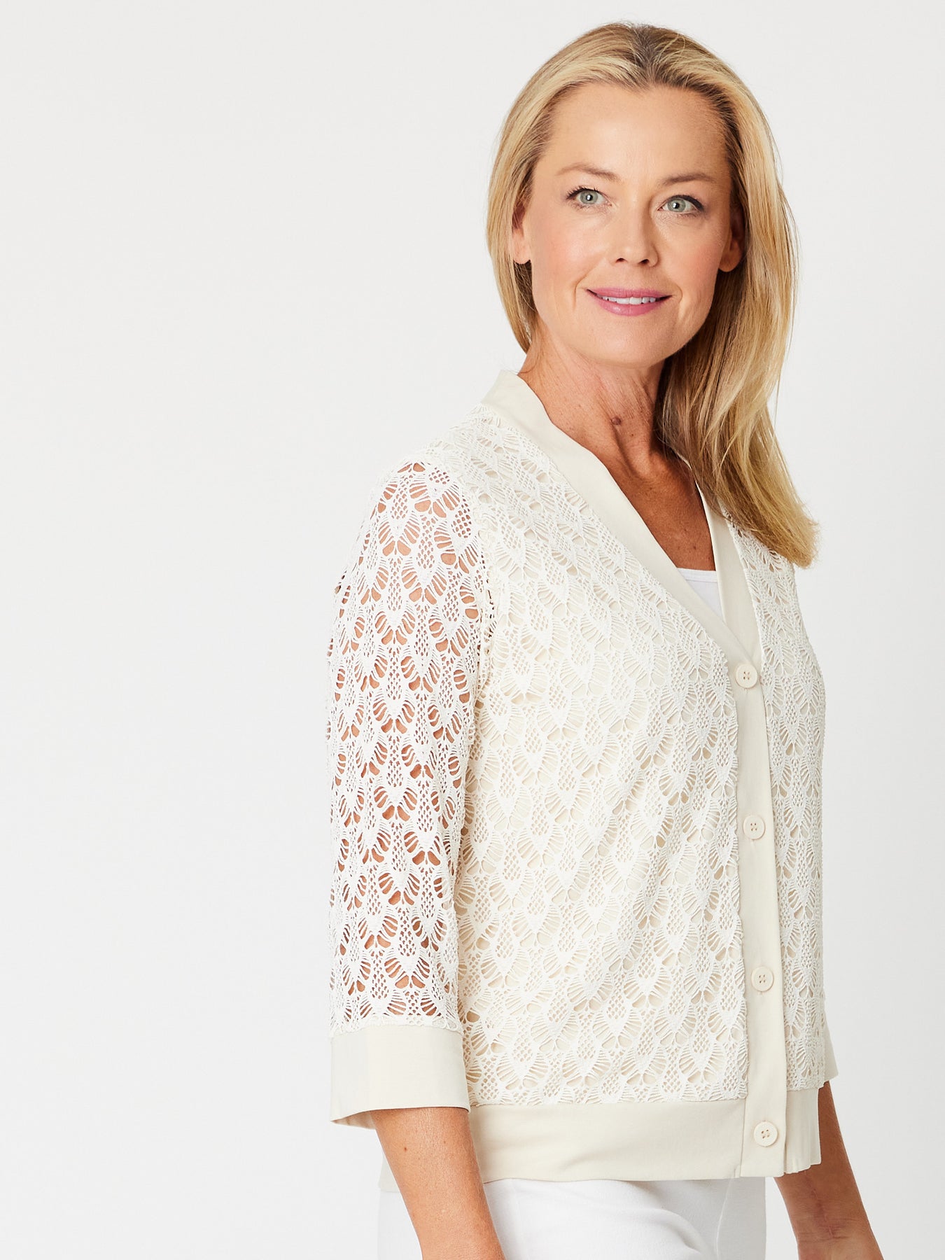 The Crochet like Cardy offers the perfect cover-up with excellent arm coverage, crafted from breathable, holey textured fabric. Its modern bolero design features a flattering cropped shape, enhanced by jersey trim detailing on the placard and hemline, effortlessly blending style and comfort for a chic layering piece.