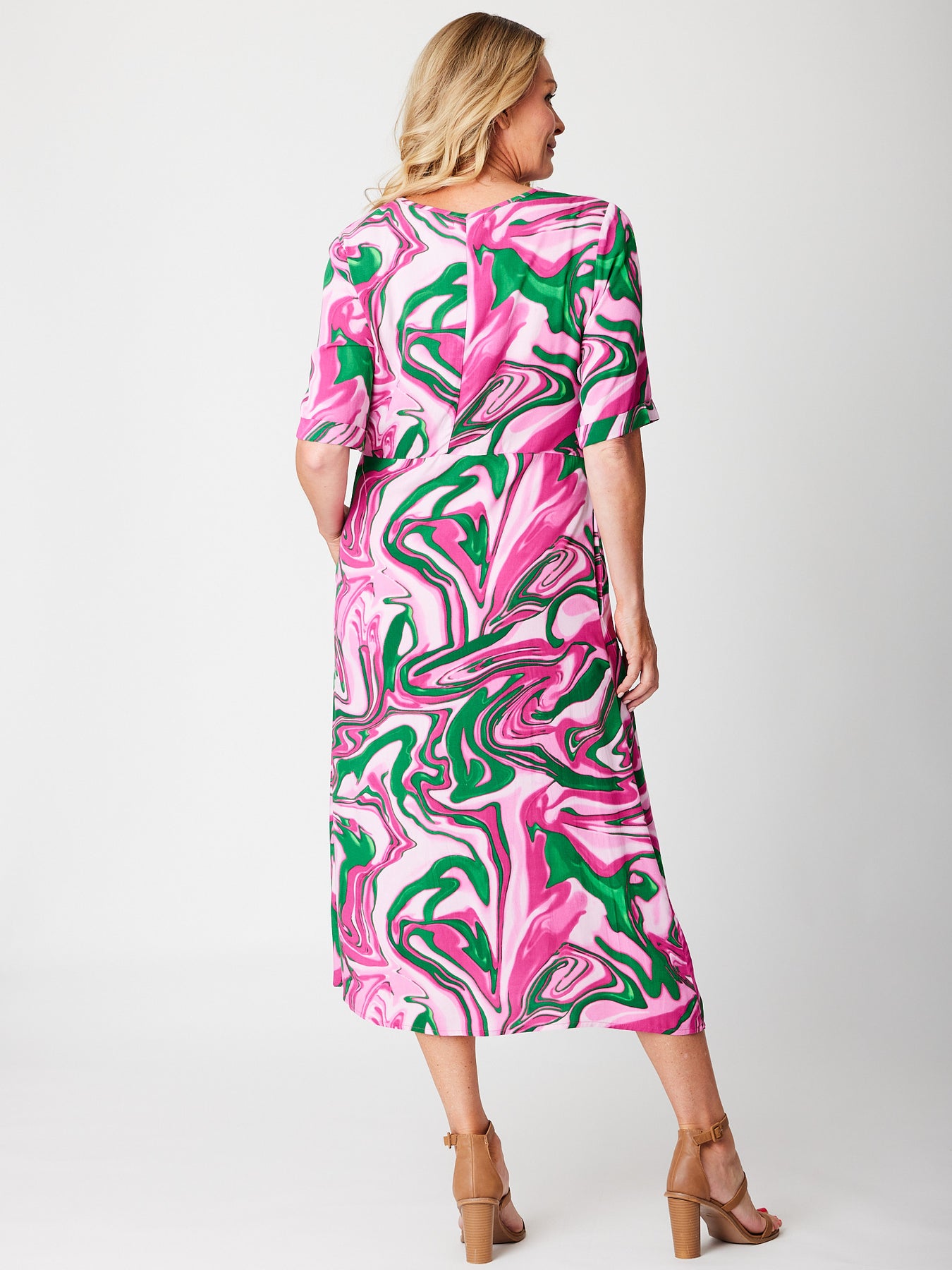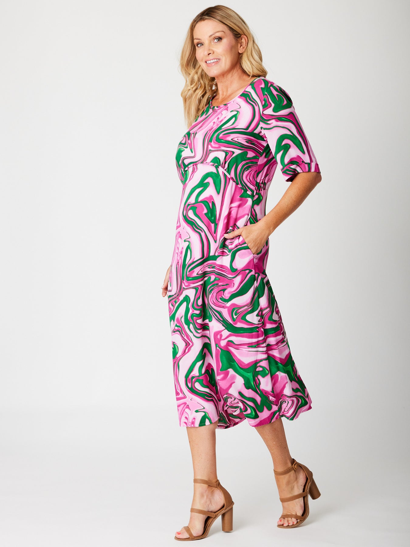 Experience effortless elegance with the Petites Mid Sleeve Dress. Made from breathable rayon fabric, it offers a comfortable, true-to-size fit. Thoughtfully designed with practical side pockets and flattering 3/4 sleeves, this dress features a unique half-circle detail under the bust to enhance your silhouette. Perfect for all-day wear, it combines style and comfort seamlessly.