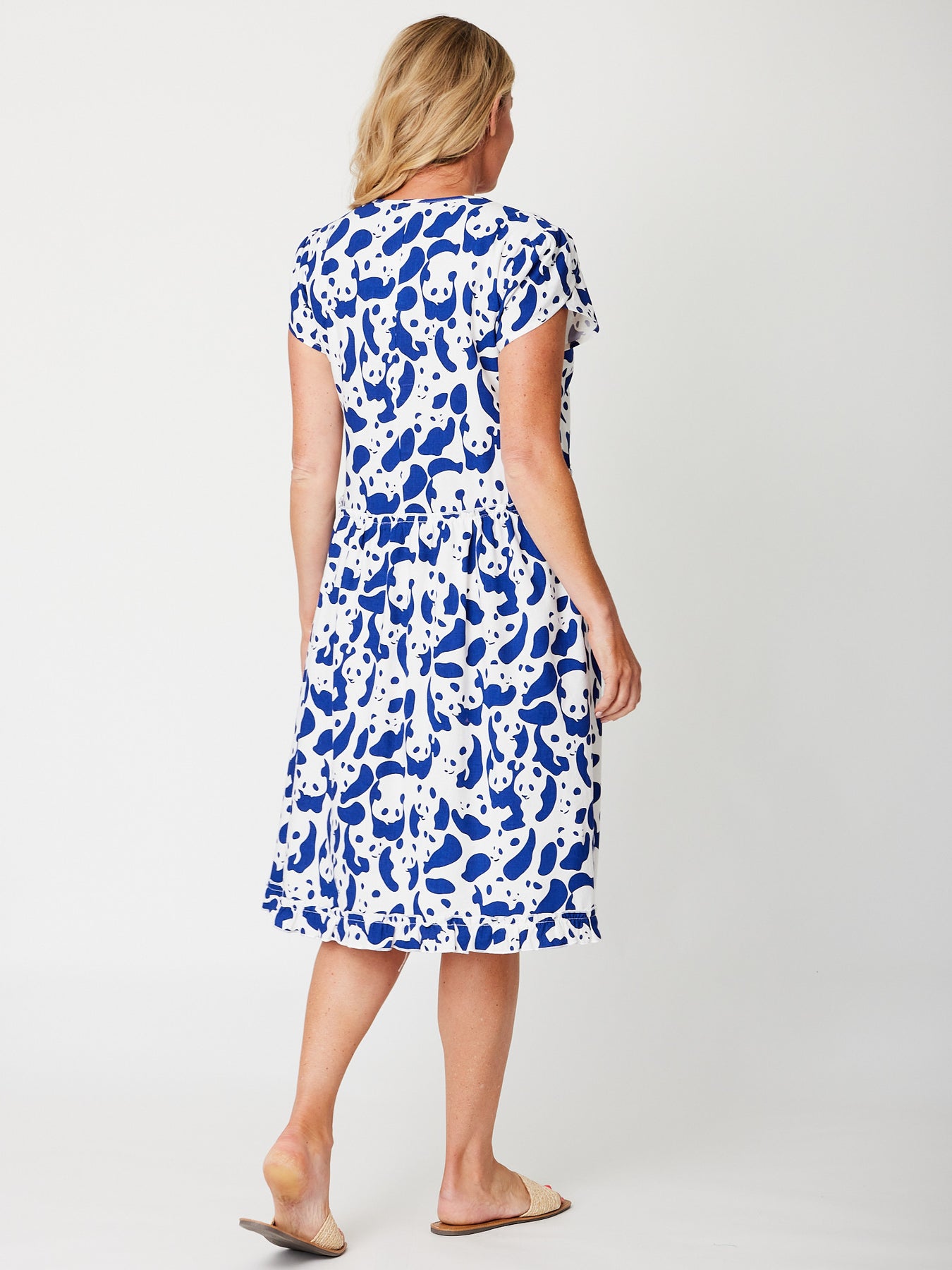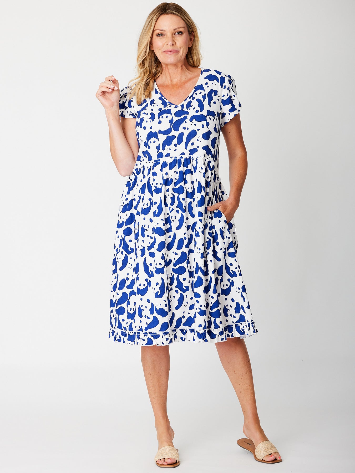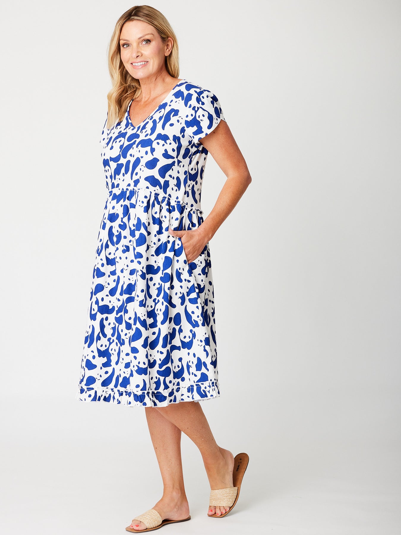 Rufflina Print Cotton Linen Dress - Royal/White - 31706