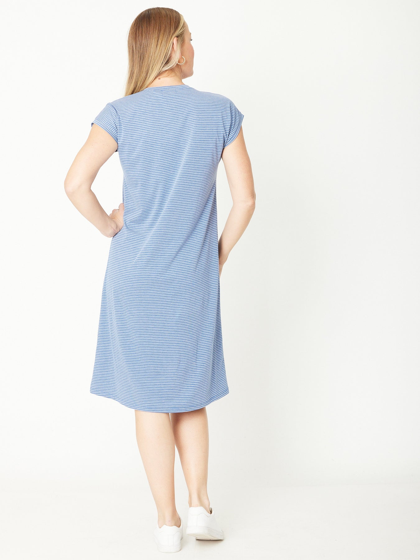 This blue stripe scoop neck T-shirt dress combines casual comfort with practical style. Featuring a front functional pocket and a straight hemline, it’s perfect for effortless days, whether you’re on a cruise holiday or taking the kids to the park. Short sleeves keep it light and breathable, making it your go-to dress for relaxed moments and easy movement.