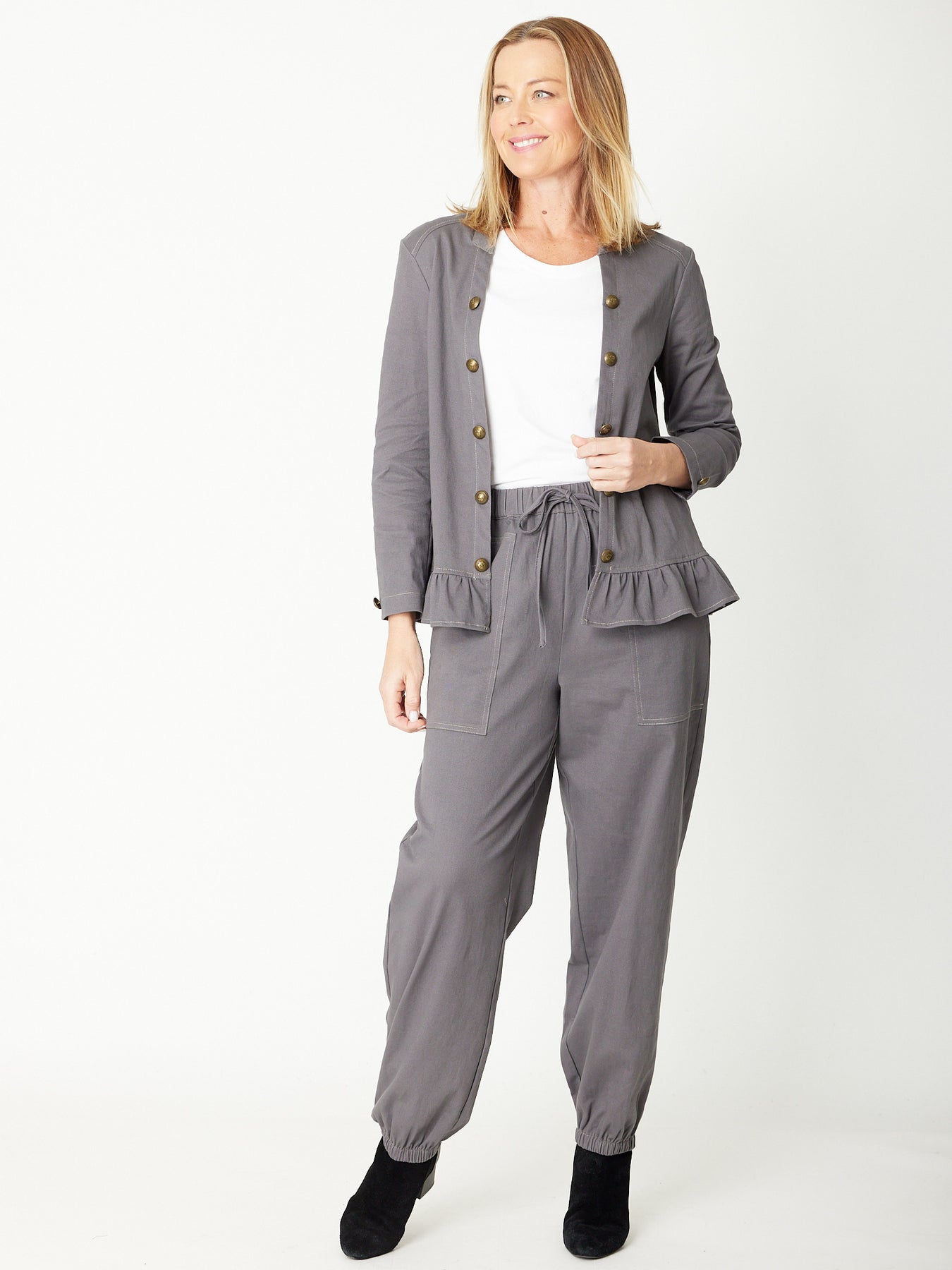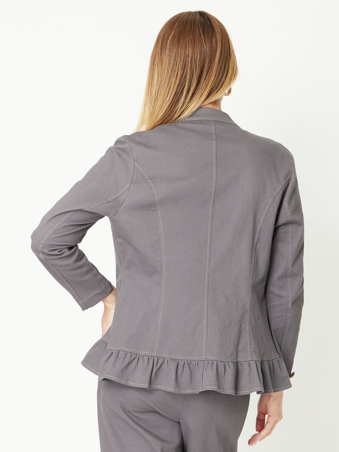 This charming Drill Ruffle Jacket offers a perfect blend of comfort and style. Crafted from durable cotton drill fabric, it features delicate ruffles along the hem and elegant button detailing, adding a playful yet refined touch. Ideal for layering, this jacket delivers a flattering fit with a unique feminine flair to elevate any outfit.