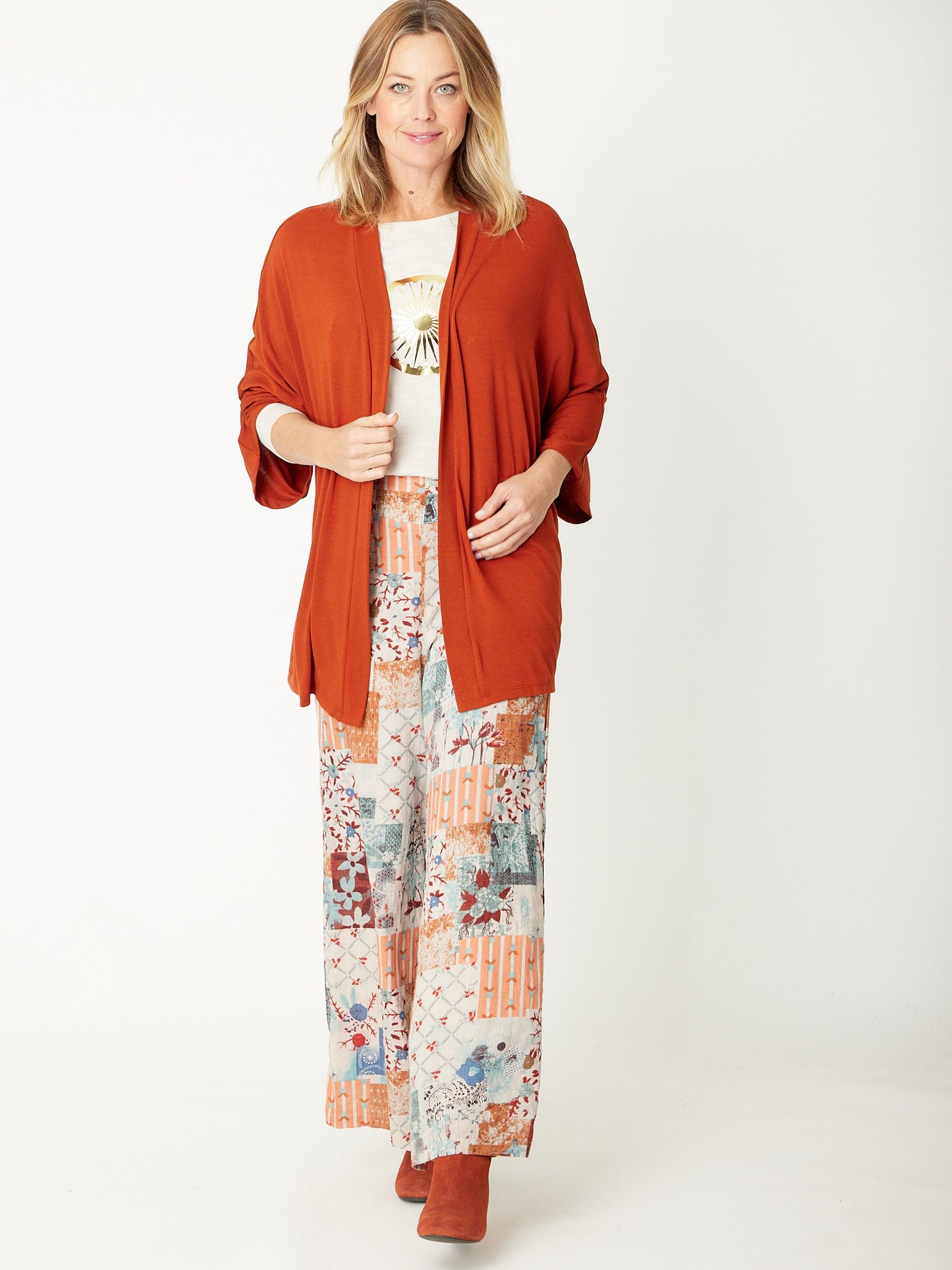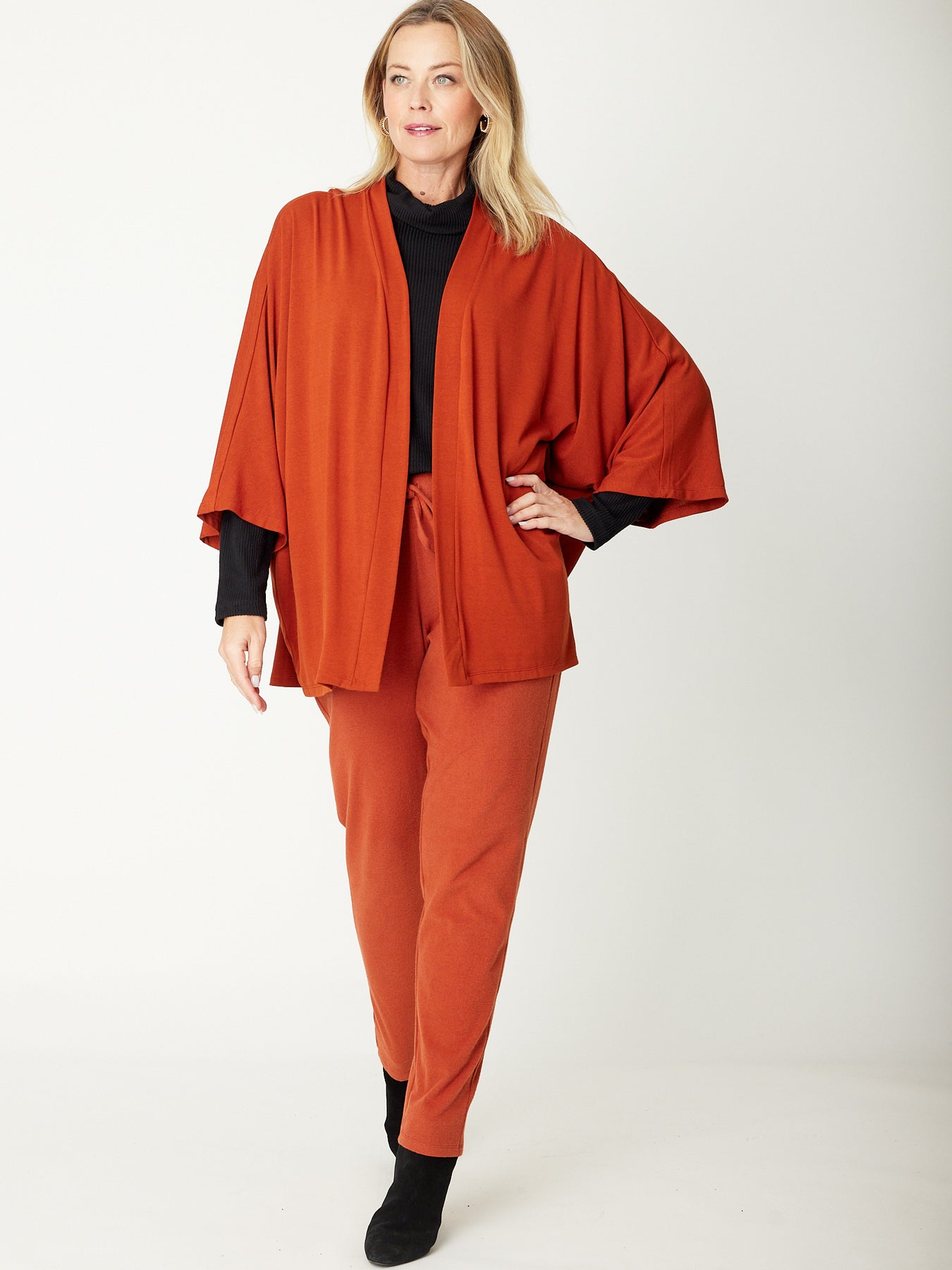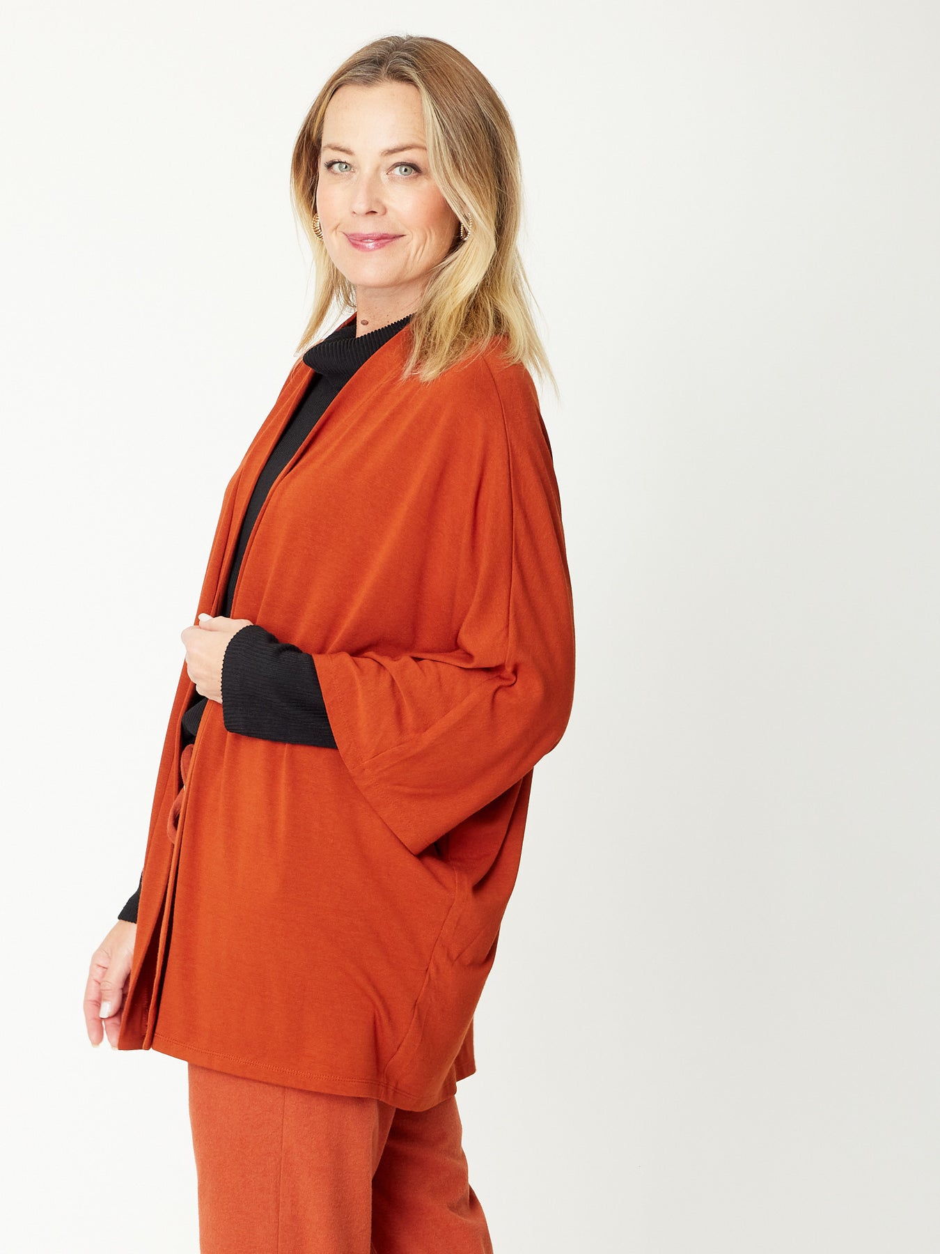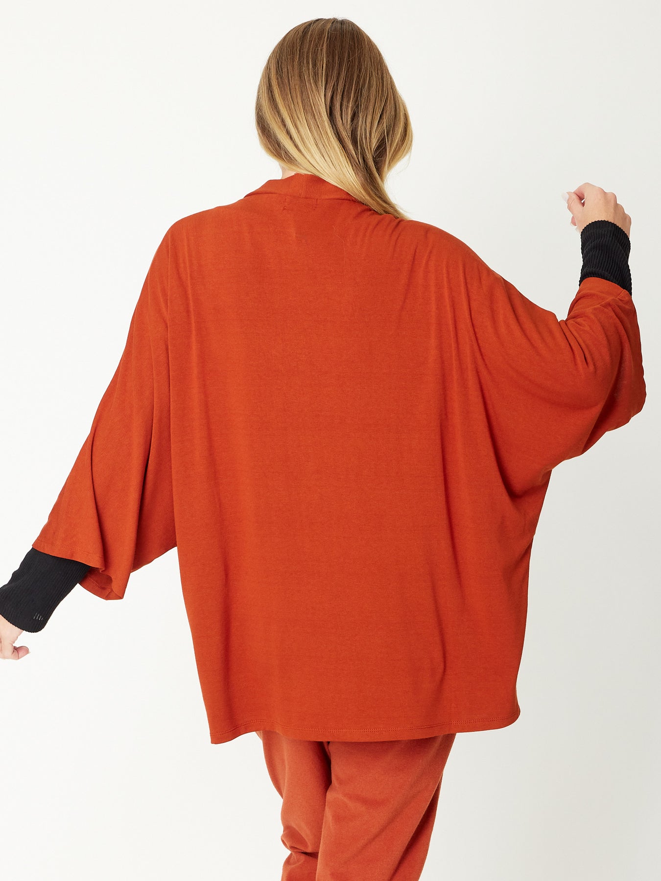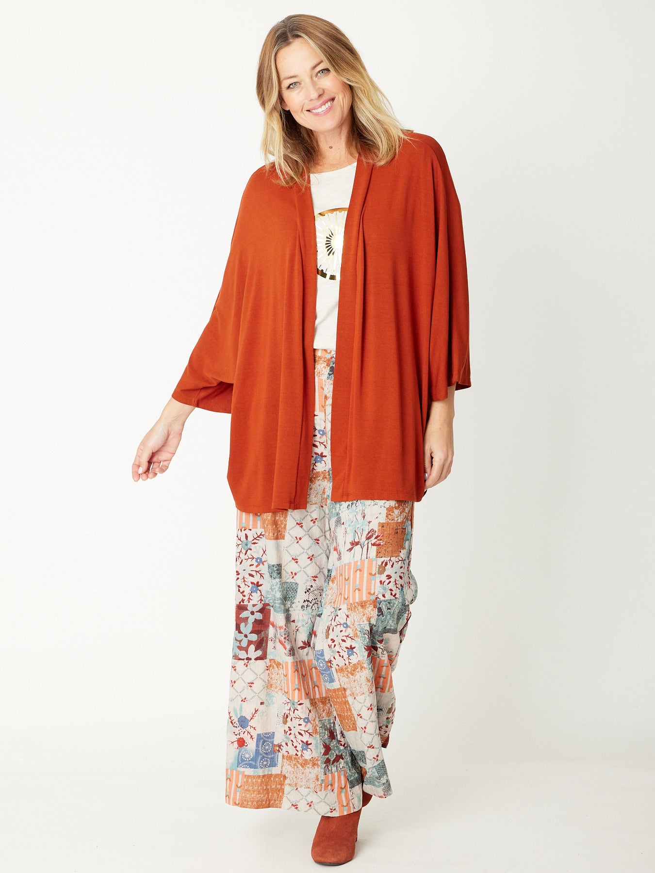 Introducing the Loose Jacket - 30789 in Rust! Stay cozy and stylish with this relaxed kimono style cardy, made from a soft and warm stretch knit. Perfect for cooler days, it's an easy and comfortable cover-up option. Upgrade your wardrobe today!