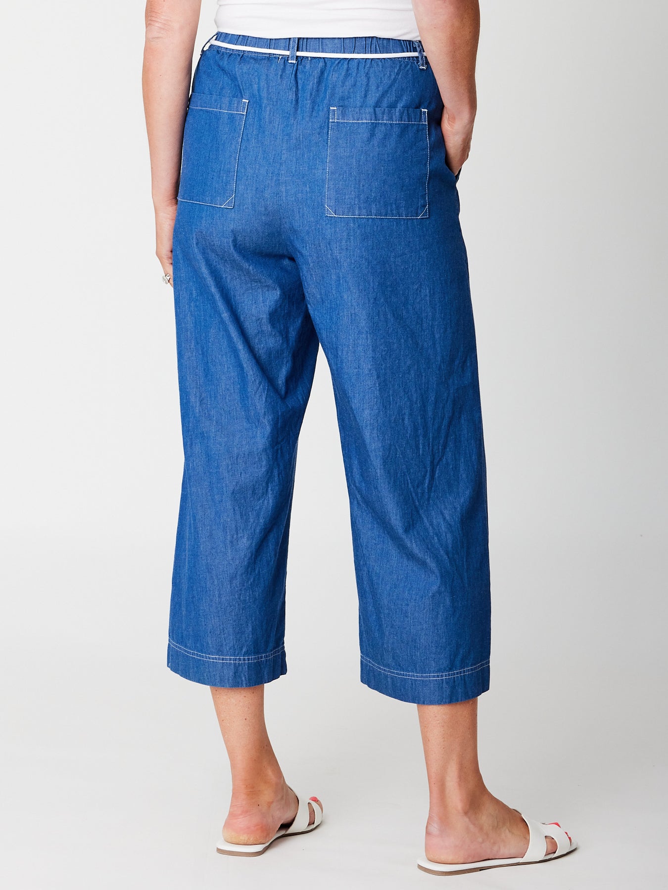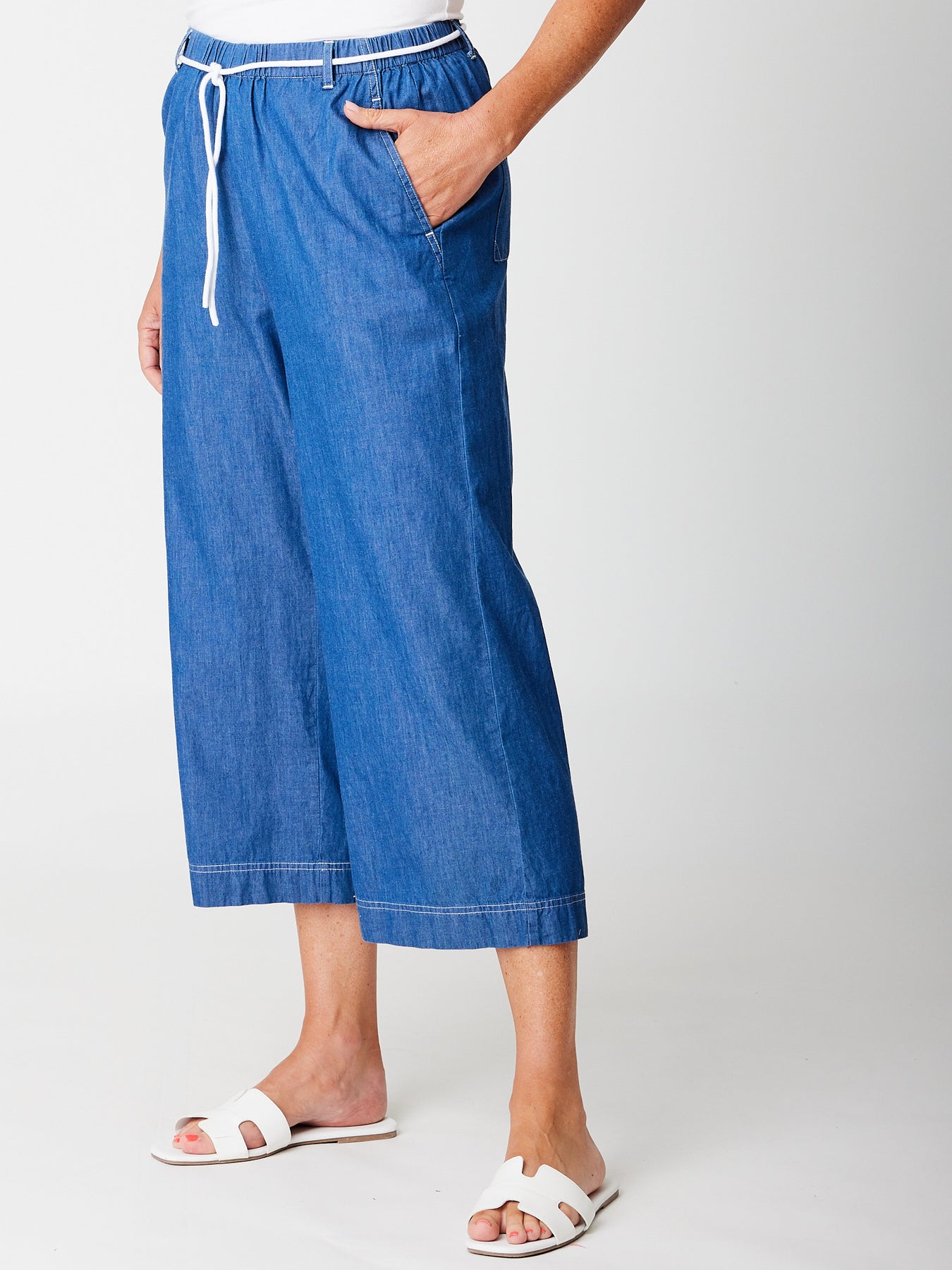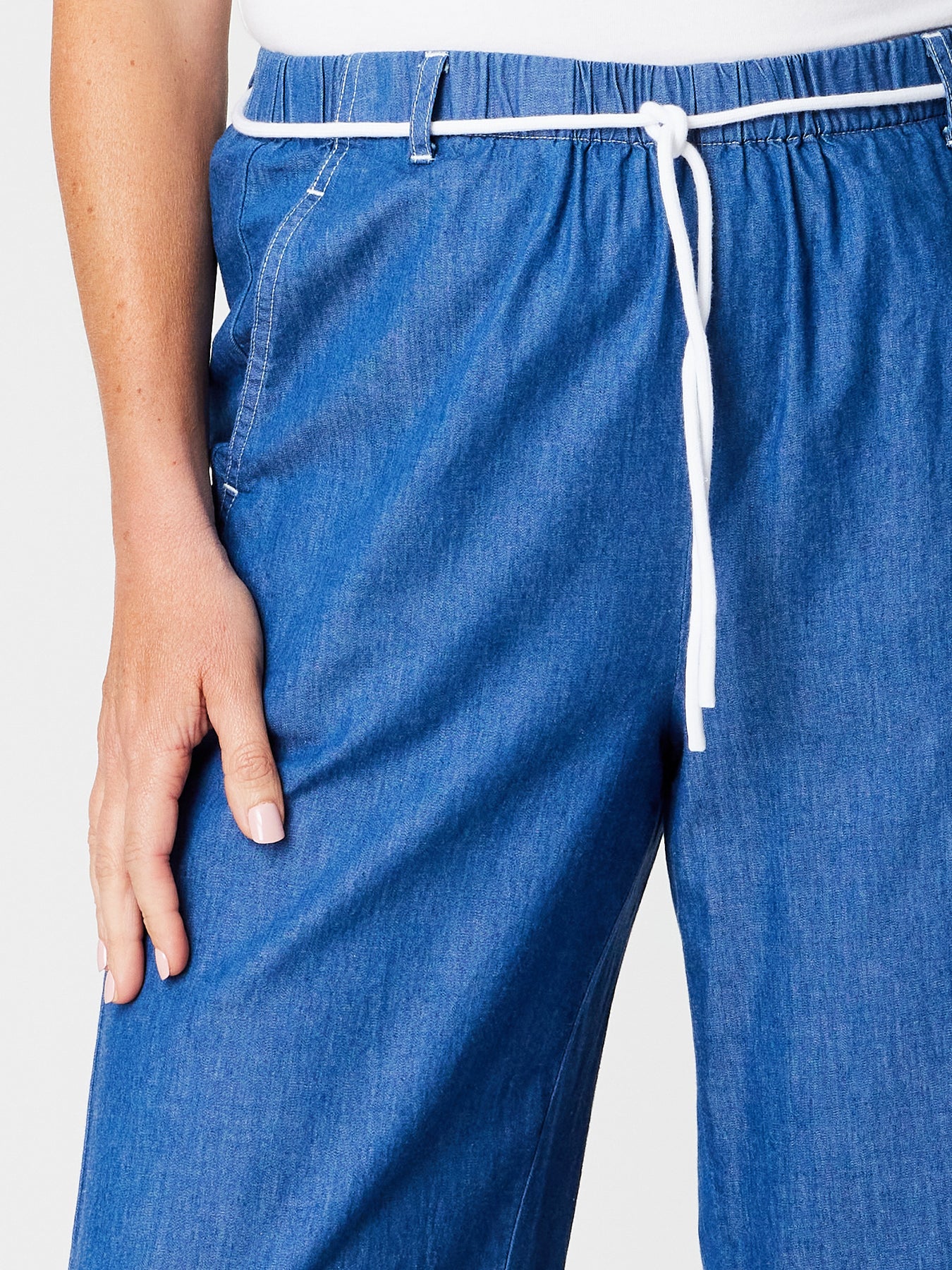 These wide-leg 7/8 denim pants combine comfort and style with a relaxed 3/4 length fit. Featuring a pull-on elastic waistband and a rope tie for an adjustable, secure fit, they are perfect for effortless everyday wear. Practical side pockets add convenient storage without compromising the sleek silhouette. Ideal for casual outings, these pants offer both ease and contemporary appeal.