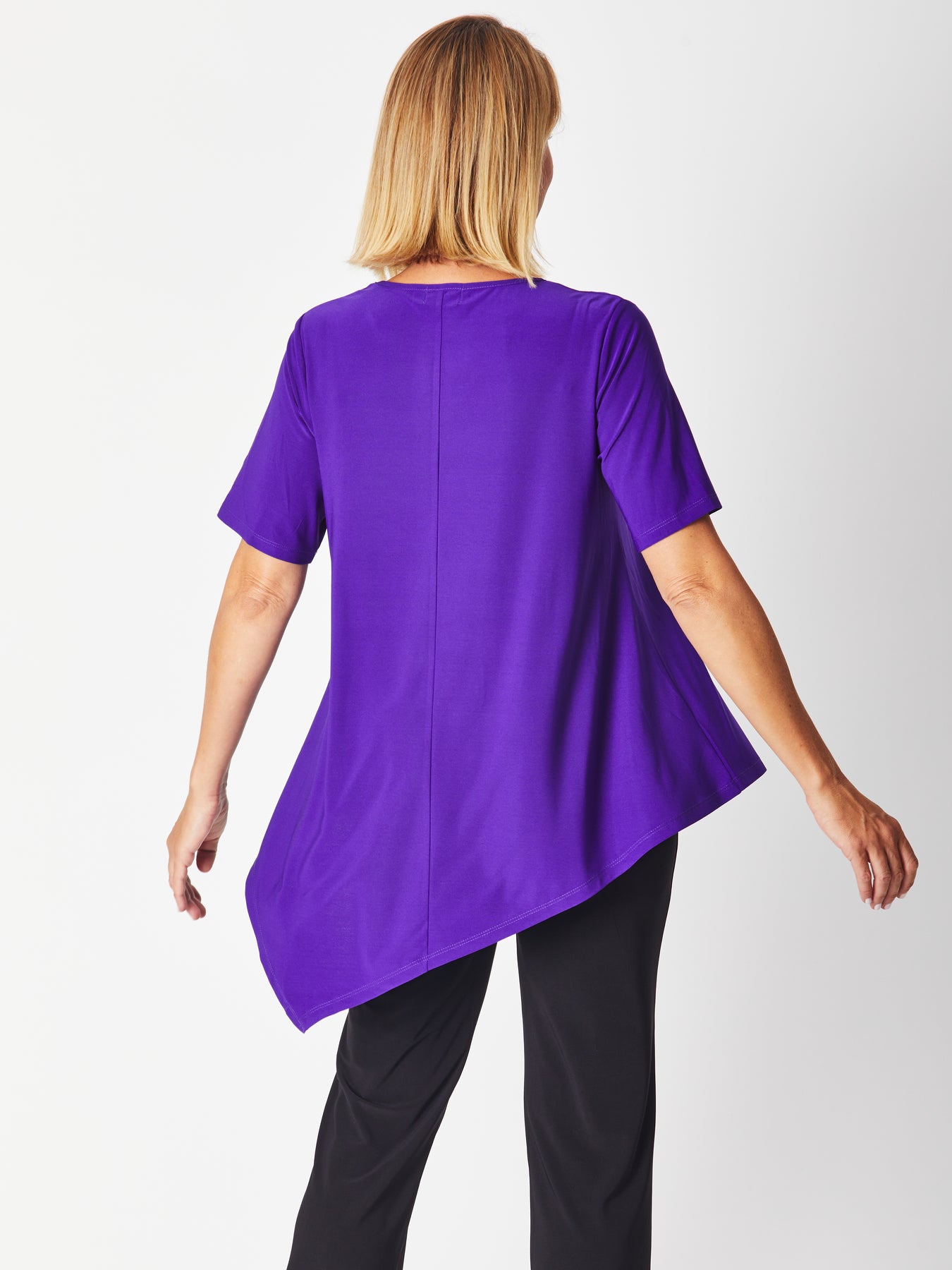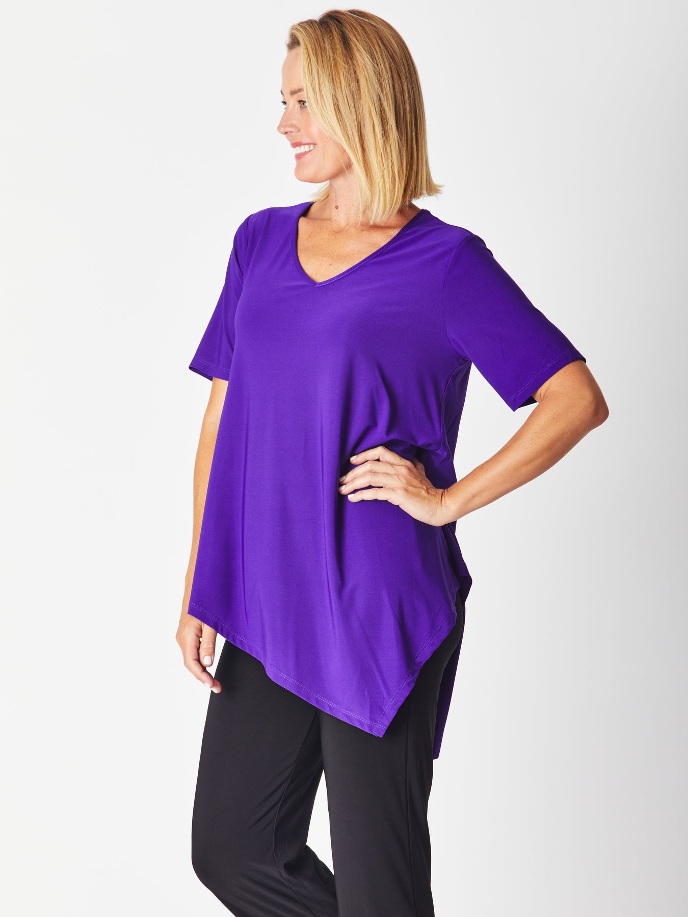 This stylish DITZY DELIGHT CORE TOP by Cordelia St is simple yet trendsetting! Cut with asymmetric features, it has a V-neck and short sleeves then finishes with a fishtail hem offering a draped feel.