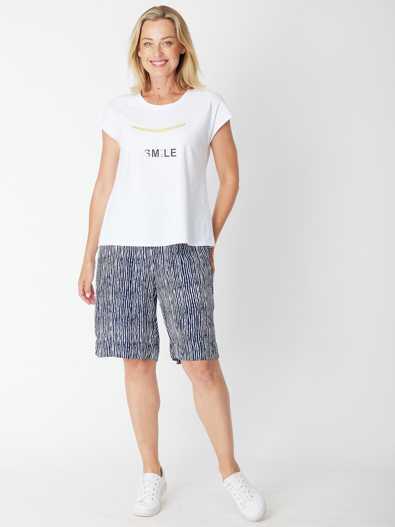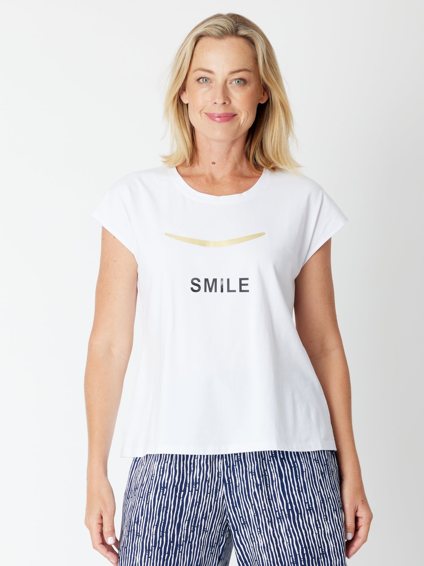 Introducing the Smile Swing Tee! This round neck, cap-sleeved tee is made with a soft and comfortable cotton blend fabric. The front features a golden foil "smile" for a touch of elegance. Designed to be true to size and inspire positivity with a simple word. Order yours now!