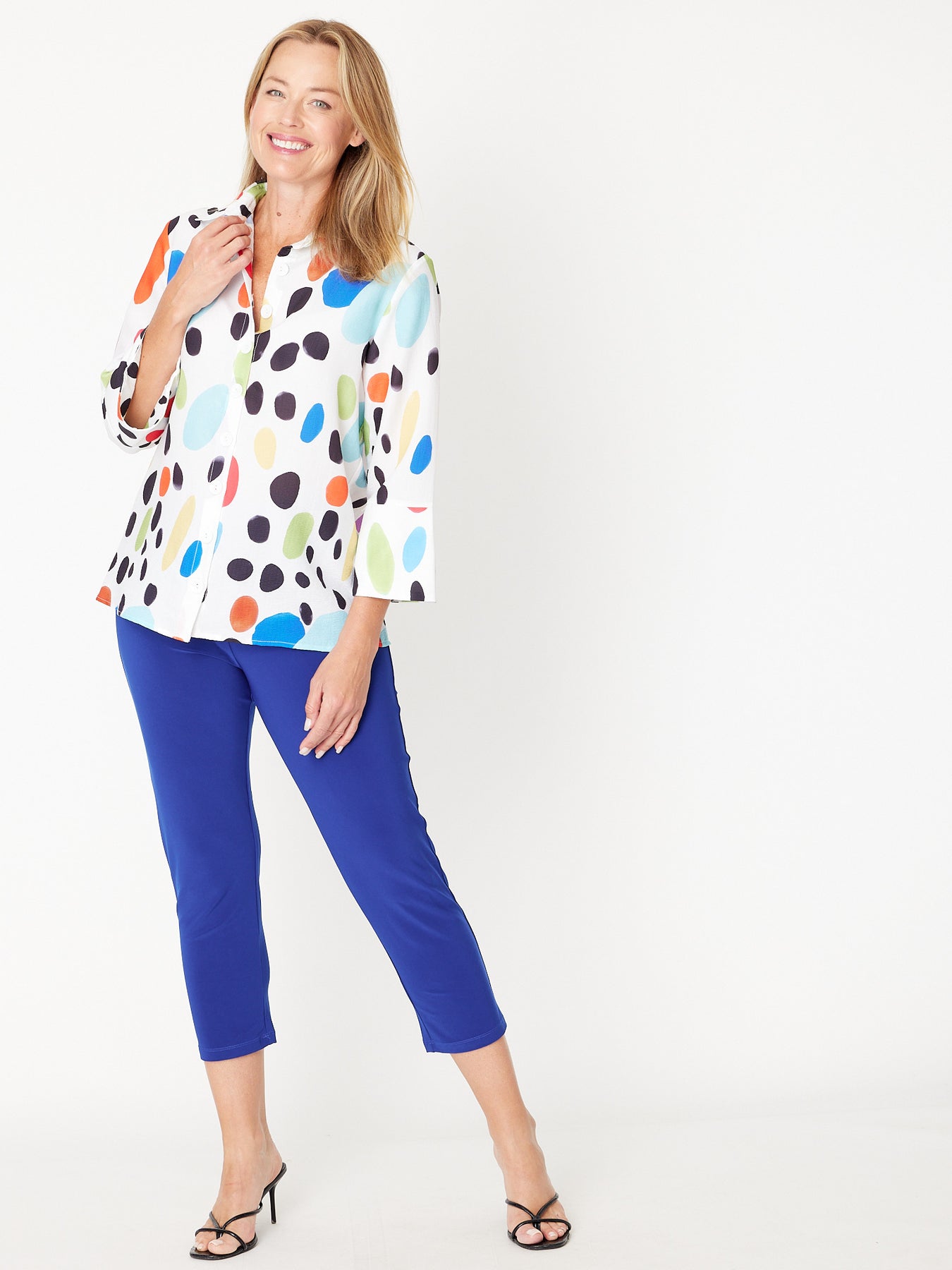 Brighten your wardrobe with the Frankie Shirt, featuring playful multi-coloured spots on a textured fabric. Its 3/4 sleeves end in charming bell cuffs, adding a stylish flair complemented by fun button-through details. Perfect for effortless, eye-catching style that stands out with subtle sophistication.