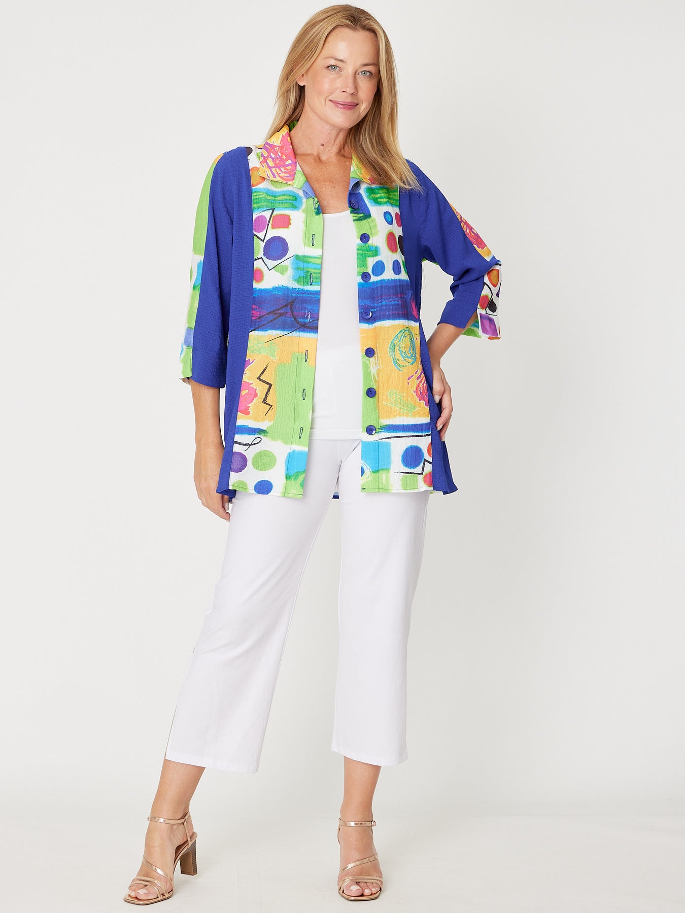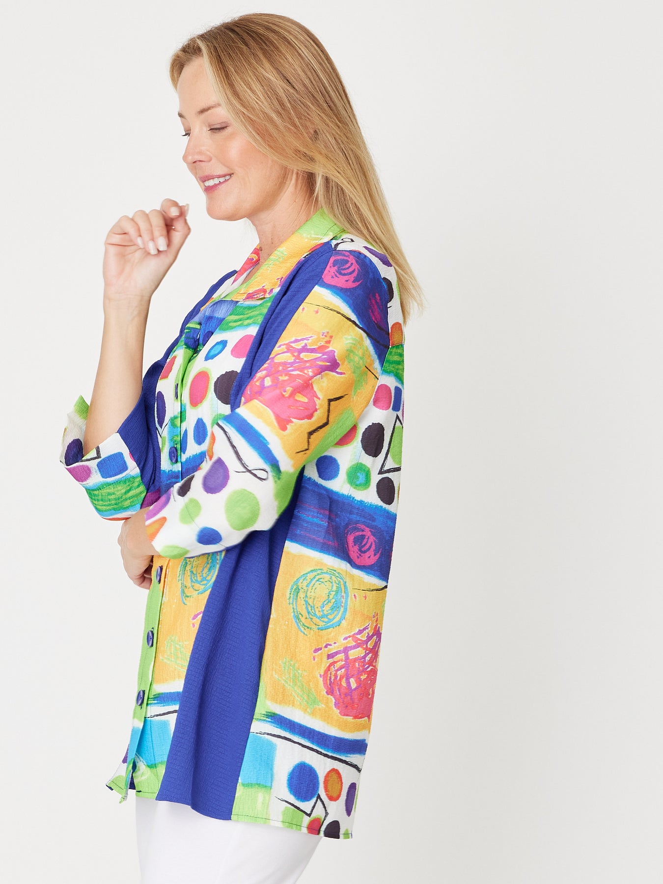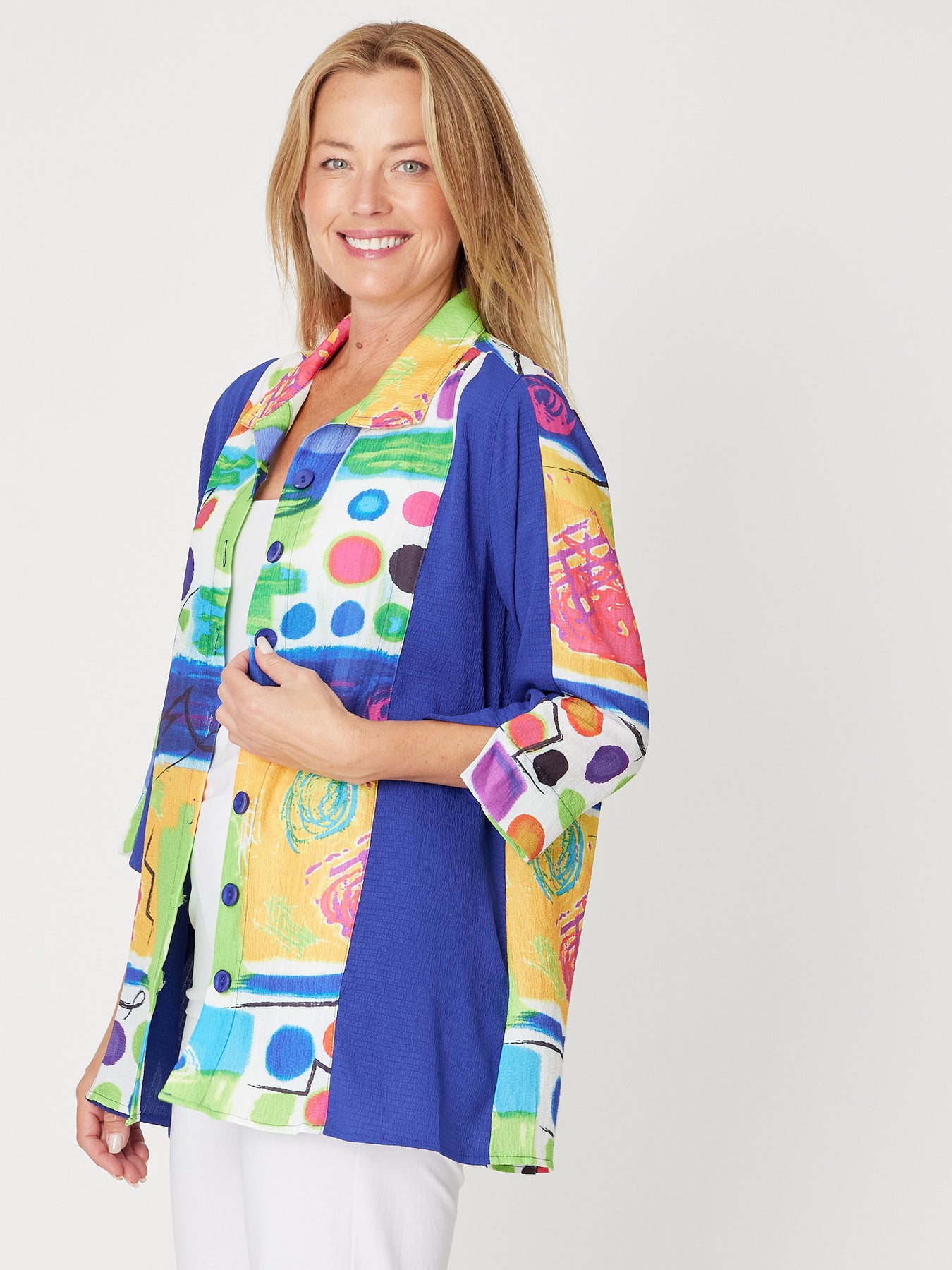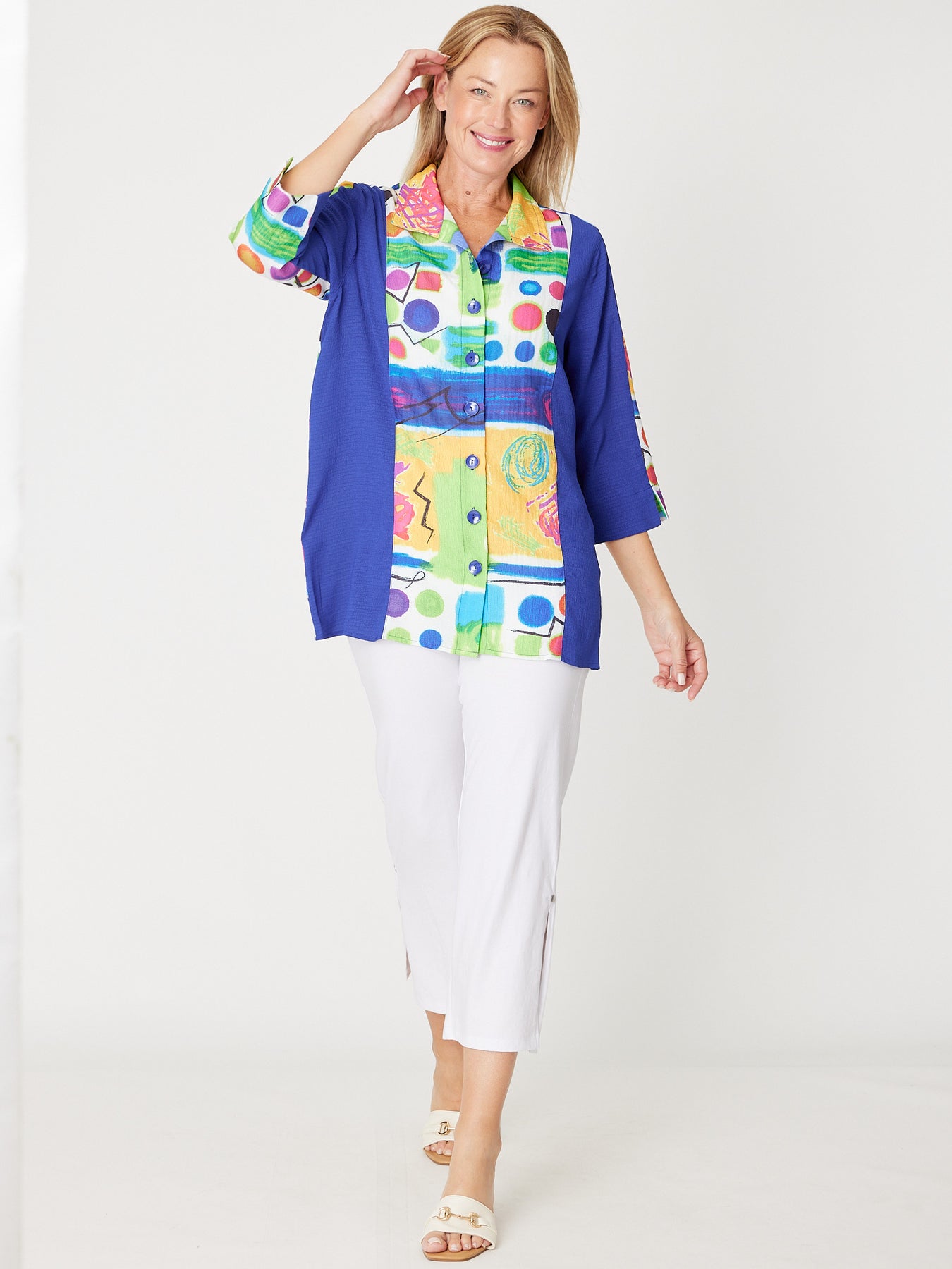 The Frankie Spliced Shirt in Royal offers a striking blend of bold prints and vibrant solid hues, creating a fresh and unique look. Crafted from textured fabric, this longer-line tunic features a button-through front for easy wear and added style. Its relaxed fit and eye-catching design make it perfect for those who want to stand out with effortless confidence and comfort.