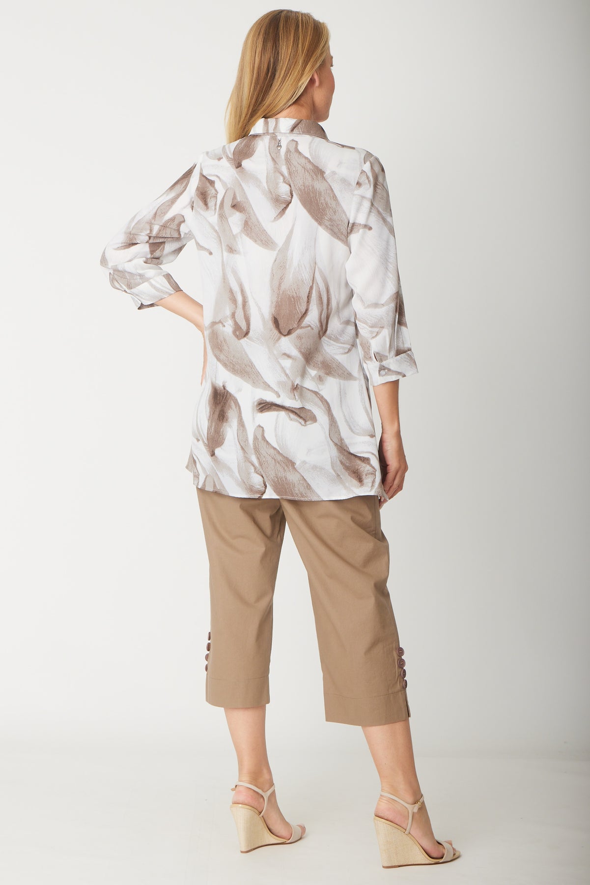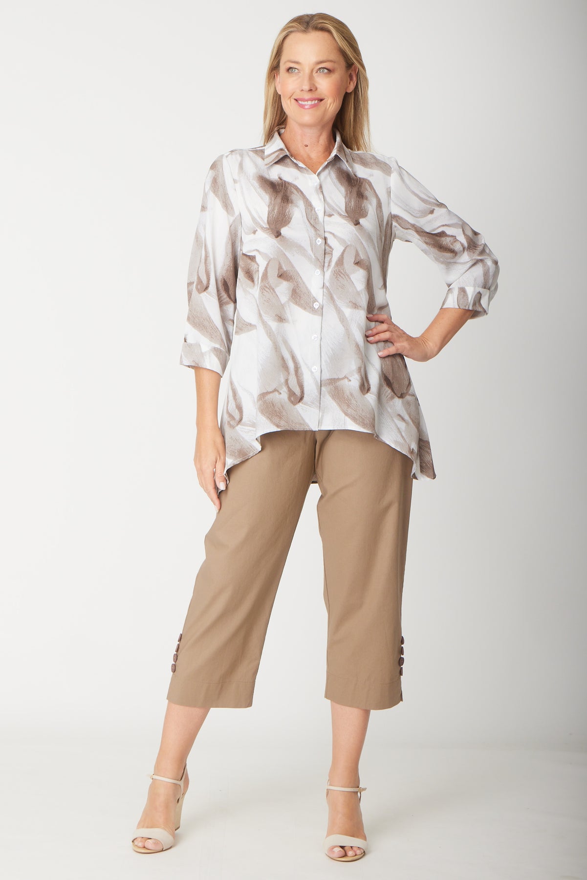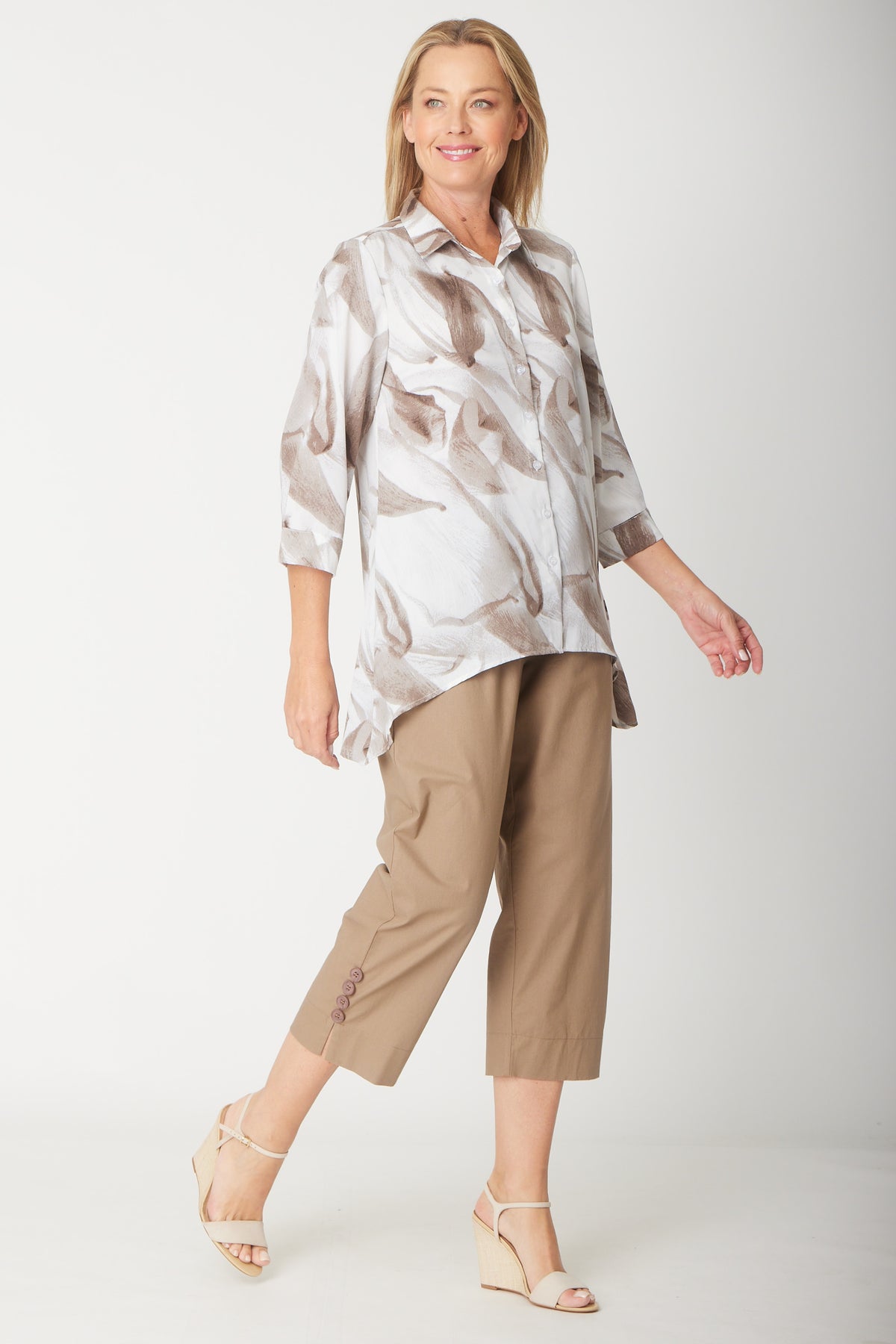 This Water Colour Print Shirt in Latte offers a stylish, relaxed fit with its 3/4 sleeves and longer tunic length, slightly extended at the back for added coverage. Featuring a classic button-through design and collar, its white base is enlivened by a subtle water splash print, making it perfect for effortless, everyday elegance.