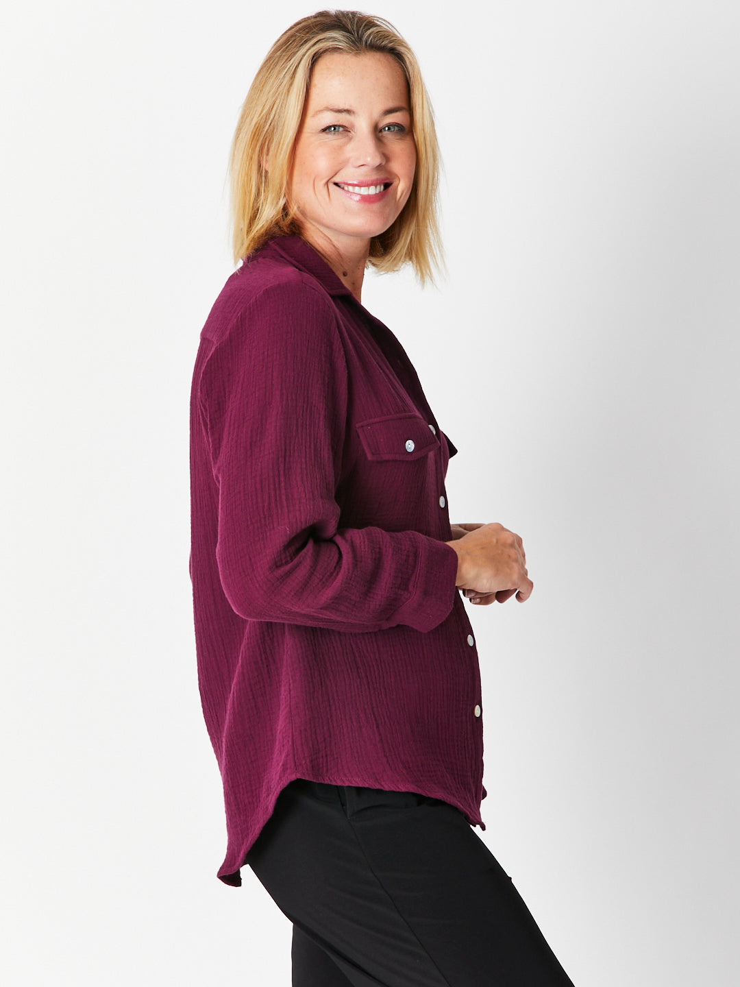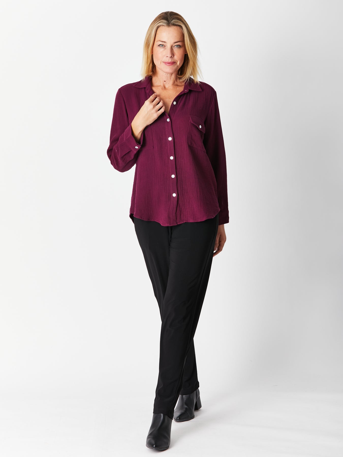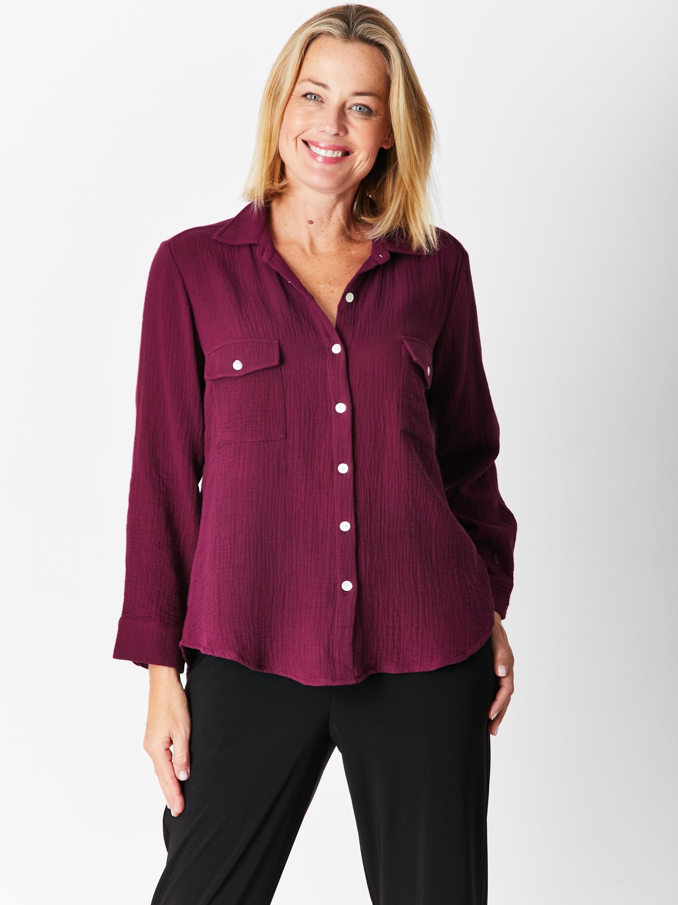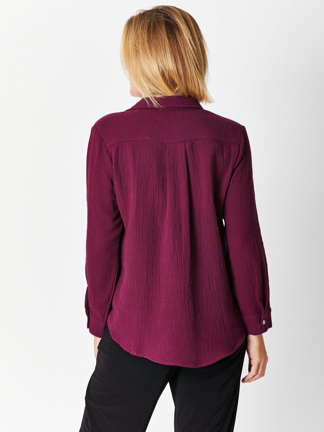 This classic long-sleeve bonded cotton shirt offers timeless style and versatile comfort. Made from soft, breathable fabric similar to cheesecloth but opaque, it ensures a lightweight feel without transparency. The sleeves can be rolled up for a relaxed look, perfect for day-to-night wear. Choose your usual bust size for the best fit and enjoy effortless elegance that adapts to any occasion.