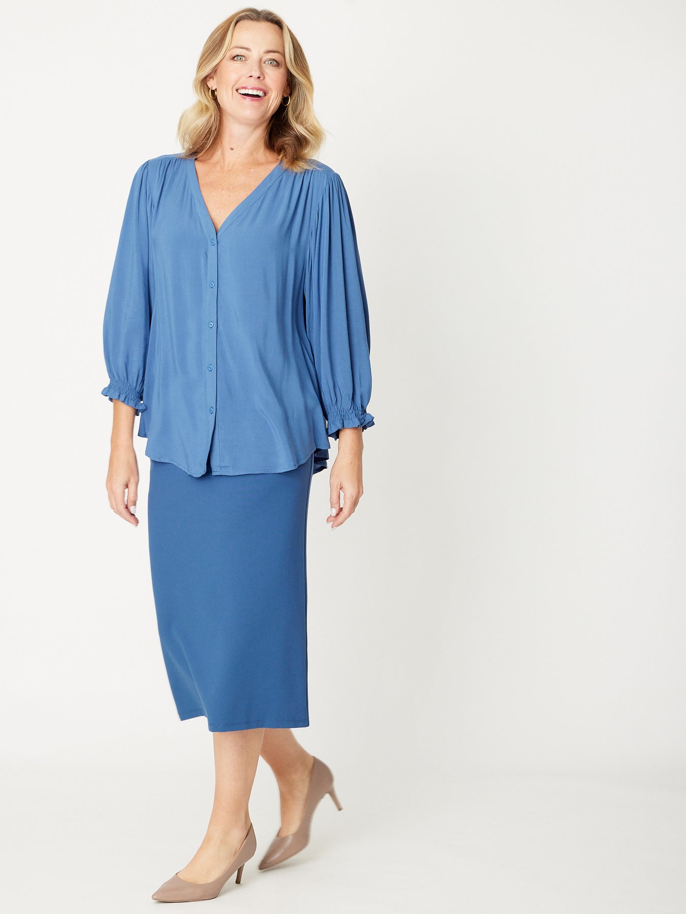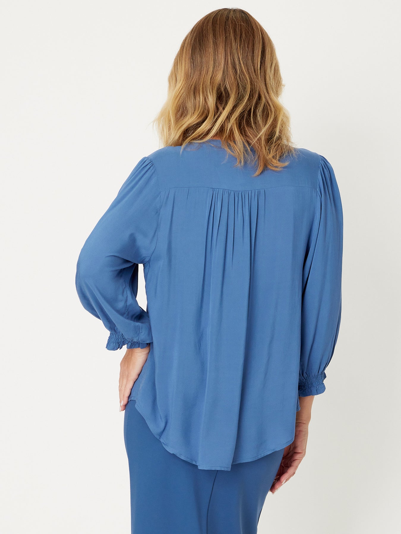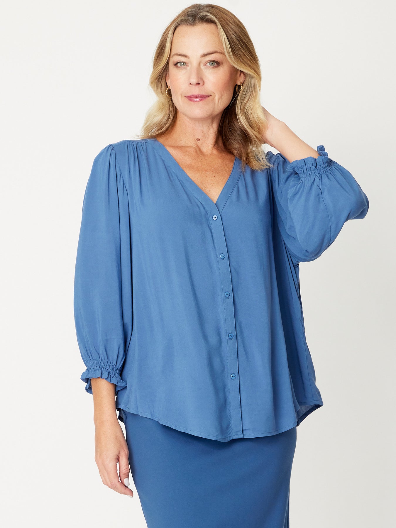 This Gypsy Core Top features a soft button-through V-neckline and elegant gathers that add subtle texture and charm. The 3/4 sleeves end in elastic cuffs, providing a comfortable fit and a touch of vintage-inspired style. Perfect for layering or wearing on its own, this top blends effortless comfort with distinctive design.