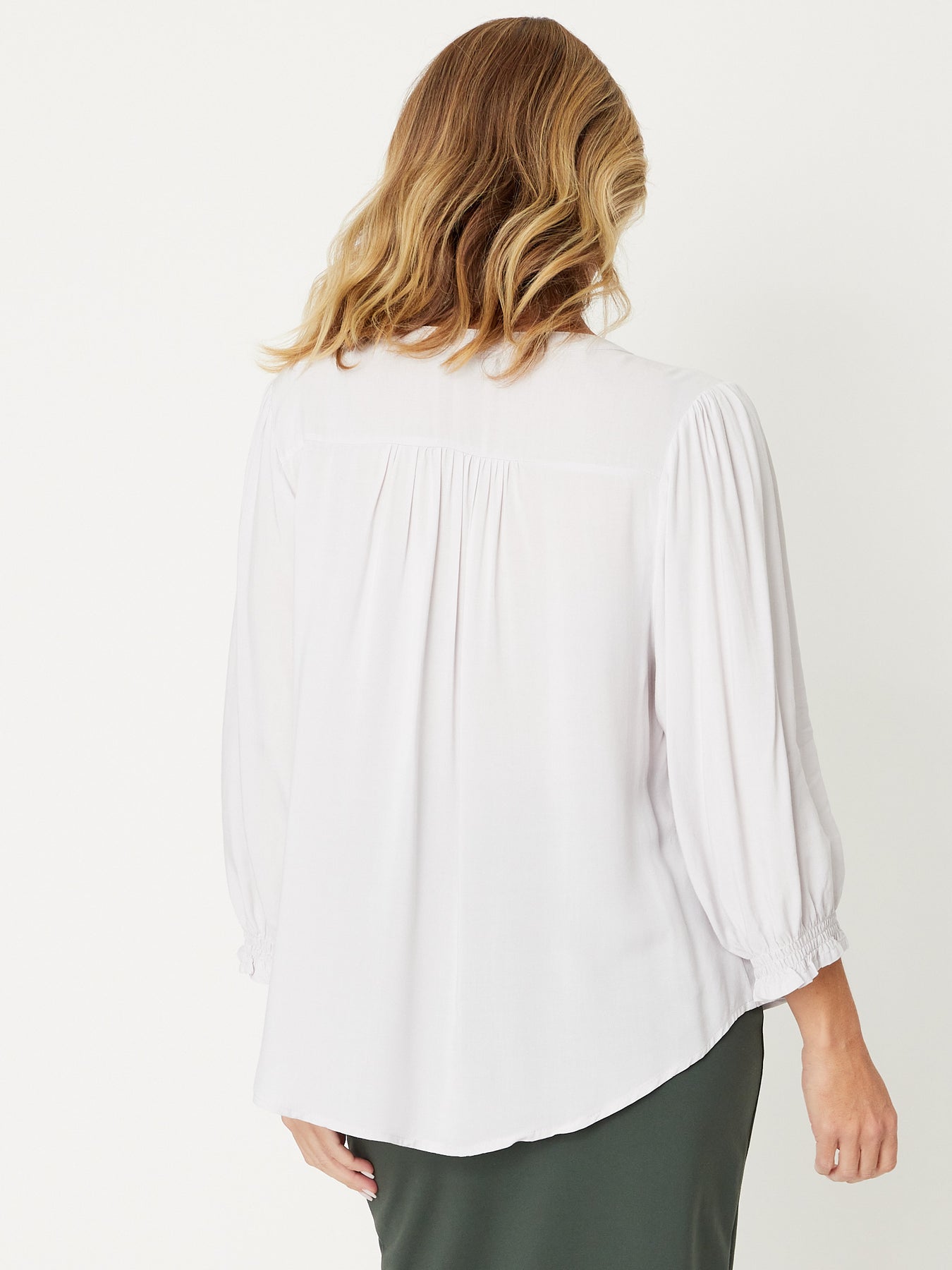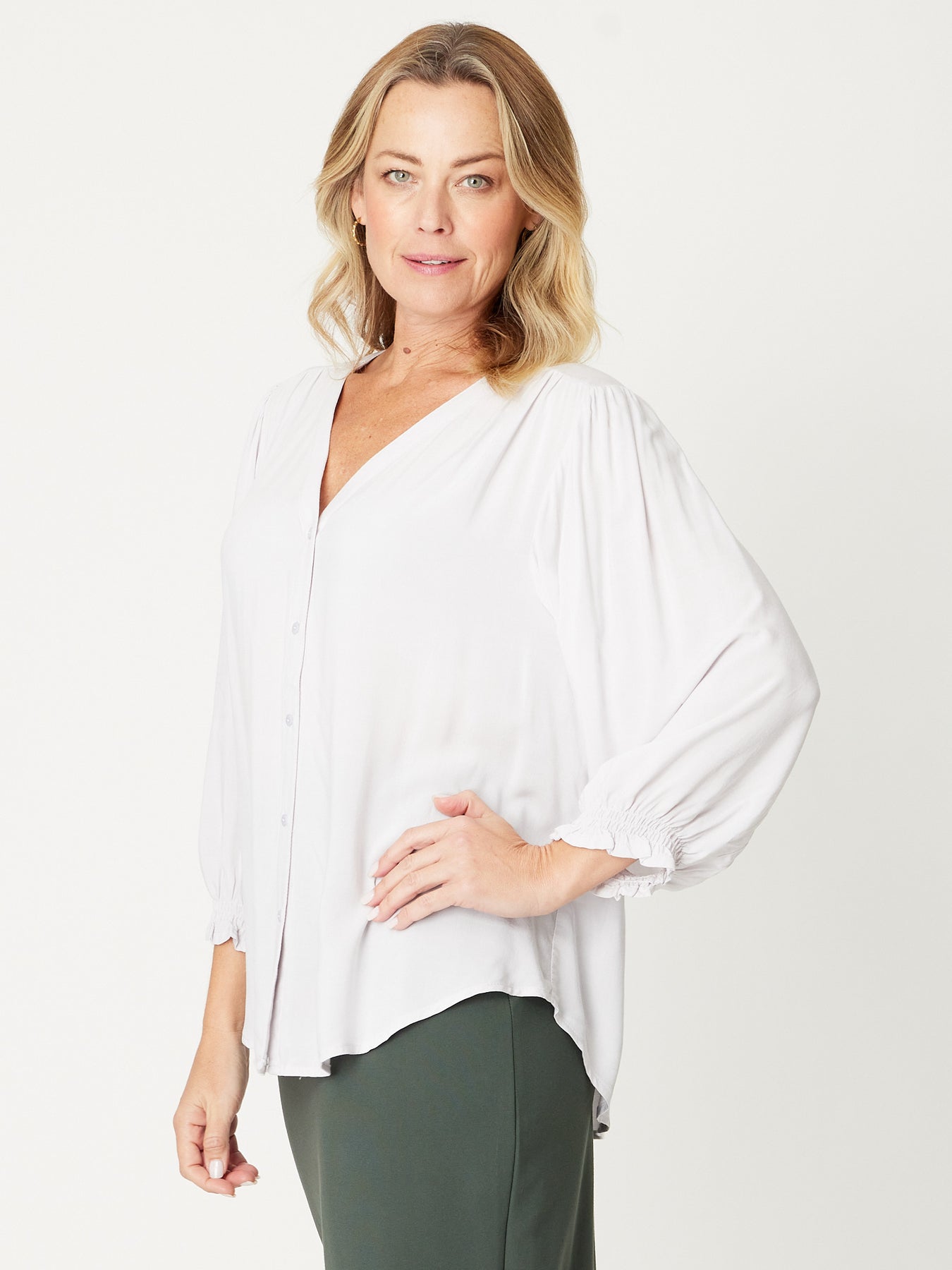 This Gypsy Core Top features a soft button-through V-neckline and elegant gathers that add subtle texture and charm. The 3/4 sleeves end in elastic cuffs, providing a comfortable fit and a touch of vintage-inspired style. Perfect for layering or wearing on its own, this top blends effortless comfort with distinctive design.