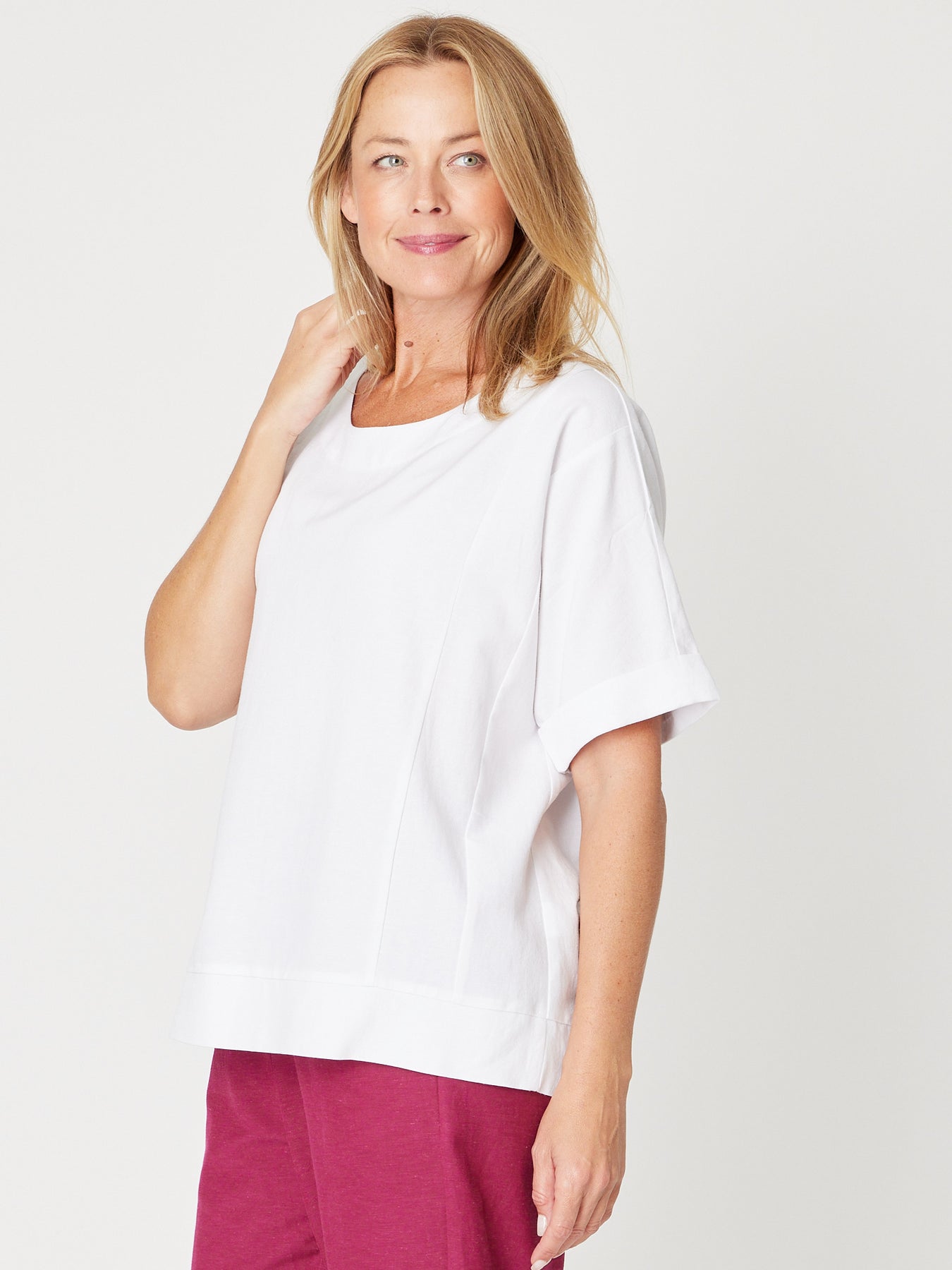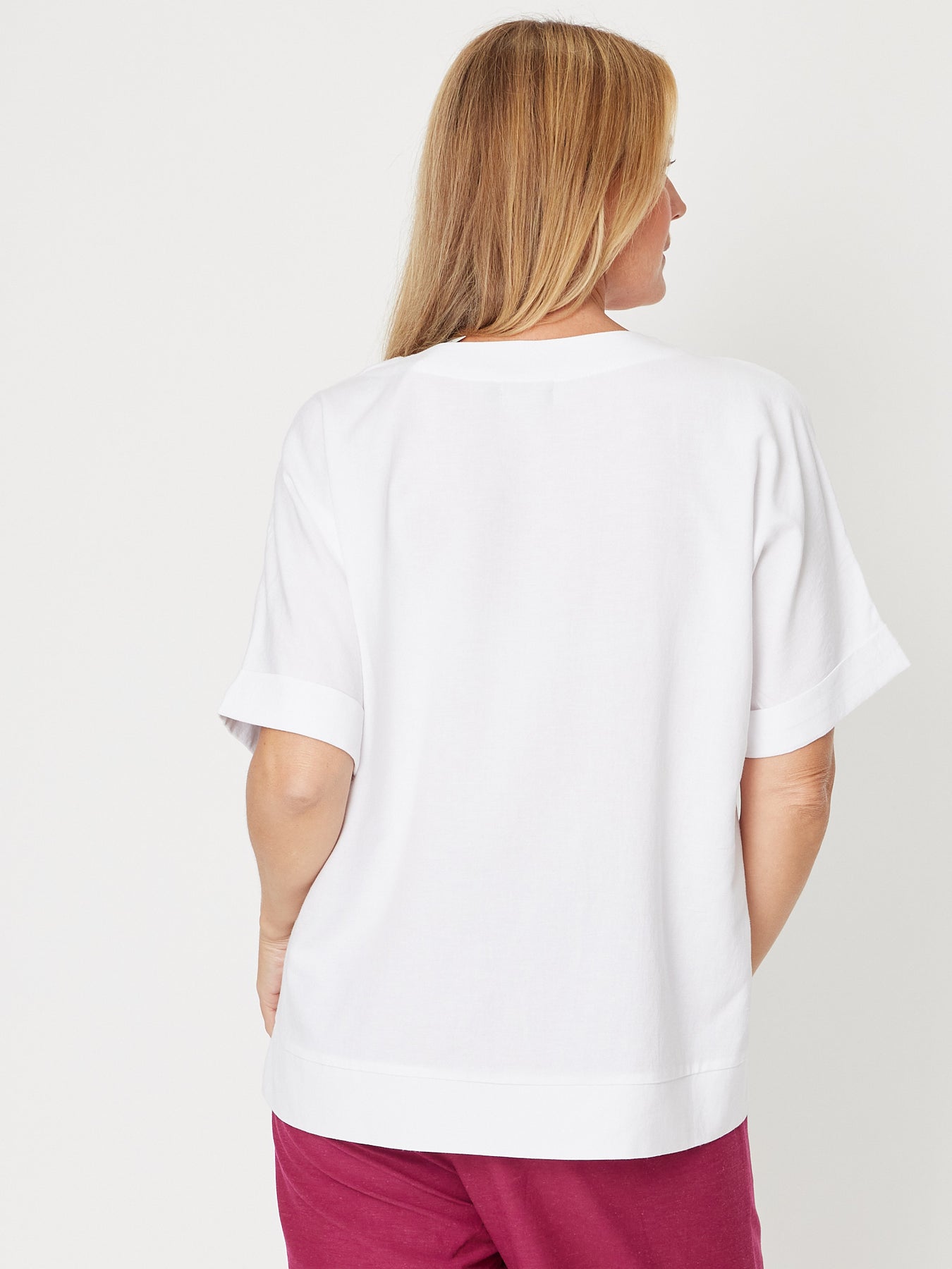 Experience effortless style with the Linen Shores Top in White. Crafted from a breathable linen blend, this relaxed longer-line top features a flattering scoop neck and comfortable extended short sleeves, perfect for warm days. Its airy fabric and easy fit make it an ideal choice for casual outings or layering, combining comfort and timeless elegance in one versatile piece.