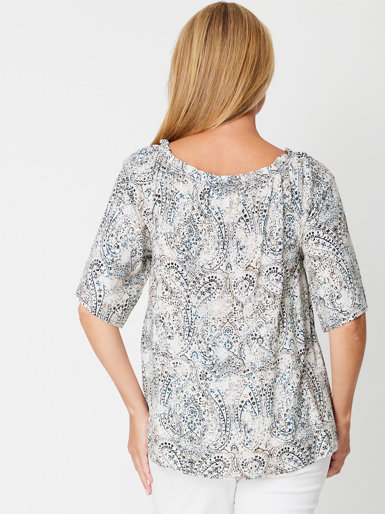 Embrace effortless style with the Oakley Top. Featuring a versatile elastic neckline, it can be worn on or off the shoulders for a charming peasant-style look. The mid-length sleeves and lightweight, floaty rayon fabric ensure comfort and breathability, perfect for warmer days. This top combines feminine appeal with easy elegance, making it an ideal addition to your casual wardrobe.