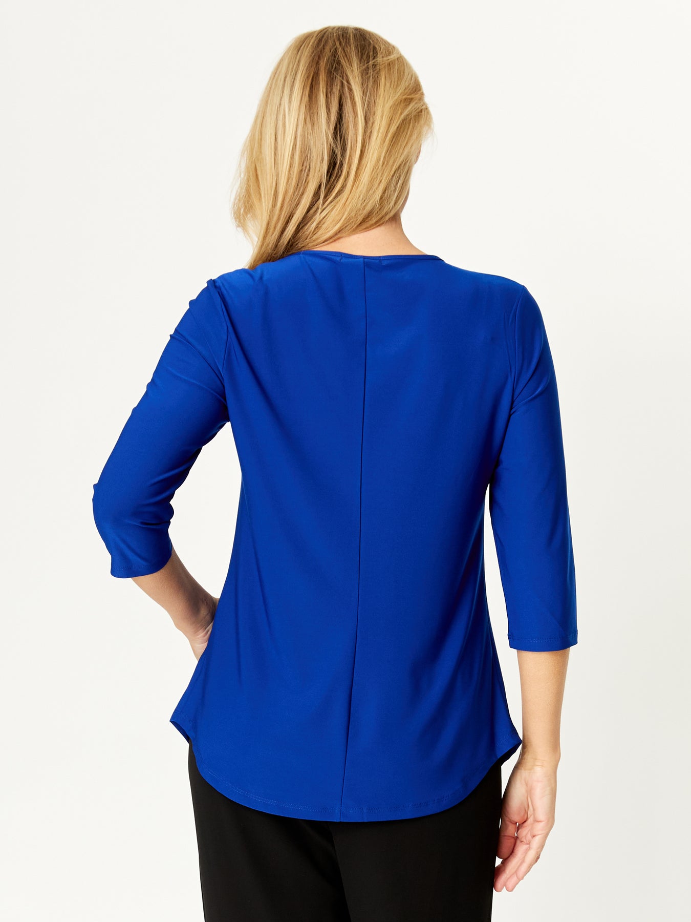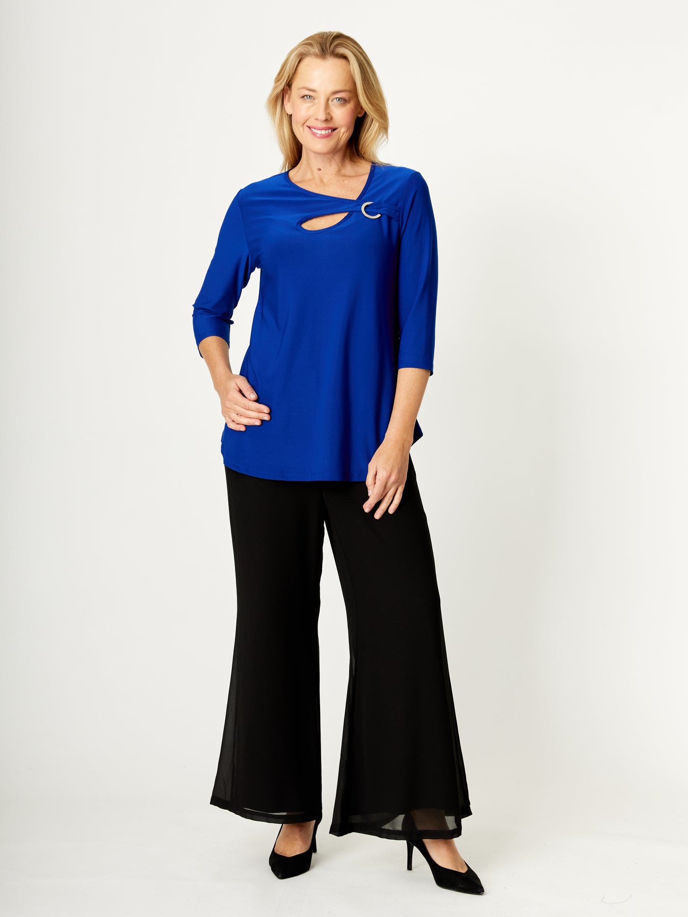 This stylish ring top features elegant 3/4 sleeves and a unique cut-out detail with a ring trim, crafted from a soft, comfortable jersey fabric. Perfect for dressing up effortlessly, it combines modern design with everyday ease to elevate your wardrobe.