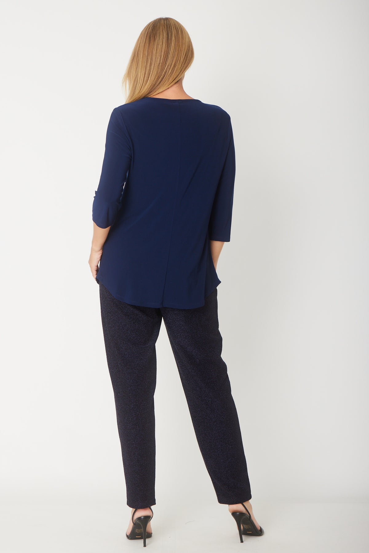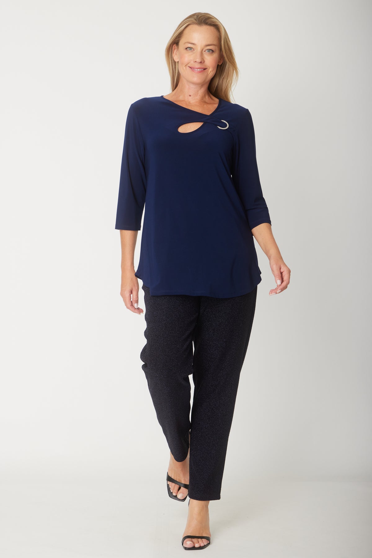 This stylish ring top features elegant 3/4 sleeves and a unique cut-out detail with a ring trim, crafted from a soft, comfortable jersey fabric. Perfect for dressing up effortlessly, it combines modern design with everyday ease to elevate your wardrobe.
