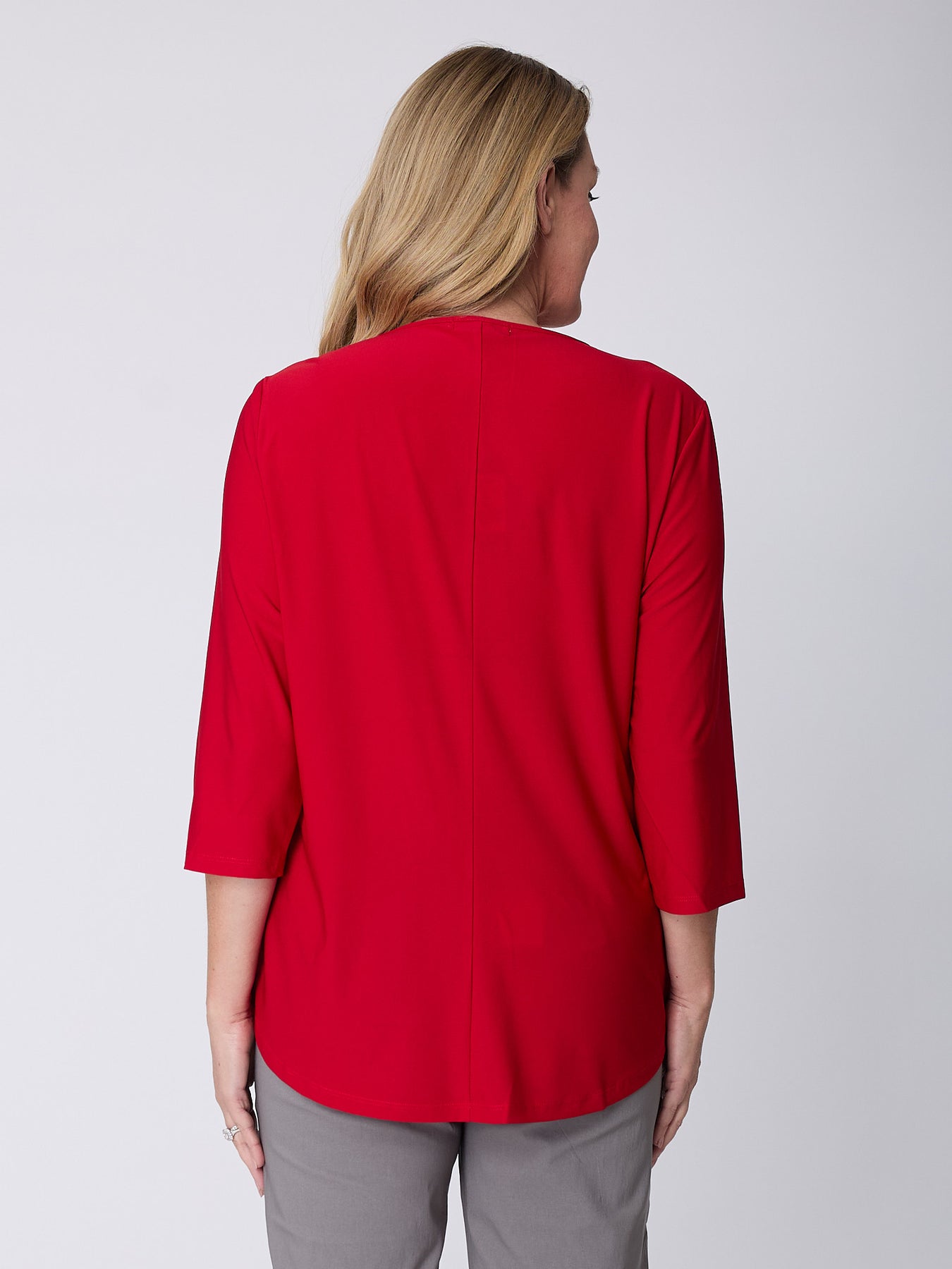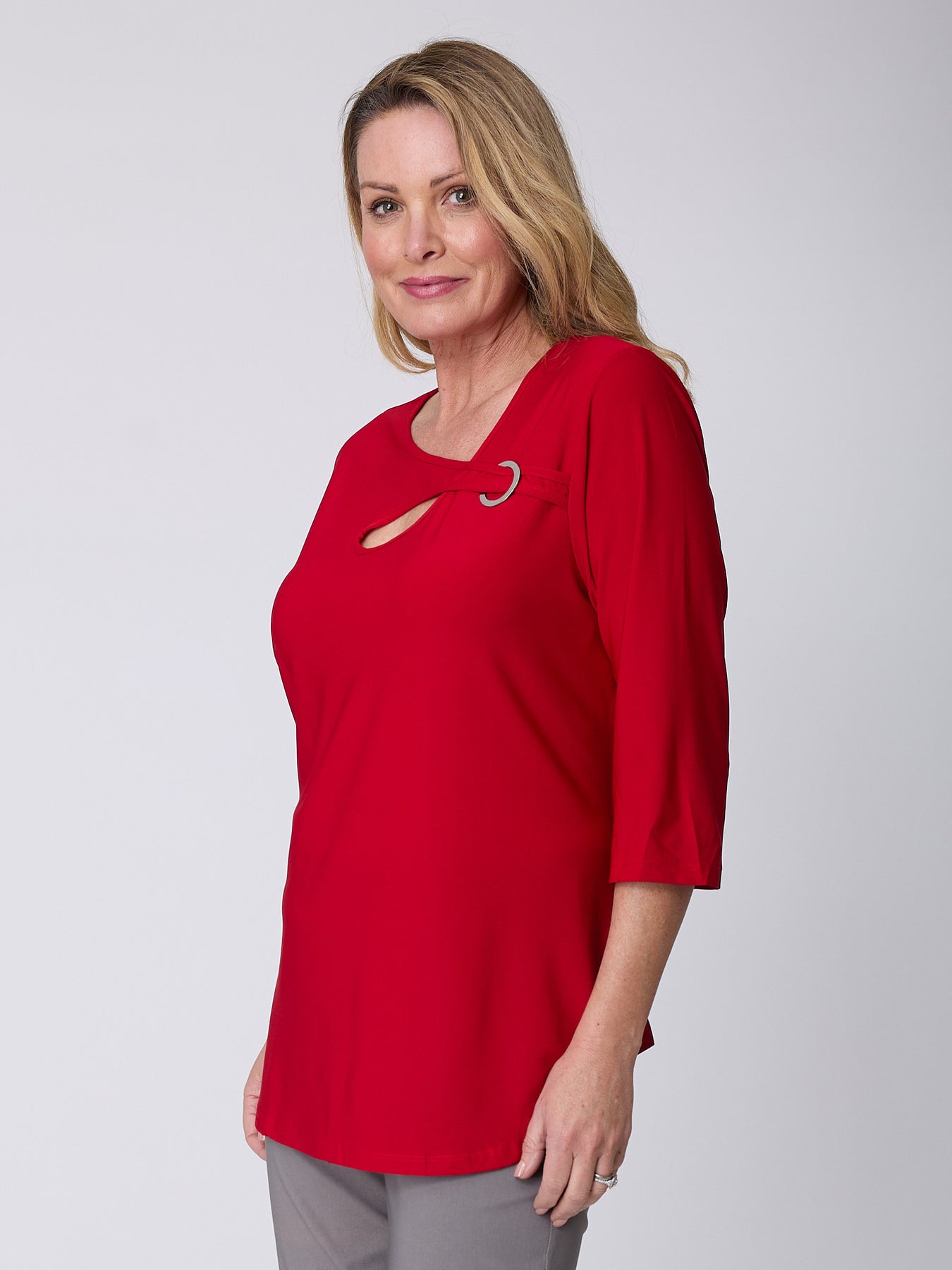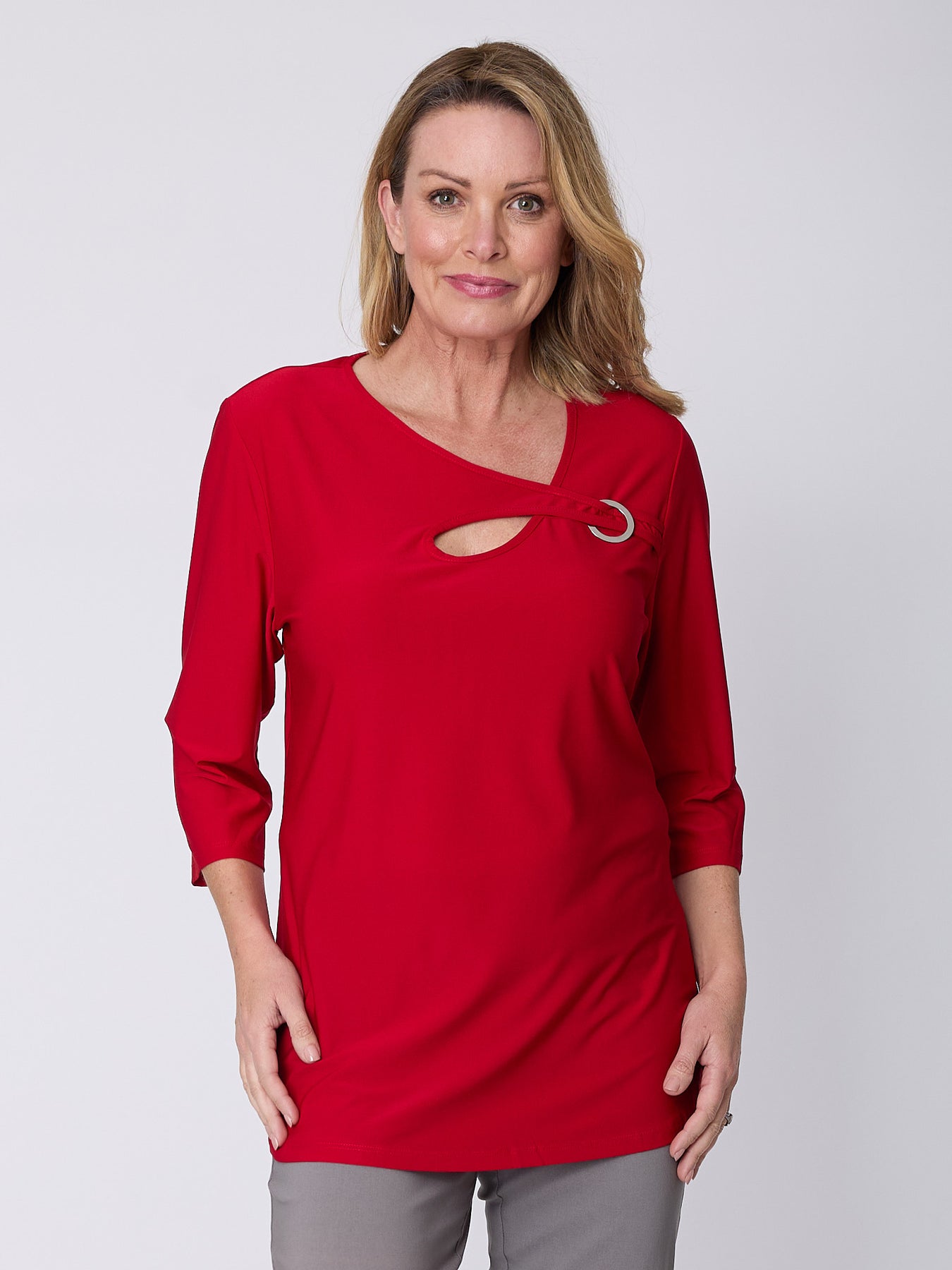This stylish ring top features elegant 3/4 sleeves and a unique cut-out detail with a ring trim, crafted from a soft, comfortable jersey fabric. Perfect for dressing up effortlessly, it combines modern design with everyday ease to elevate your wardrobe.