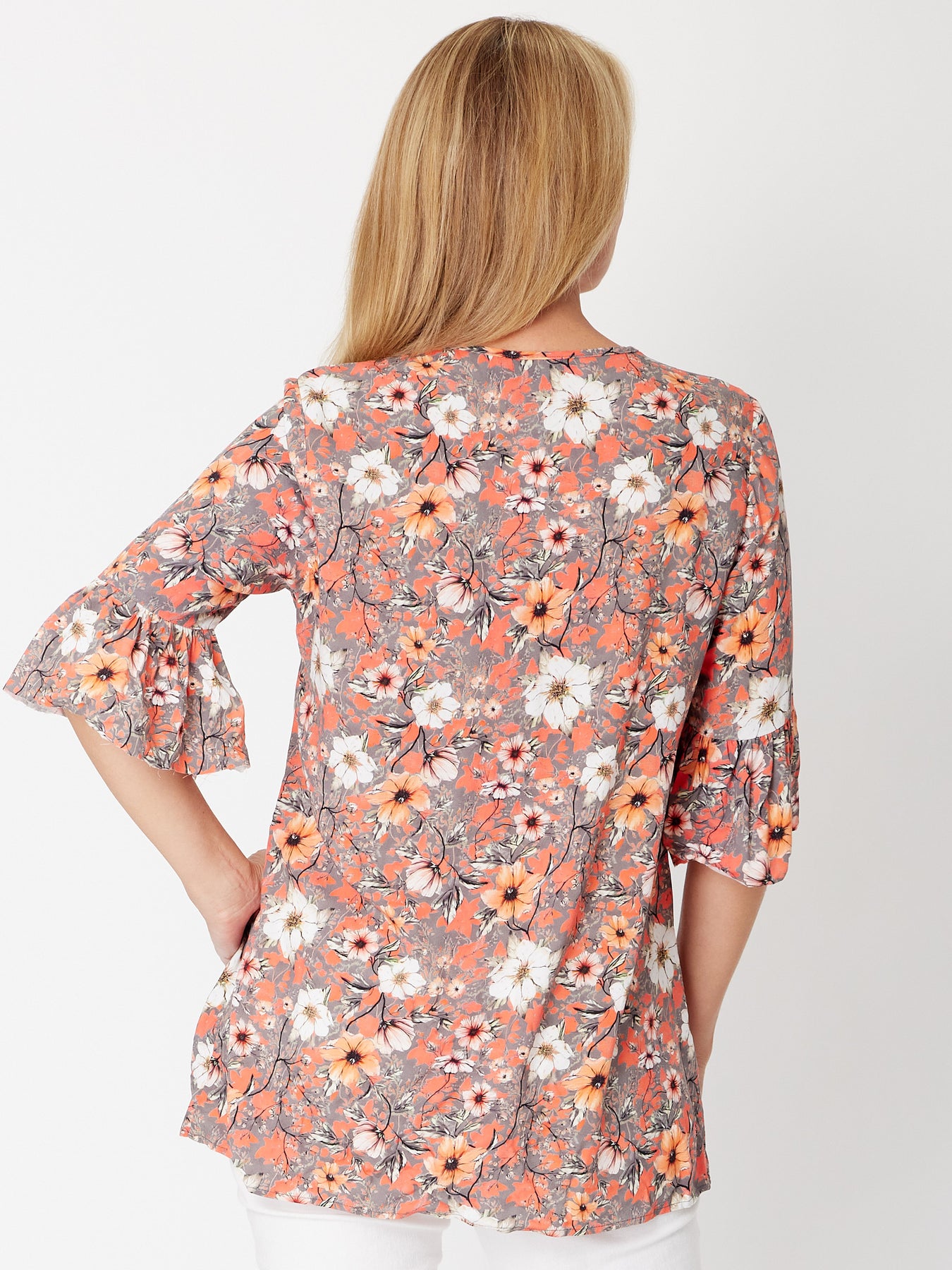 The Tropicana Top offers a relaxed, longer-line fit with a flattering vee neckline and soft ruffled 3/4 sleeves. Crafted from cool rayon, it keeps you comfortable and stylish, perfect for warm days. Easy to care for with cold hand wash, this tunic combines effortless elegance with lightweight breathability.