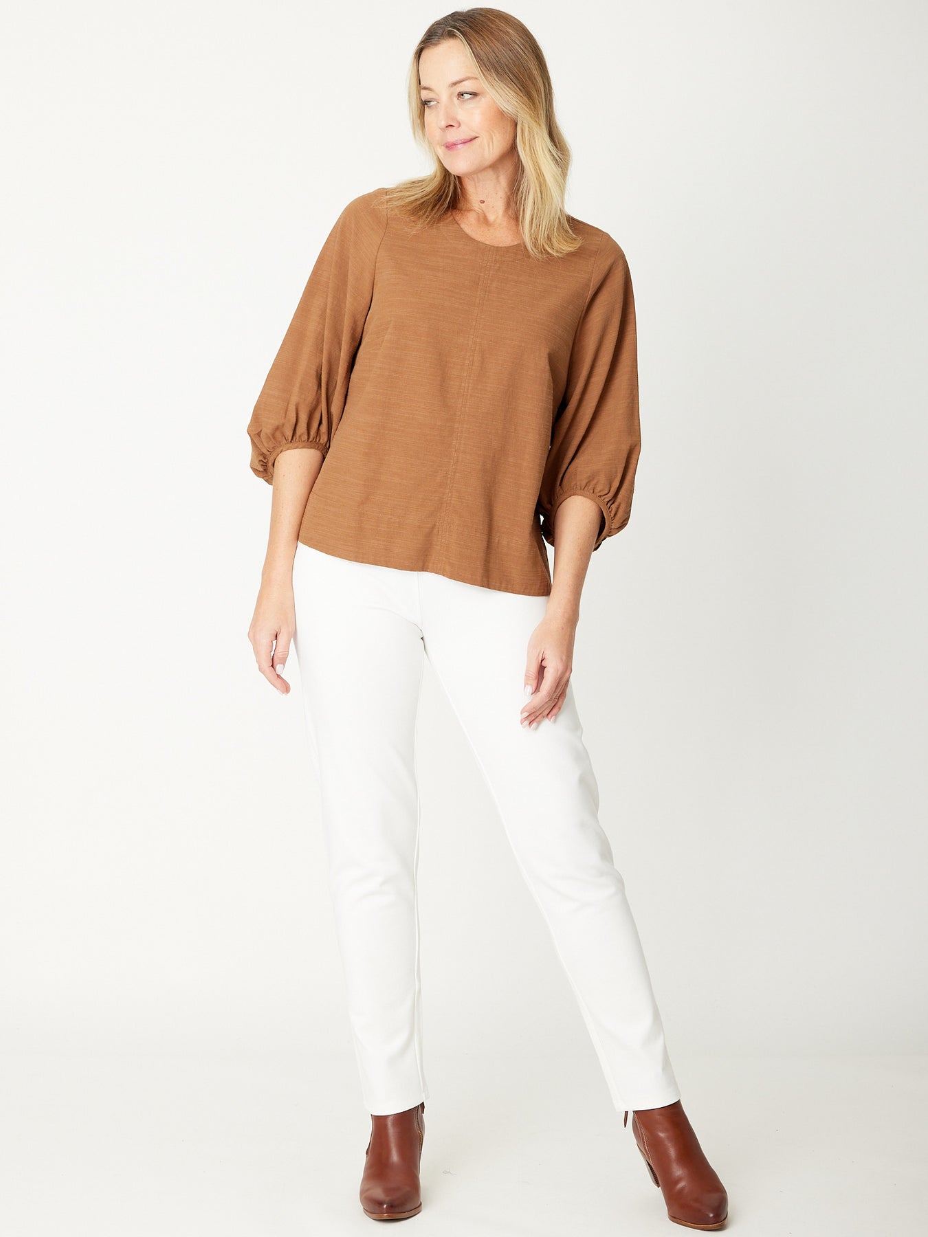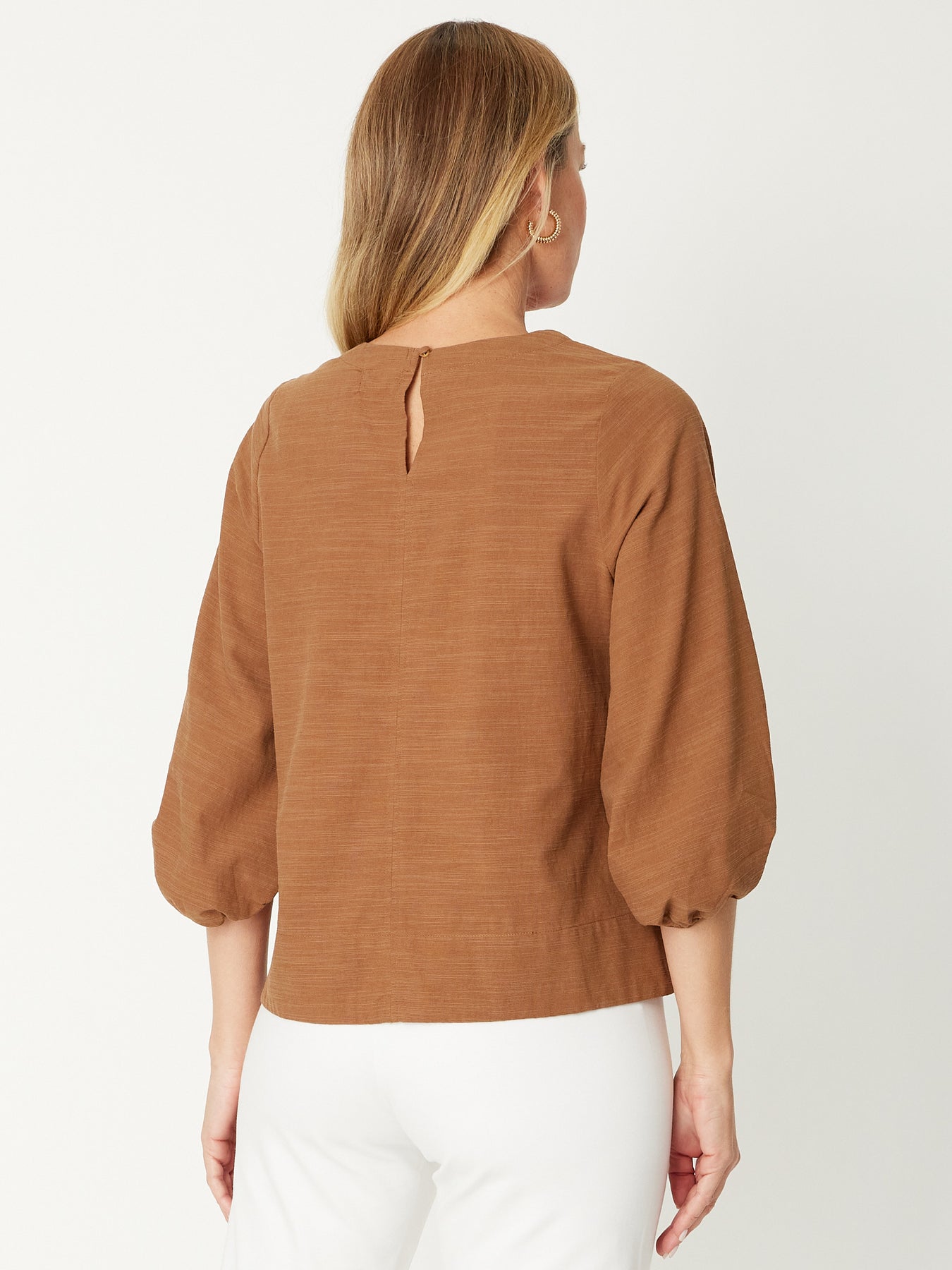 Experience style and comfort with our Core Balloon Sleeve Top! Made from a cotton linen blend, this top features a relaxed elastic cuff and a round neck, making it perfect for any season. Elevate your wardrobe with our fashion-forward 3/4 sleeve design.