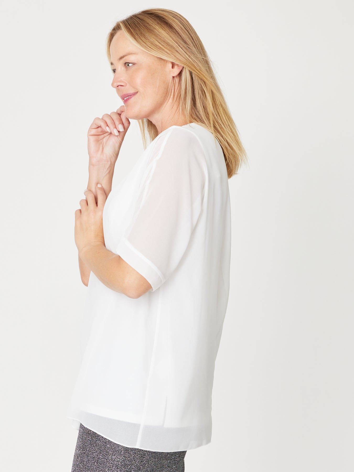 Elevate your wardrobe with the Gilliana Chiffon Overlay Core Top. Featuring a softly lined chiffon bodice, a flattering scoop neck, and elegant mid-length sleeves, this top effortlessly transitions from day to night. Perfect layered under jackets for a polished office look or styled solo for an evening out, it combines comfort with timeless sophistication.