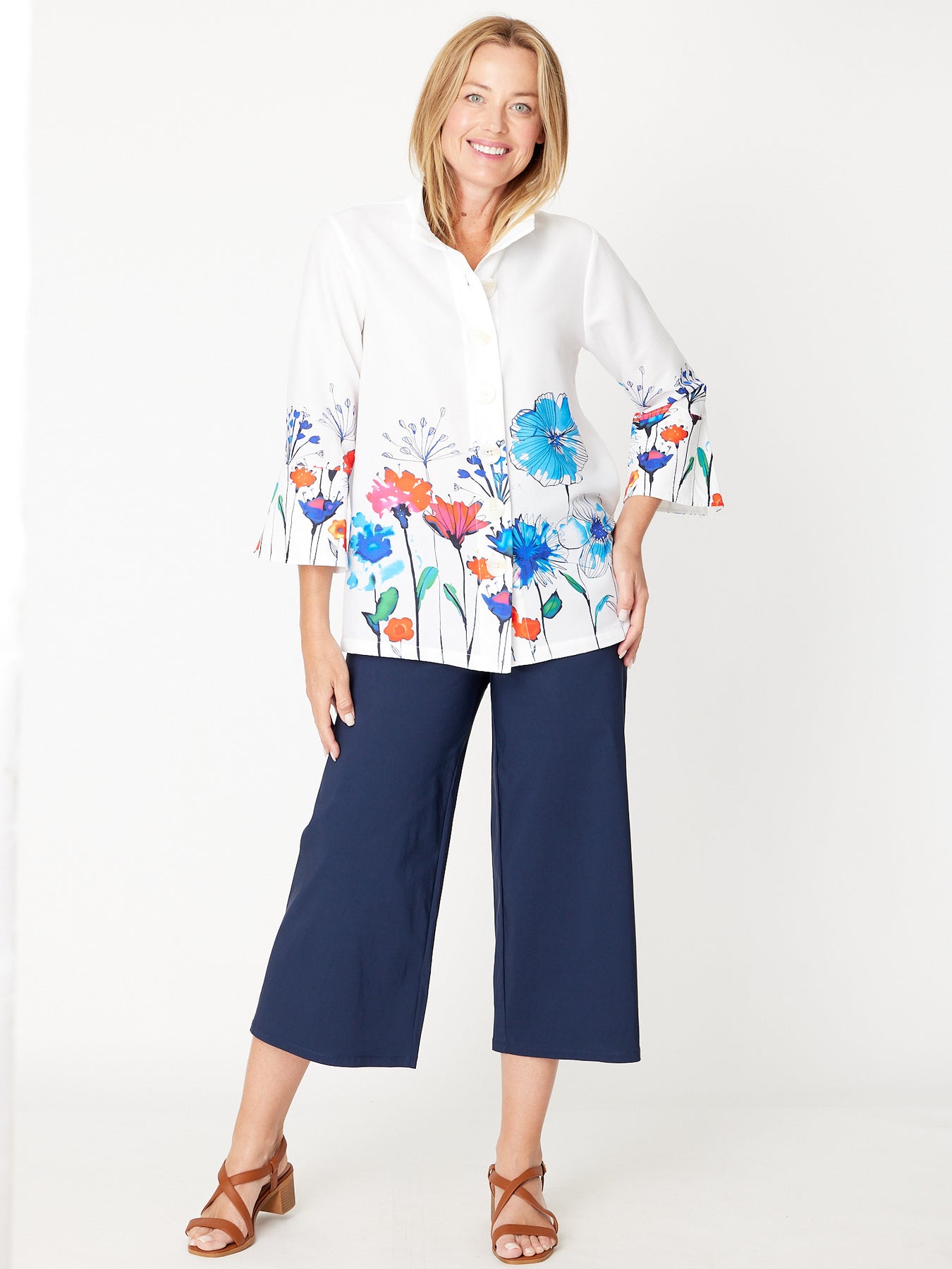 This fun printed 3/4 sleeve shirt features a soft wire in the collar that allows it to stand gently for a flattering shape. Designed with a versatile button-through front, it can be worn as a shirt or lightweight jacket. The textured fabric adds subtle interest, while the longer length offers comfortable coverage over the hips. Perfect for layering or wearing on its own, it combines style and function effortlessly.