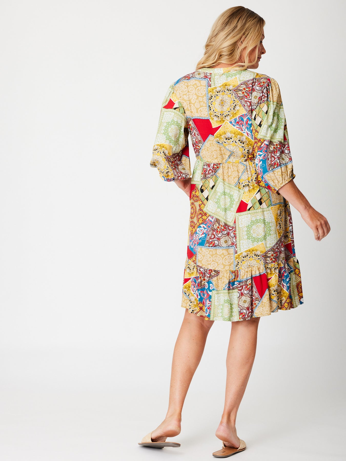 The Sandy Shores Rayon Dress offers a flattering V-neck and a functional drawstring waist for a perfect, adjustable fit. Its 3/4 puff sleeves with elastic trims add a soft, feminine touch, while practical side pockets enhance convenience. The playful frill hem brings an elegant flirtiness, making this non-stretch, true-to-size dress ideal for stylish comfort and effortless charm.