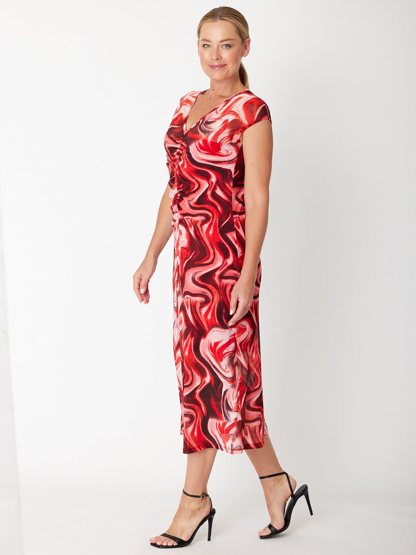 Elevate your wardrobe with the Mavi Stretch Mesh Dress in Black and Red. This midi-length dress features a cap sleeve design and a flattering ruched neckline that enhances your silhouette. Crafted from micropleated mesh with a fully lined bodice, it offers both comfort and a sophisticated layered look. Perfect for occasions where style meets ease, this dress combines stretch fabric with delicate textures for a truly captivating fit.