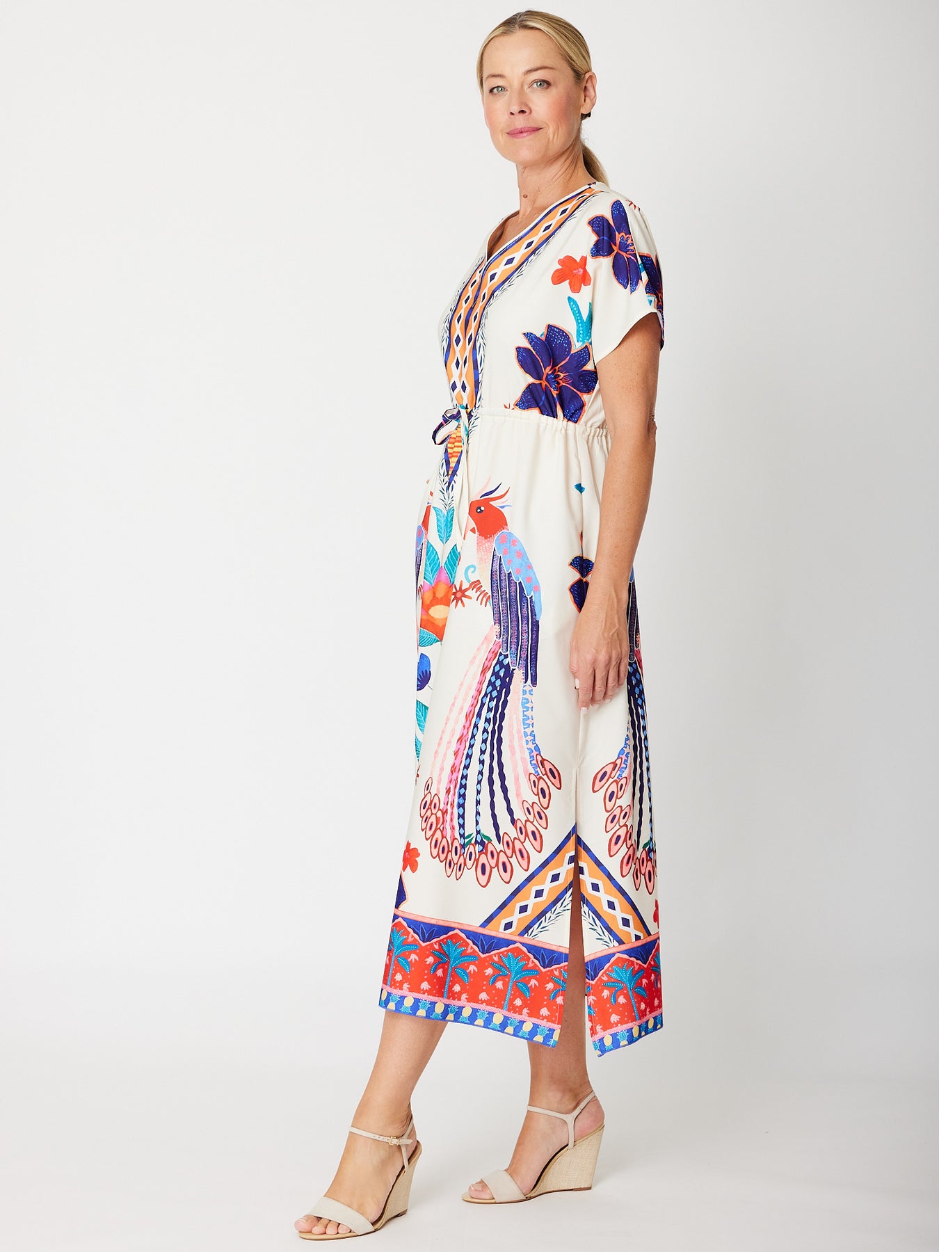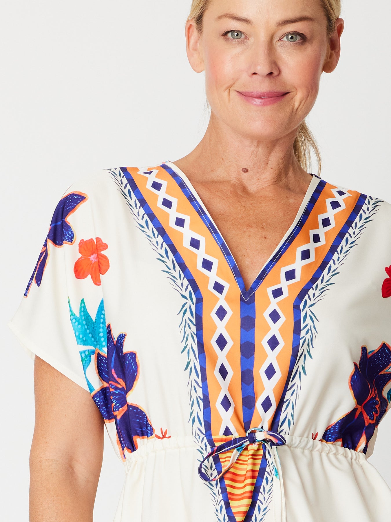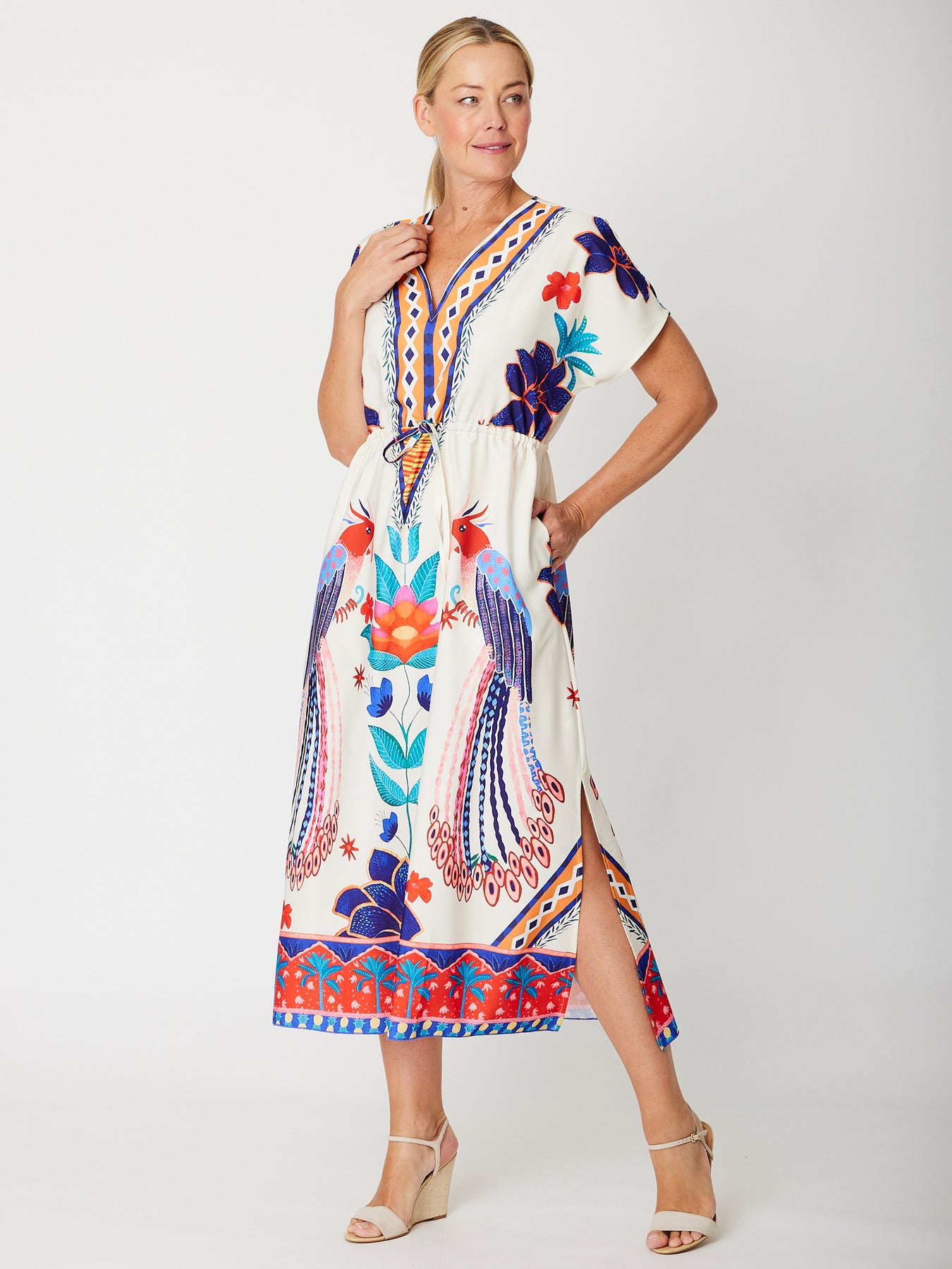 This Placement Print Kimono Dress features a stunning print, a flattering V-neck, and cap sleeves for effortless style. The functional drawstring lets you personalise the fit, while side splits and handy pockets add both comfort and practicality. Perfect for stylish, everyday wear.