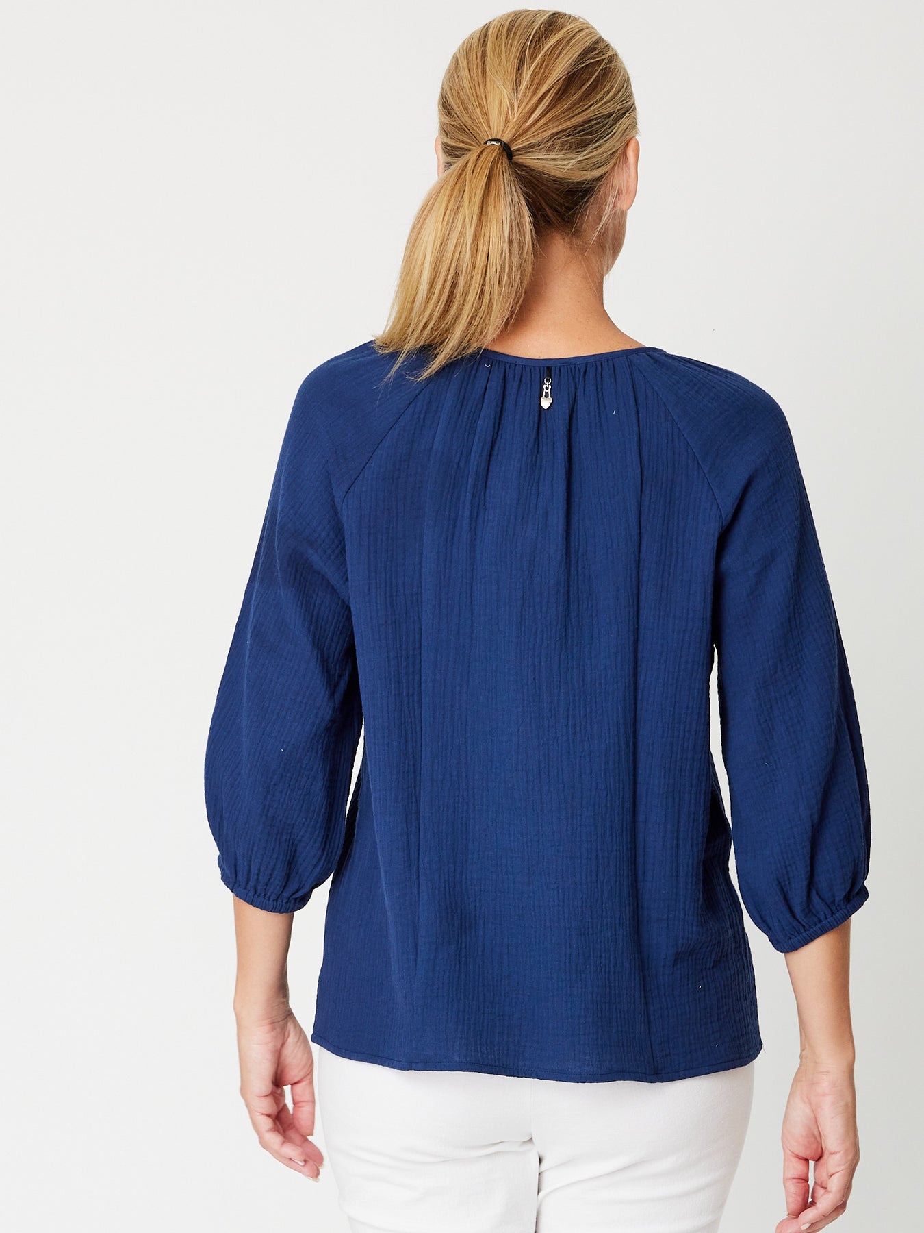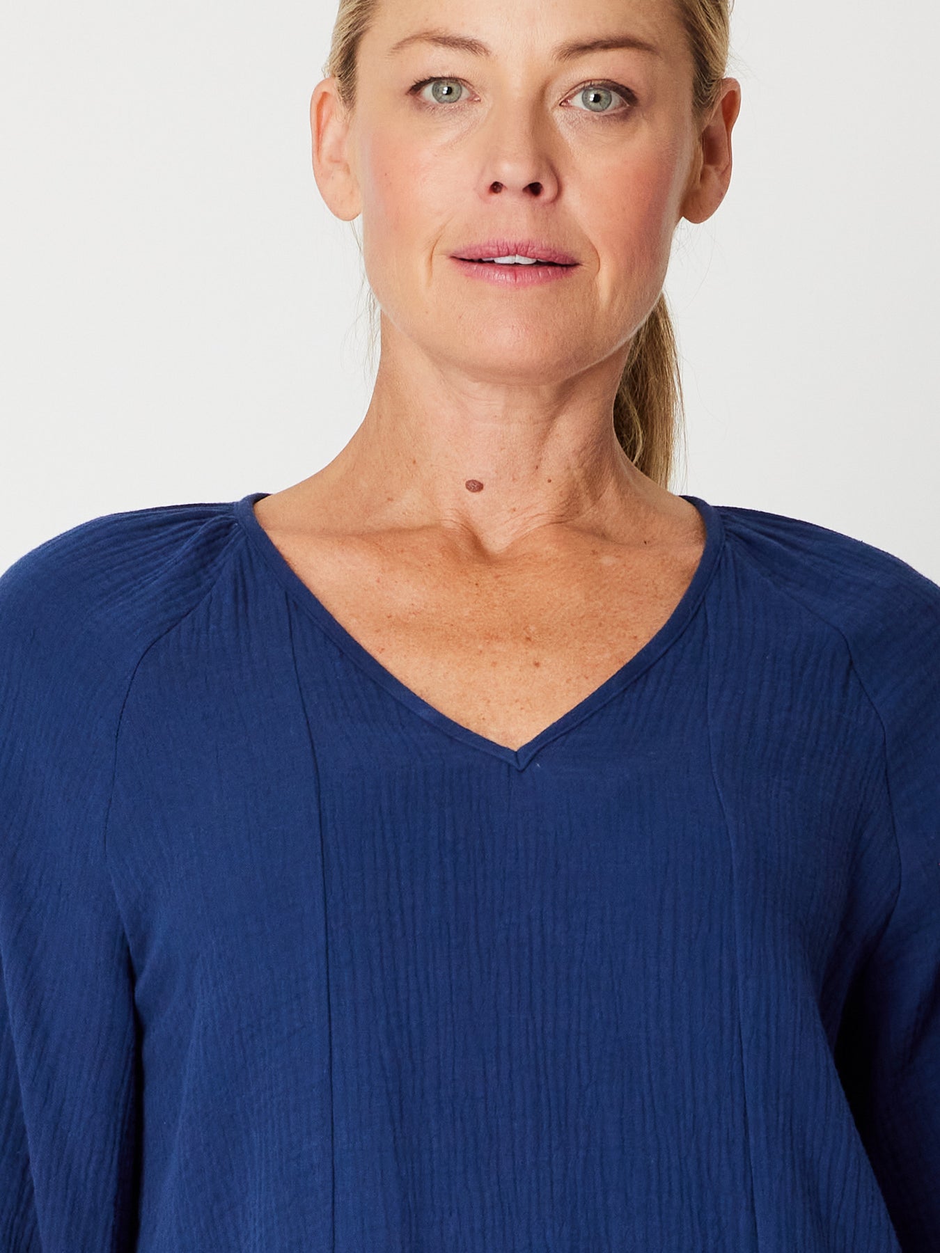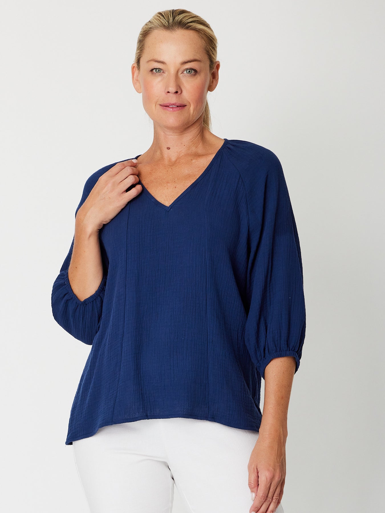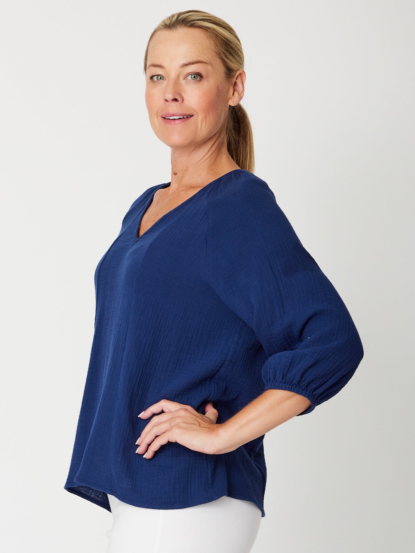 Effortlessly chic and undeniably comfortable, this bubble cotton top features a flattering V-neckline and relaxed 3/4 sleeves finished with a soft self-cuff. The lightweight cheesecloth blend drapes beautifully while maintaining its shape, making it an ideal layering piece or standalone essential. Perfect for casual days when you want style without compromise.