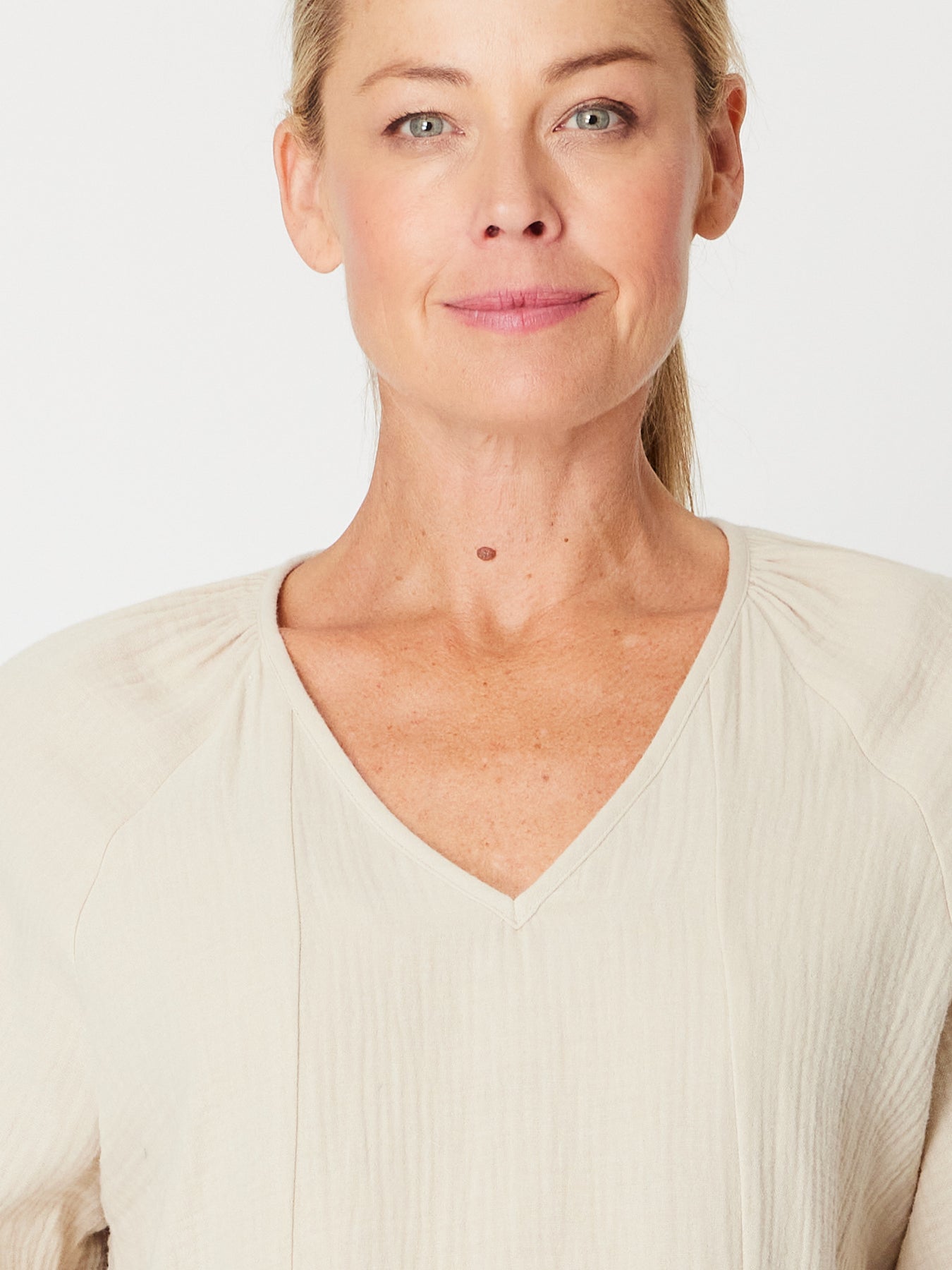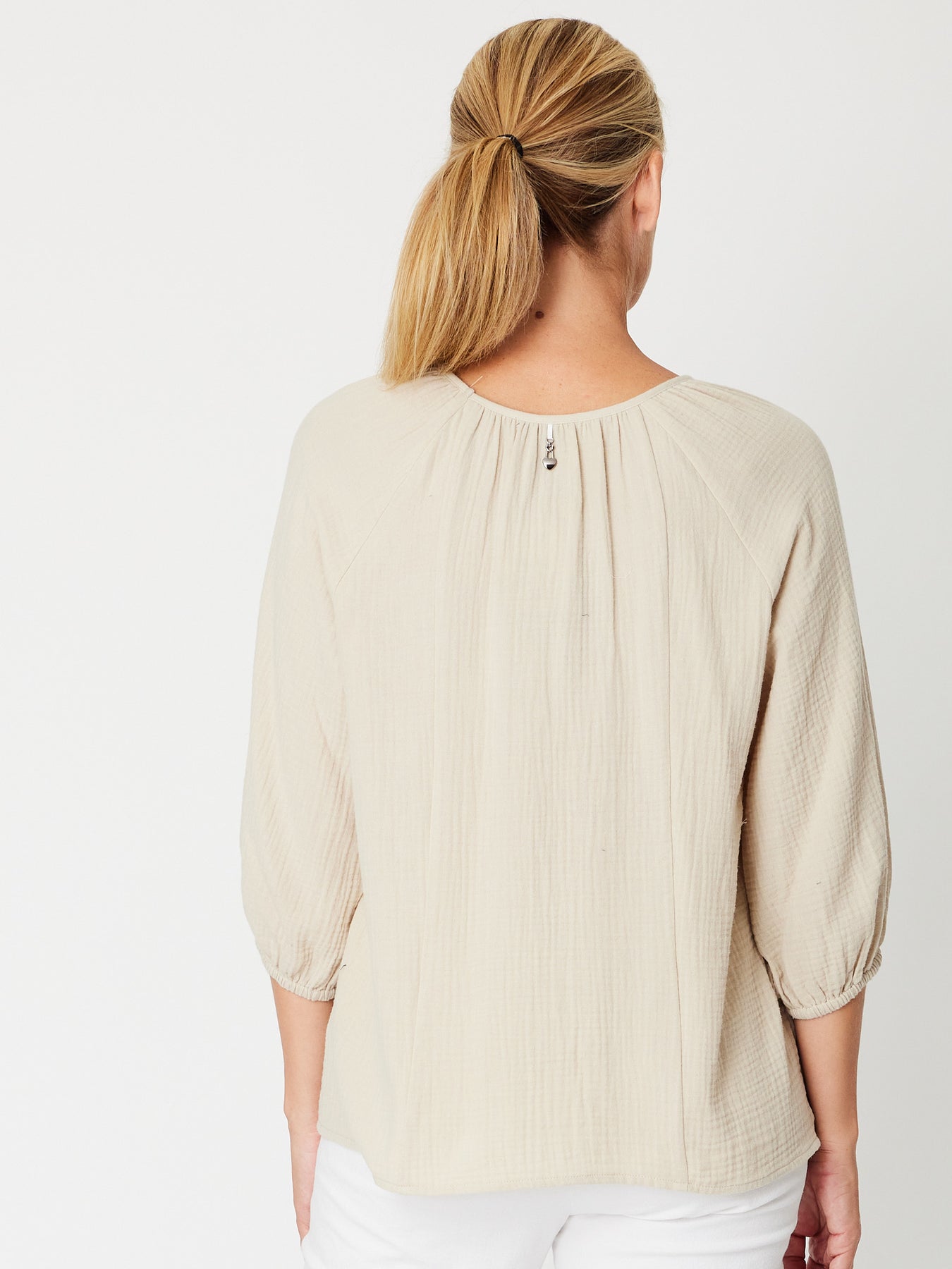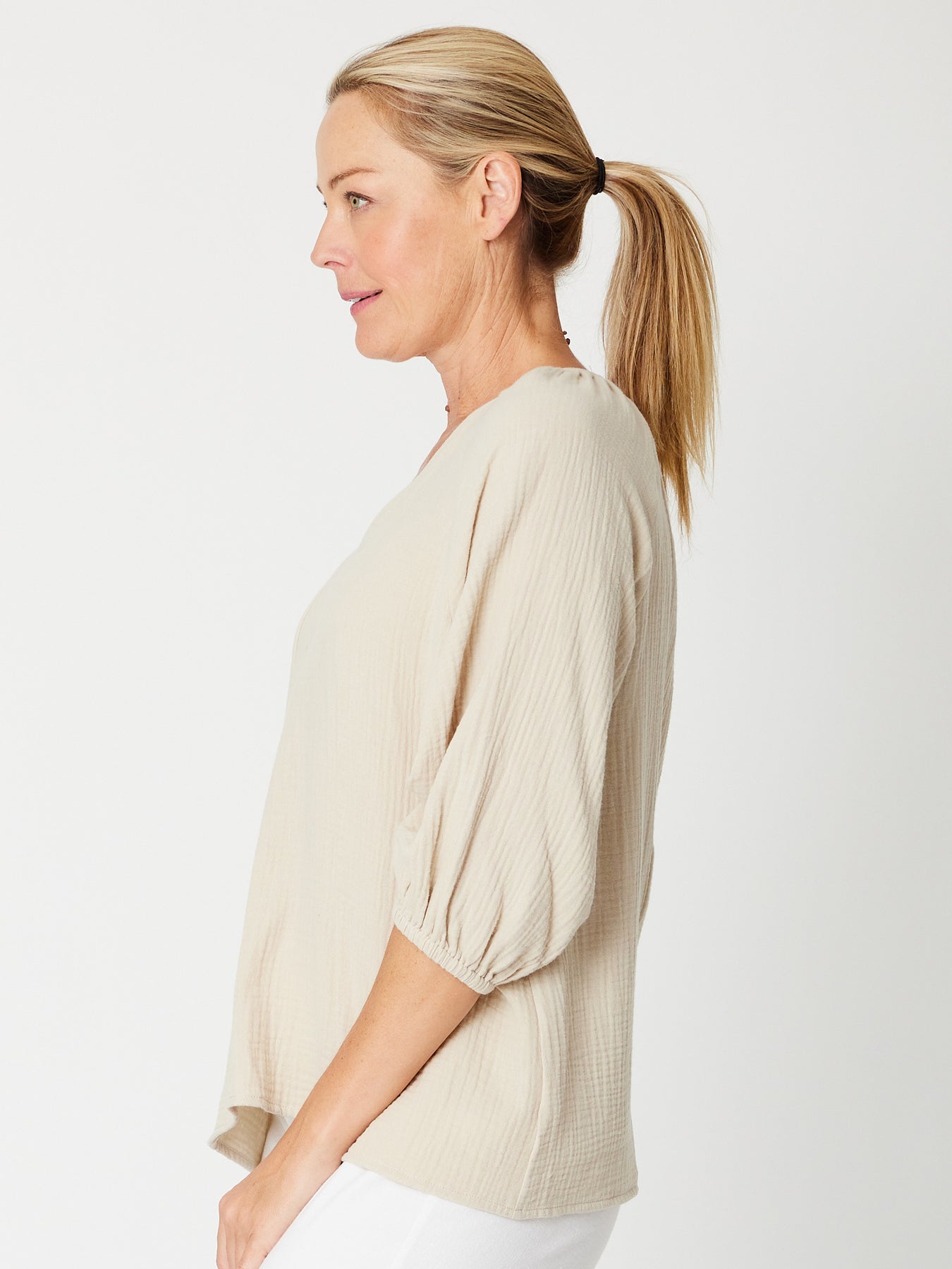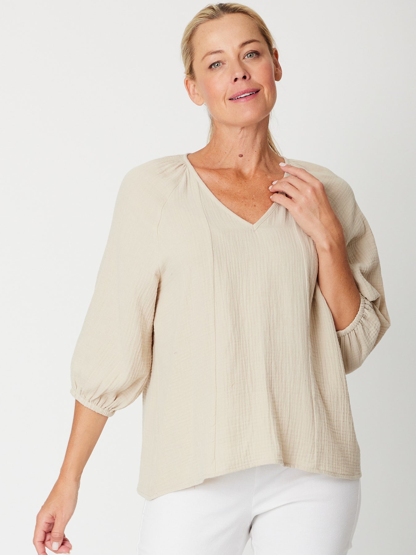 Effortlessly chic and undeniably comfortable, this bubble cotton top features a flattering V-neckline and relaxed 3/4 sleeves finished with a soft self-cuff. The lightweight cheesecloth blend drapes beautifully while maintaining its shape, making it an ideal layering piece or standalone essential. Perfect for casual days when you want style without compromise.