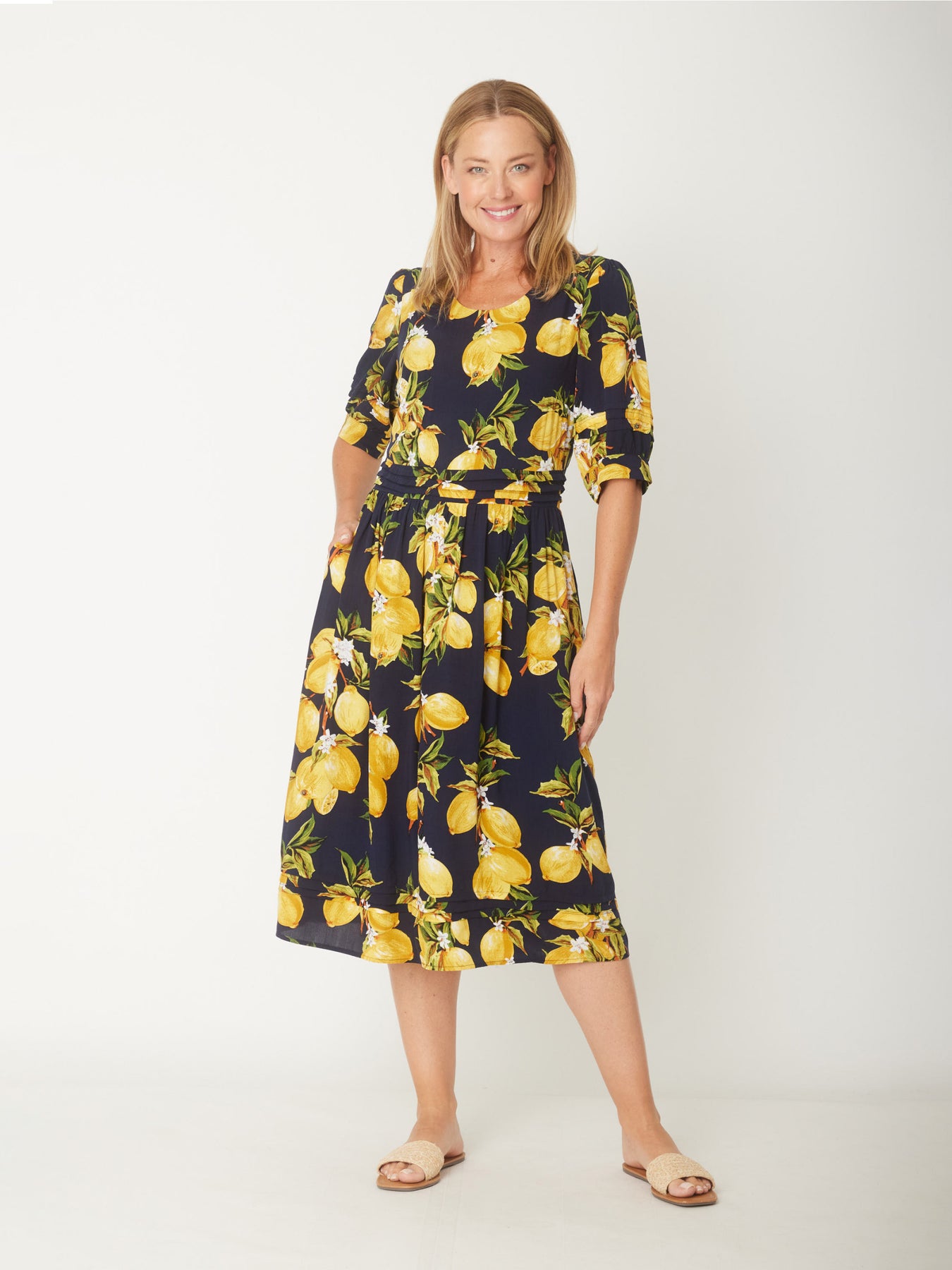 This Lemon Midi Dress in Navy and Lemon offers a flattering scoop neck and sophisticated pleated details on puff sleeves, waist, and hem for refined style. Made from structured yet comfortable non-stretch rayon, it ensures a polished look with ease. The back zipper provides convenient wear, while the midi length makes it perfect for any occasion. True to size, this dress combines elegance and practicality seamlessly.