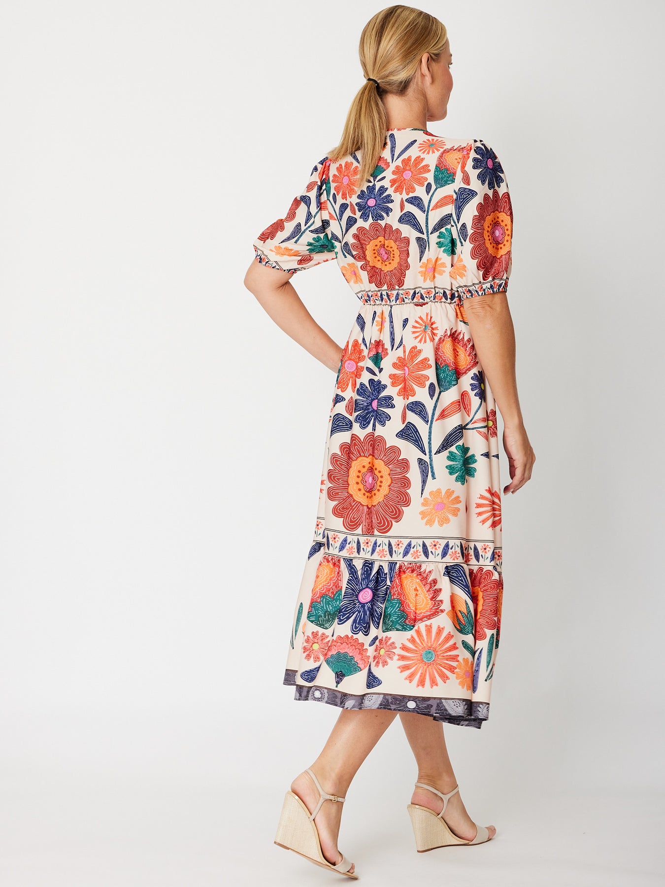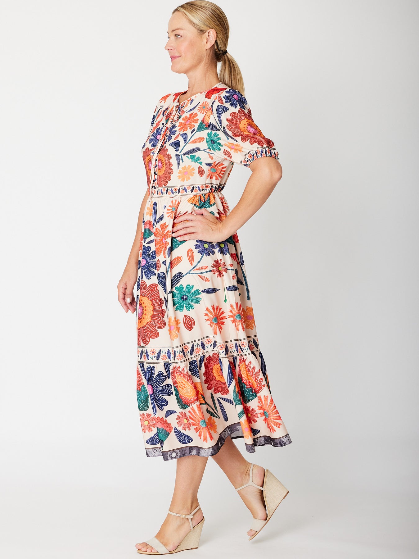 The Prairie Flower Dress offers effortless style with its longer short sleeves and flattering midi length. Crafted from soft rayon, it features a unique tie-neck detail that adds a touch of elegance to your look. Designed to fit true to size,  Buy your  bust measurement  for the perfect fit as the fabric is non-stretch. This dress easily transitions from day to night, making it a standout choice for your wardrobe.