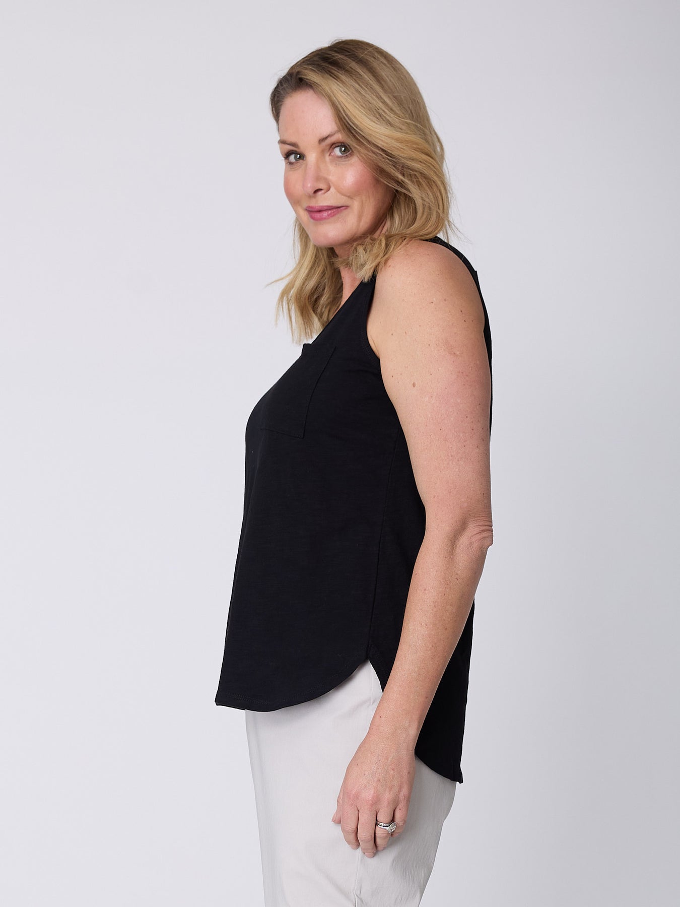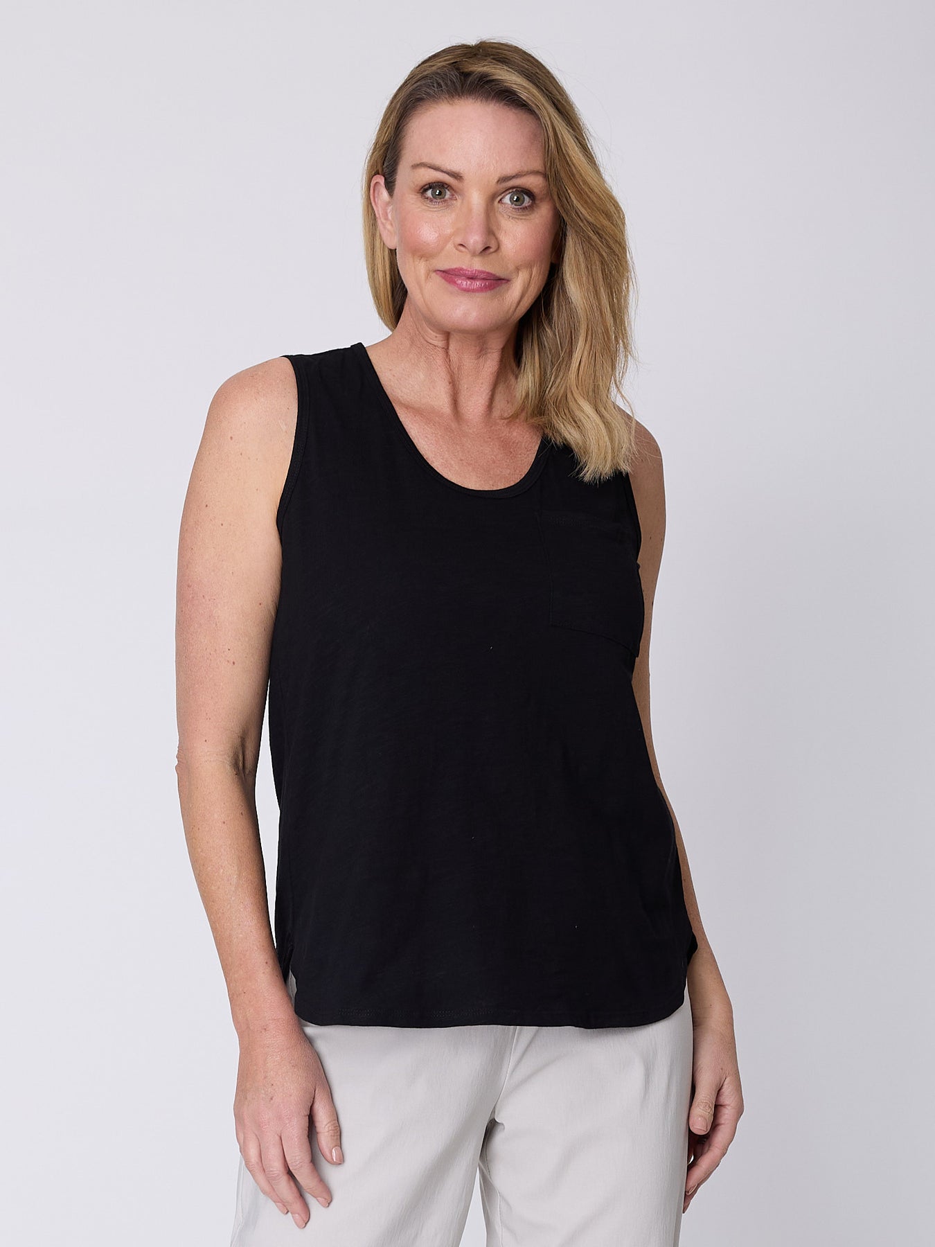 This sleeveless Textured Cami combines breathable slub cotton with a touch of stretch for all-day comfort and a flattering fit. Its bra-friendly design and scooped hemline offer effortless style, while the cut pocket on the front adds a subtle, practical detail. Perfect for layering or wearing alone, it’s a versatile essential for a fresh, casual look.